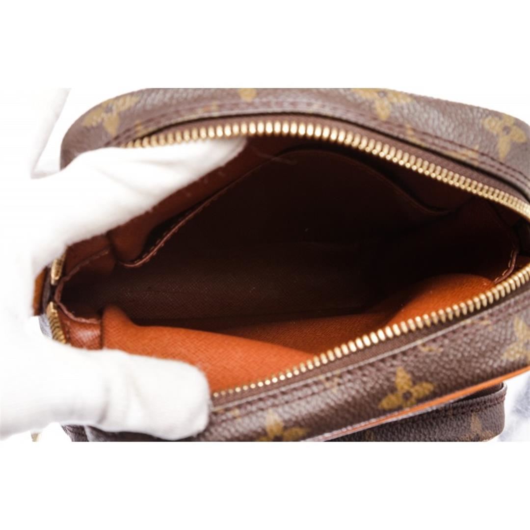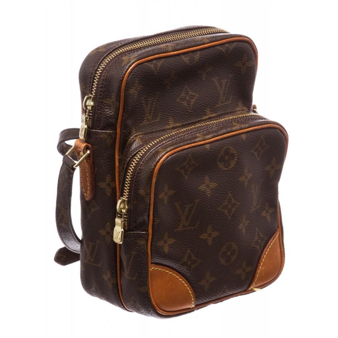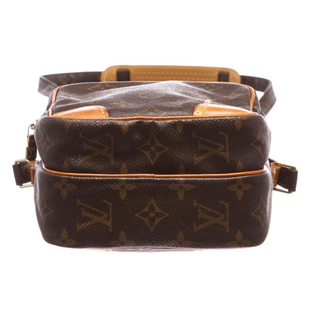 One Louis Vuitton Monogram Canvas Leather Amazon Crossbody Bag. Brown and tan monogram coated canvas Louis Vuitton Amazon bag with brass hardware, tan vachetta leather trim, flat shoulder strap, exterior zip pocket, brown leather lining and zip closure at top. Item is pre-owned.