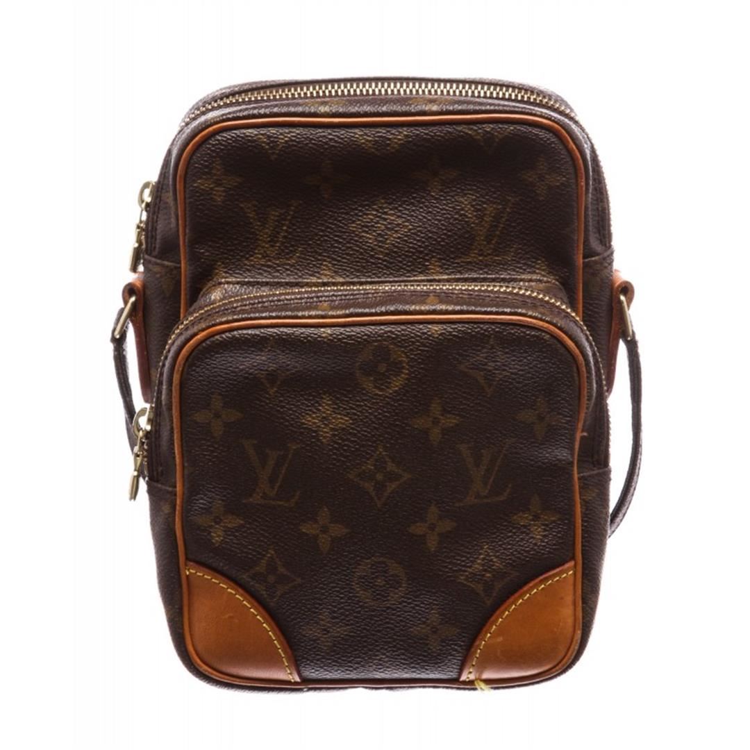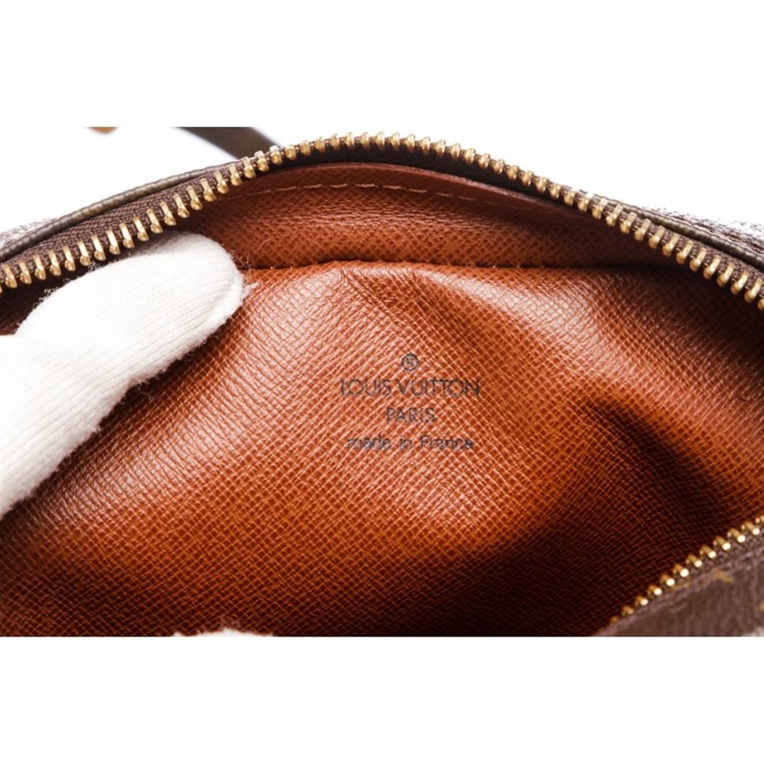 One Louis Vuitton Monogram Canvas Leather Amazon Crossbody Bag. Brown and tan monogram coated canvas Louis Vuitton Amazon bag with brass hardware, tan vachetta leather trim, flat shoulder strap, exterior zip pocket, brown leather lining and zip closure at top. Item is pre-owned.