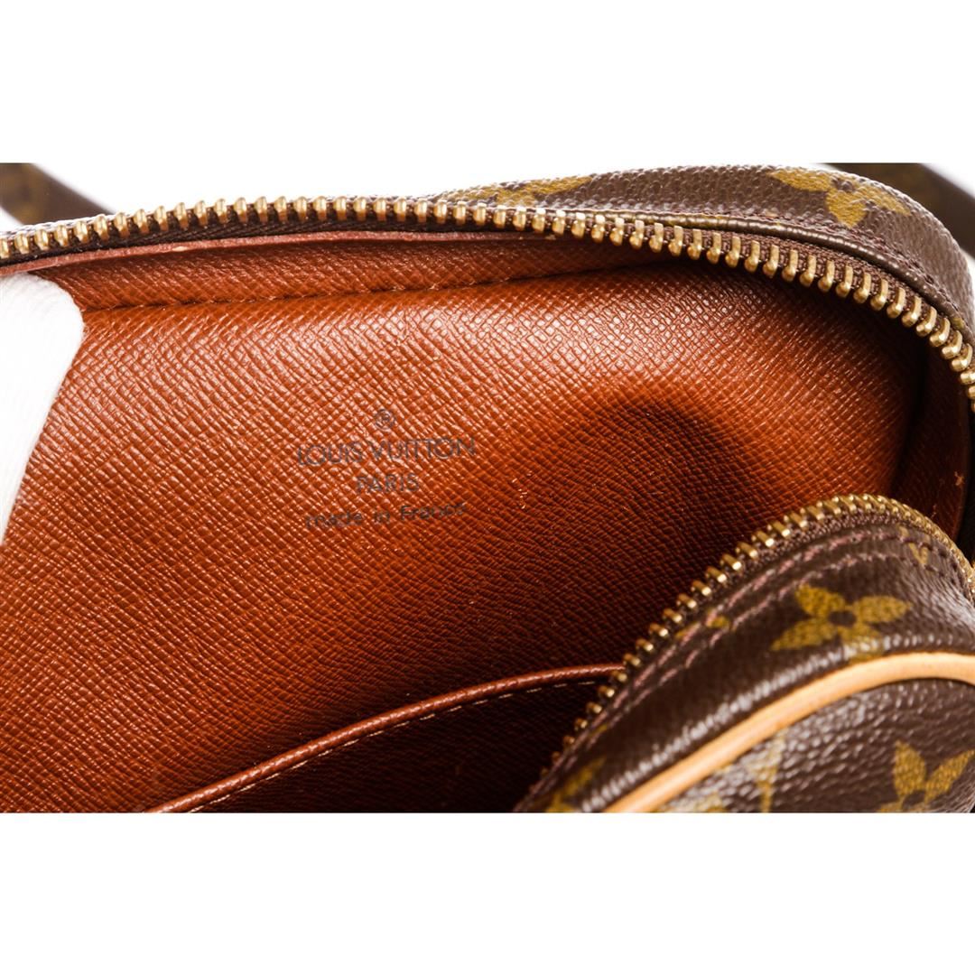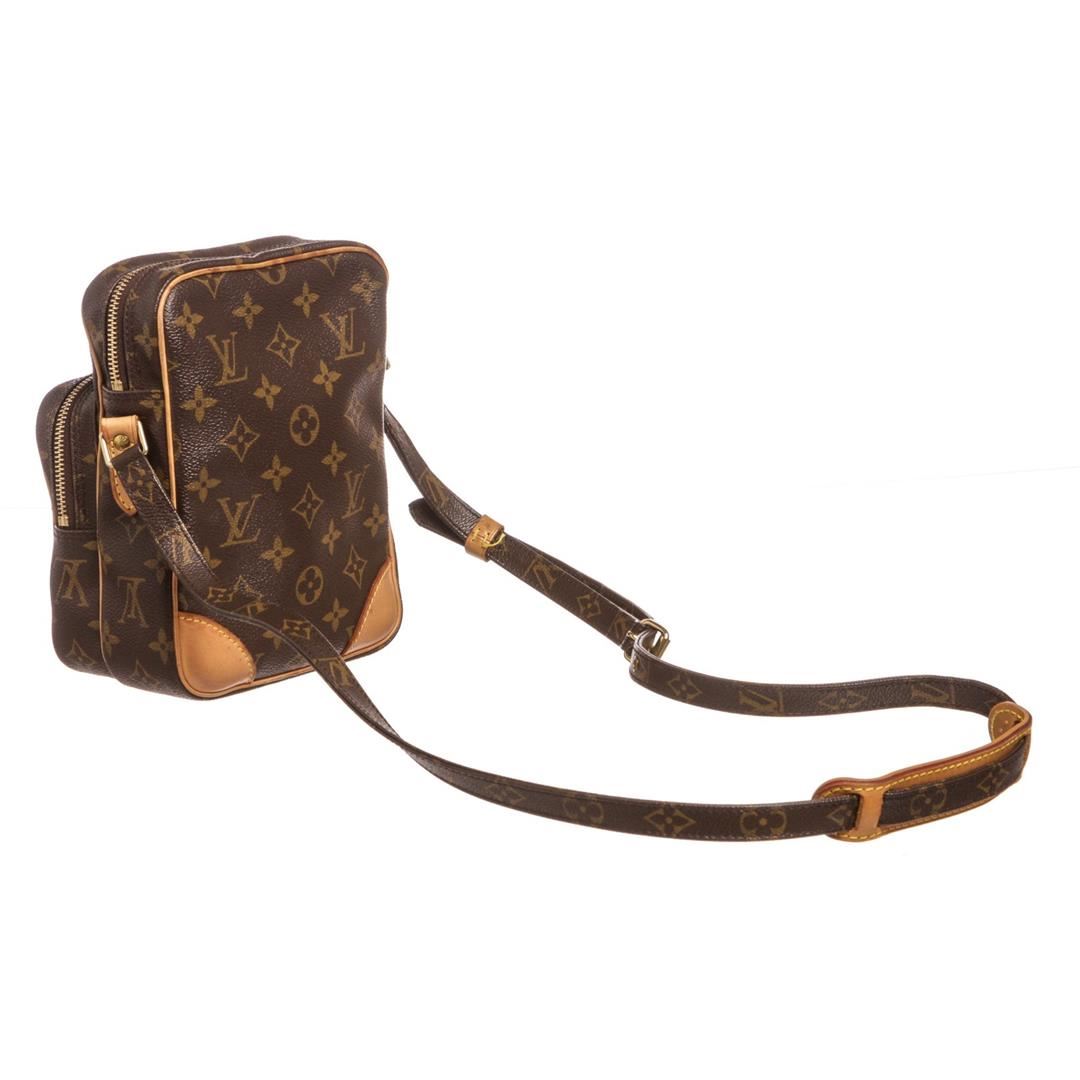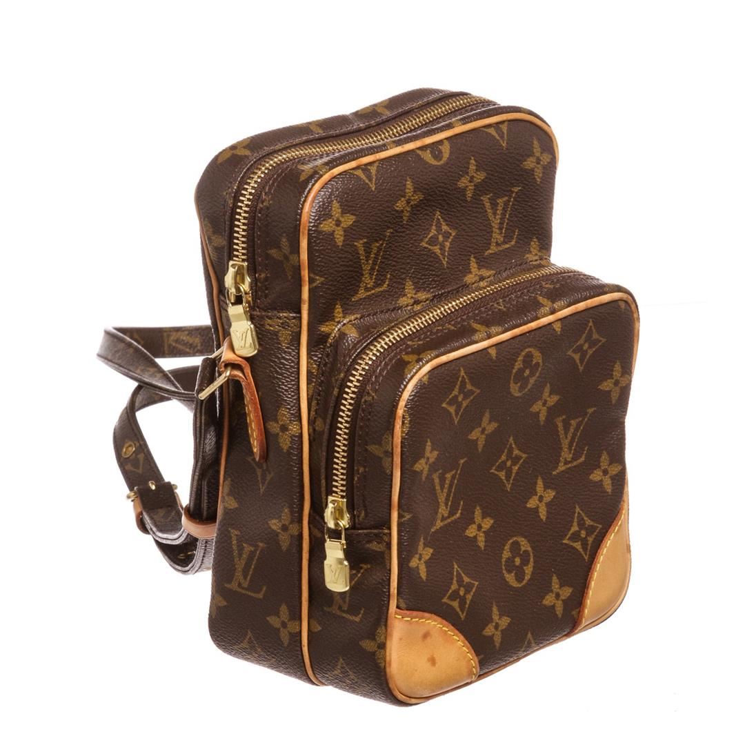Brown and tan monogram coated canvas Louis Vuitton Amazon bag with brass hardware, tan vachetta leather trim, flat shoulder strap, exterior zip pocket, brown leather lining and zip closure at top. Item is pre-owned.