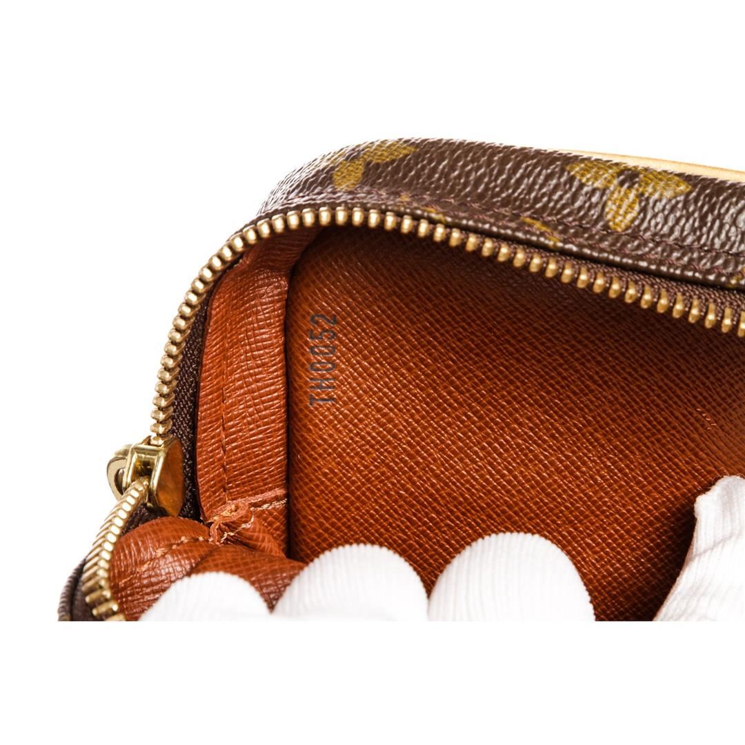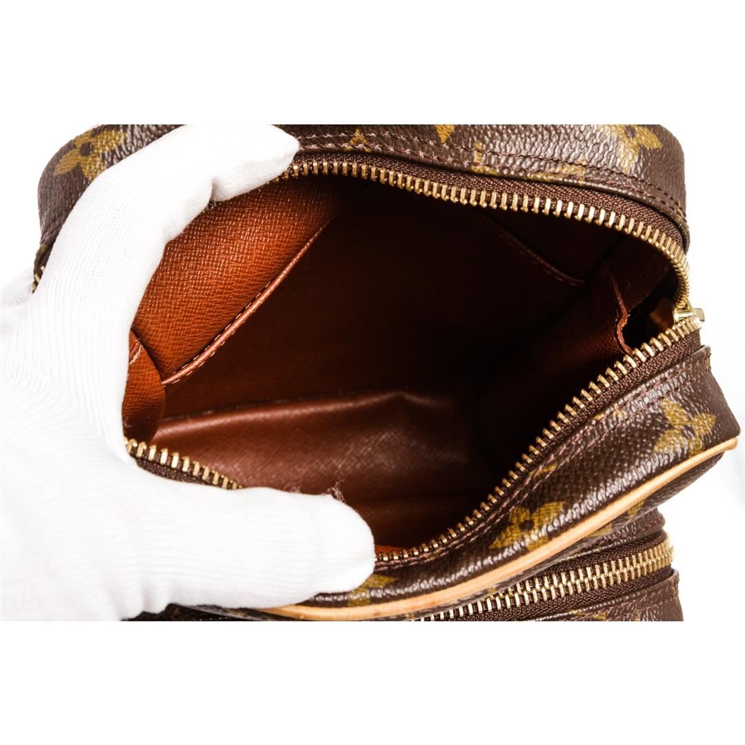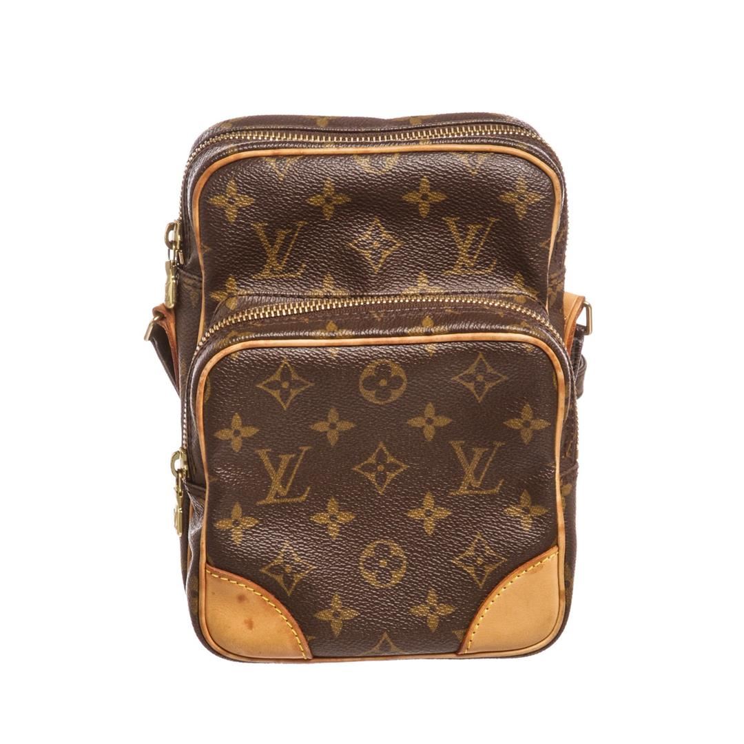 Brown and tan monogram coated canvas Louis Vuitton Amazon bag with brass hardware, tan vachetta leather trim, flat shoulder strap, exterior zip pocket, brown leather lining and zip closure at top. Item is pre-owned.