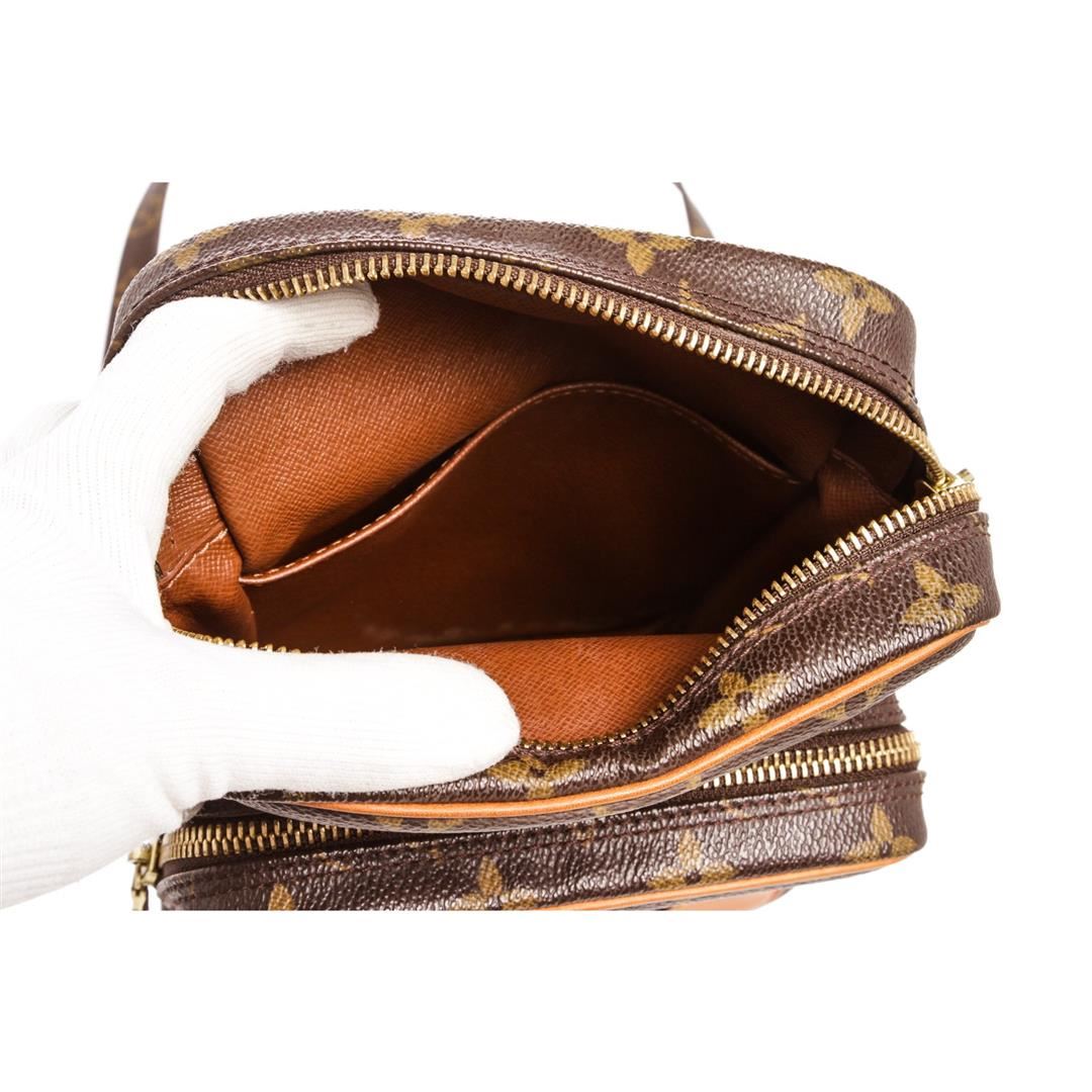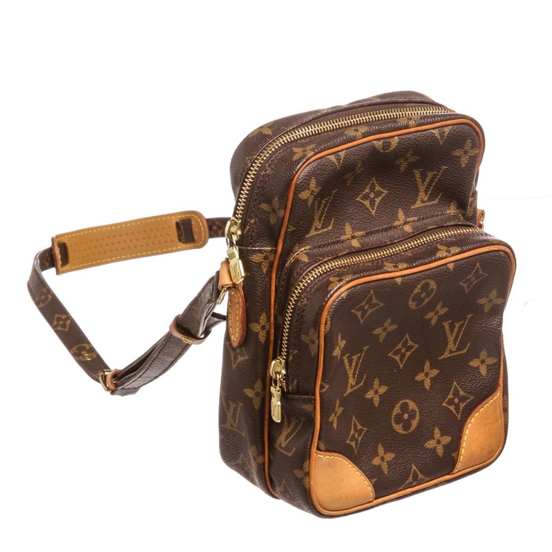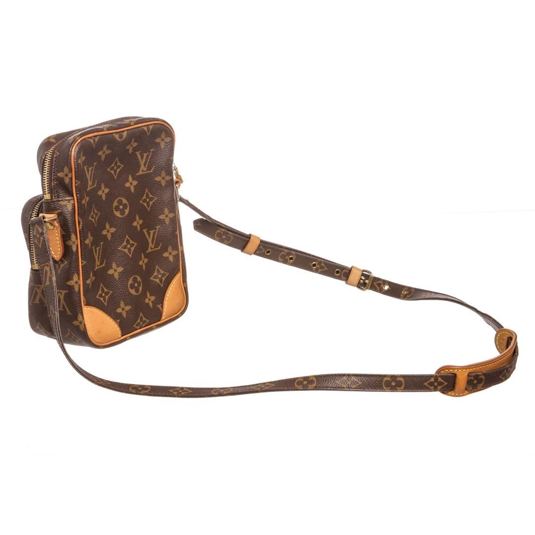 Brown and tan monogram coated canvas Louis Vuitton Amazon bag with brass hardware, tan vachetta leather trim, flat shoulder strap, exterior zip pocket, brown leather lining and zip closure at top. Item is pre-owned.