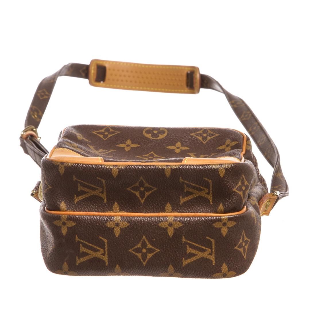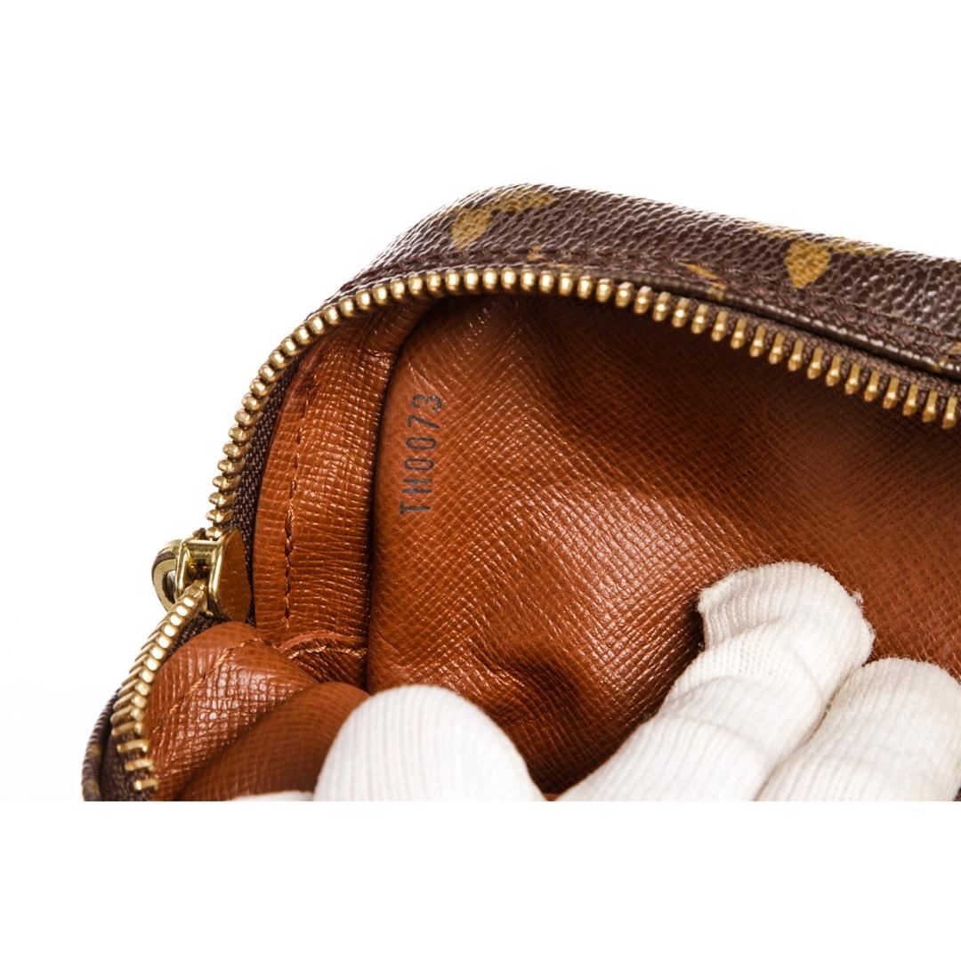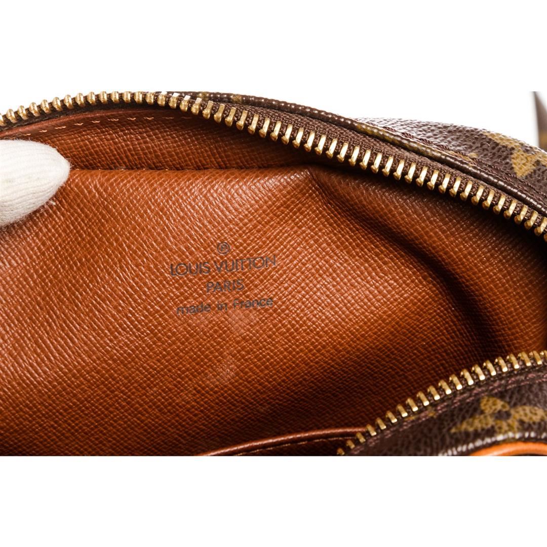 Brown and tan monogram coated canvas Louis Vuitton Amazon bag with brass hardware, tan vachetta leather trim, flat shoulder strap, exterior zip pocket, brown leather lining and zip closure at top. Item is pre-owned.