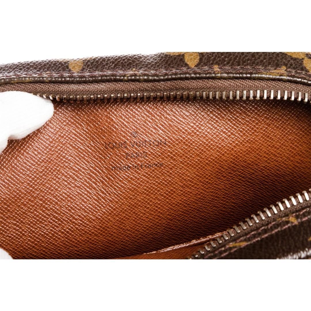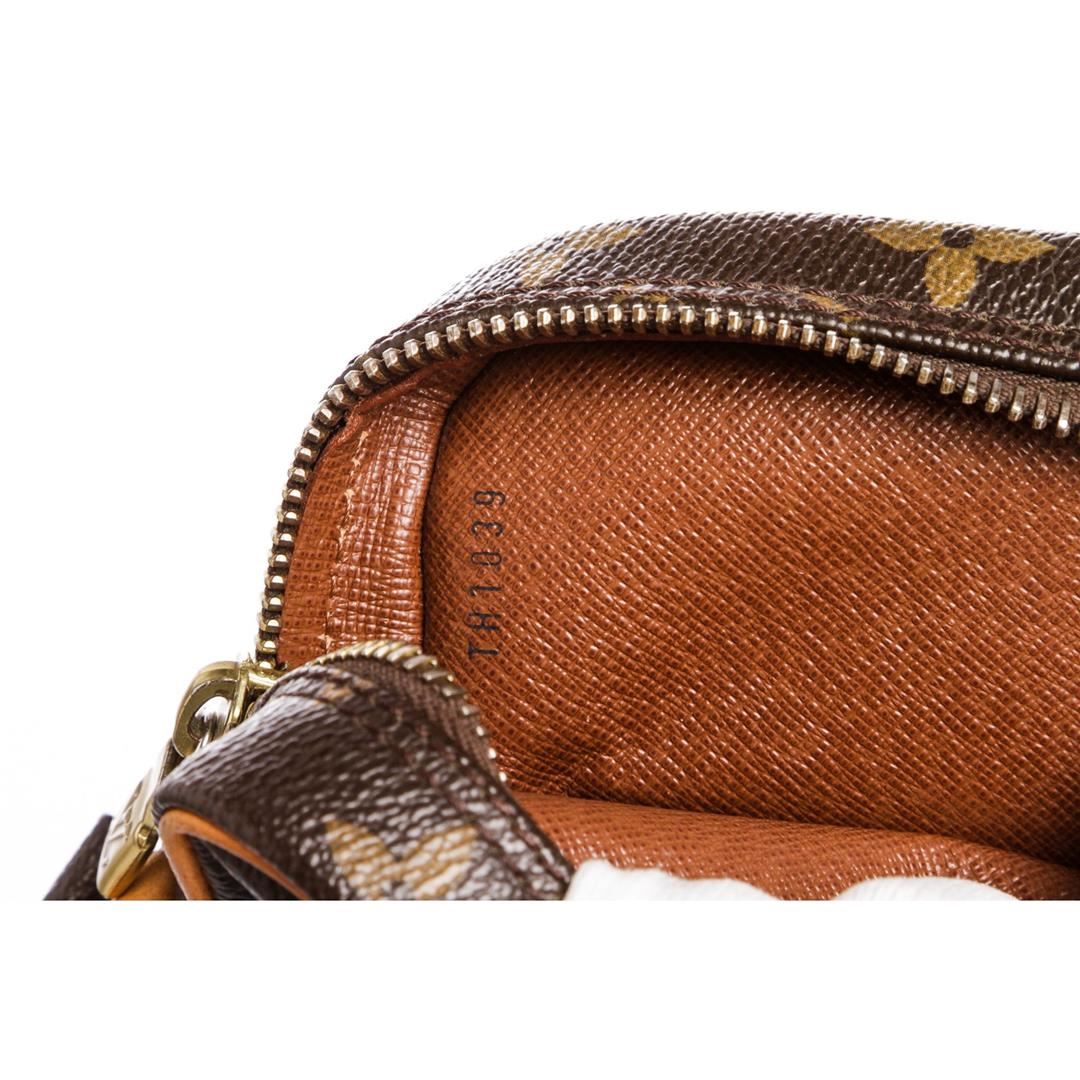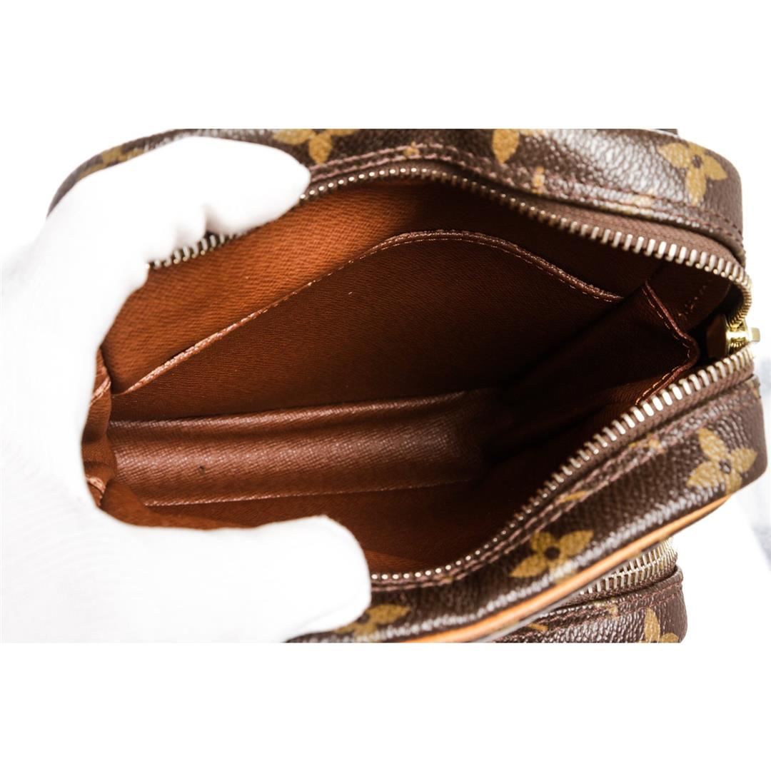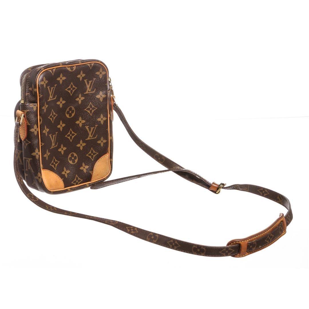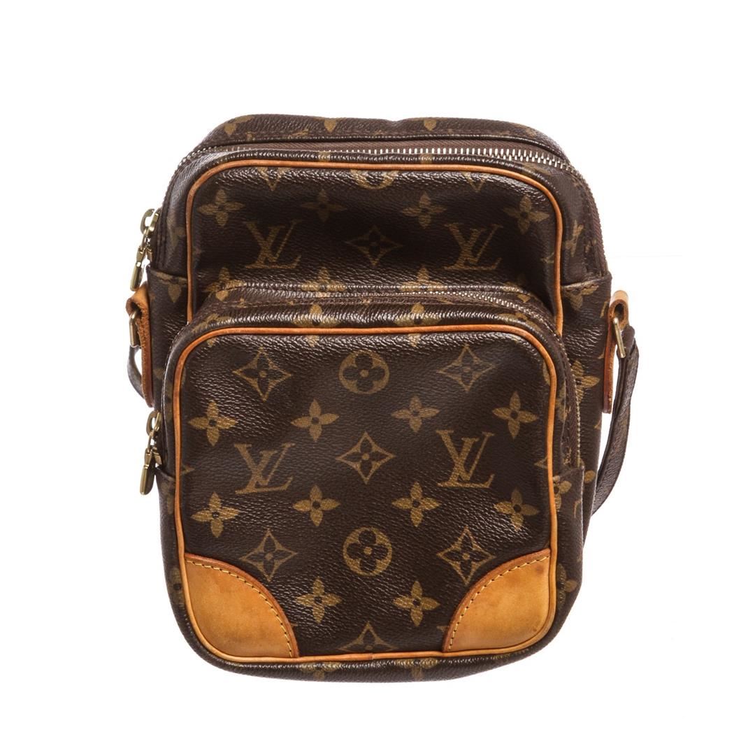 Brown and tan monogram coated canvas Louis Vuitton Amazon bag with brass hardware, tan vachetta leather trim, flat shoulder strap, exterior zip pocket, brown leather lining and zip closure at top. Item is pre-owned.