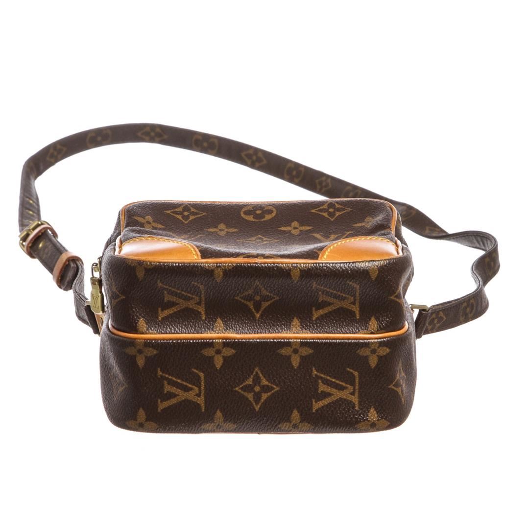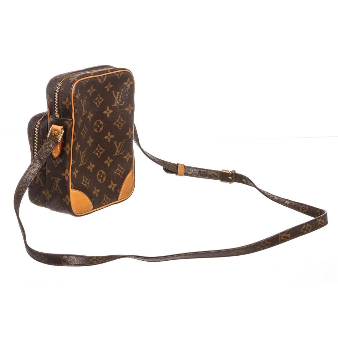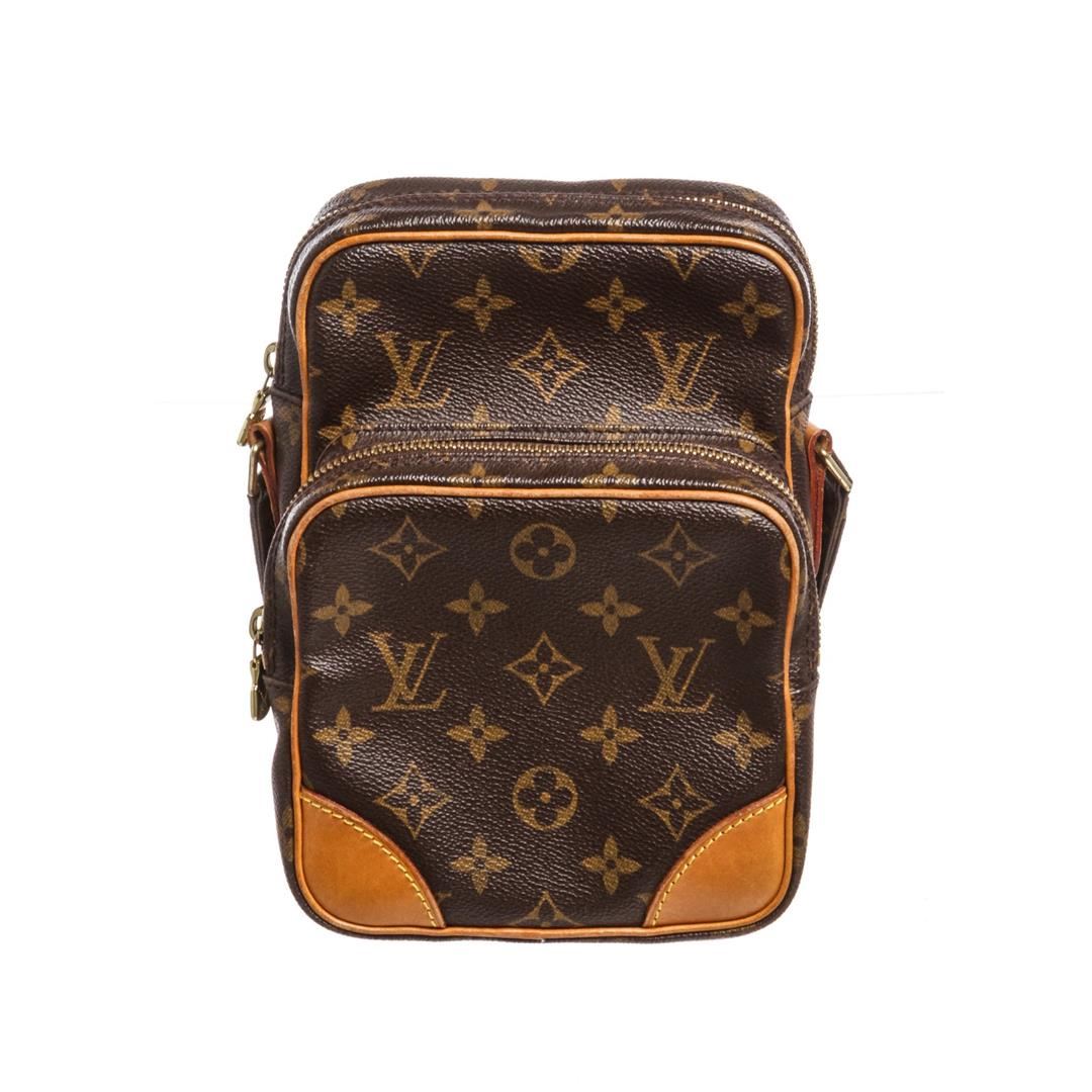 Brown and tan monogram coated canvas Louis Vuitton Amazon bag with brass hardware, tan vachetta leather trim, flat shoulder strap, exterior zip pocket, brown leather lining and zip closure at top. Item is pre-owned. Item Dimensions: 5"x3"x7"xBag Drop:22"/12.7cmx7.6cmx17.7cmxBag Drop:55.8cm.