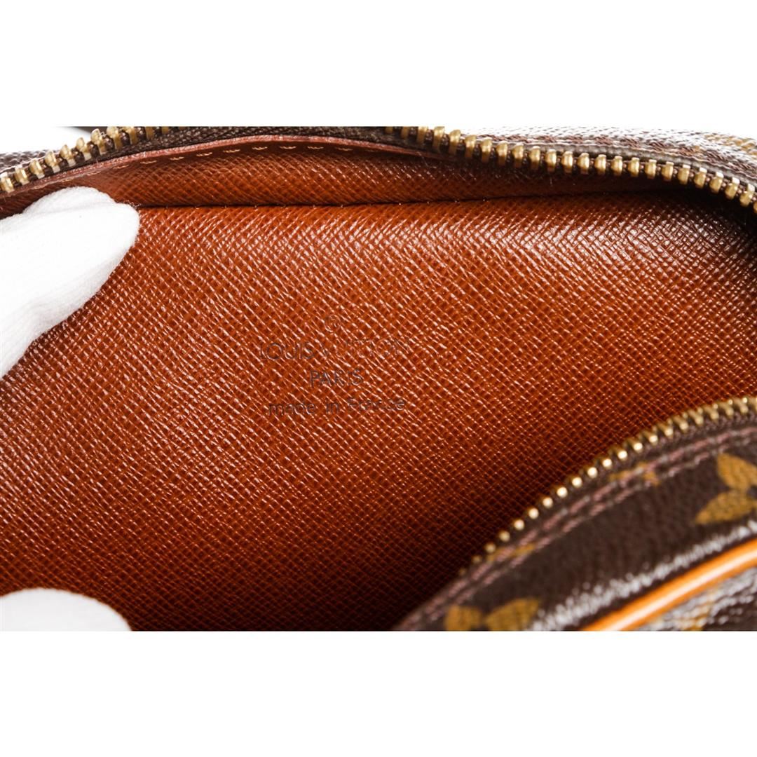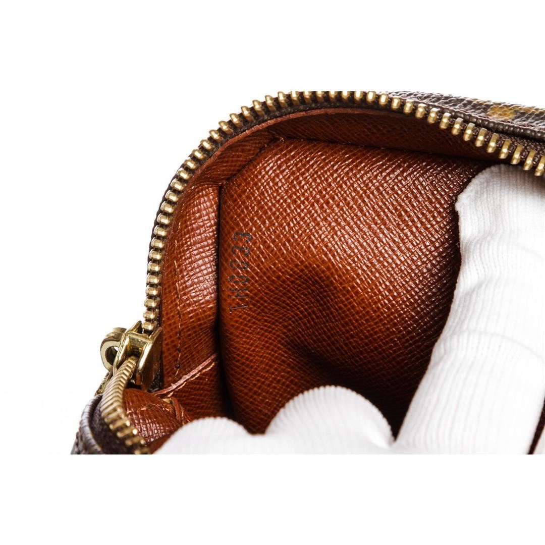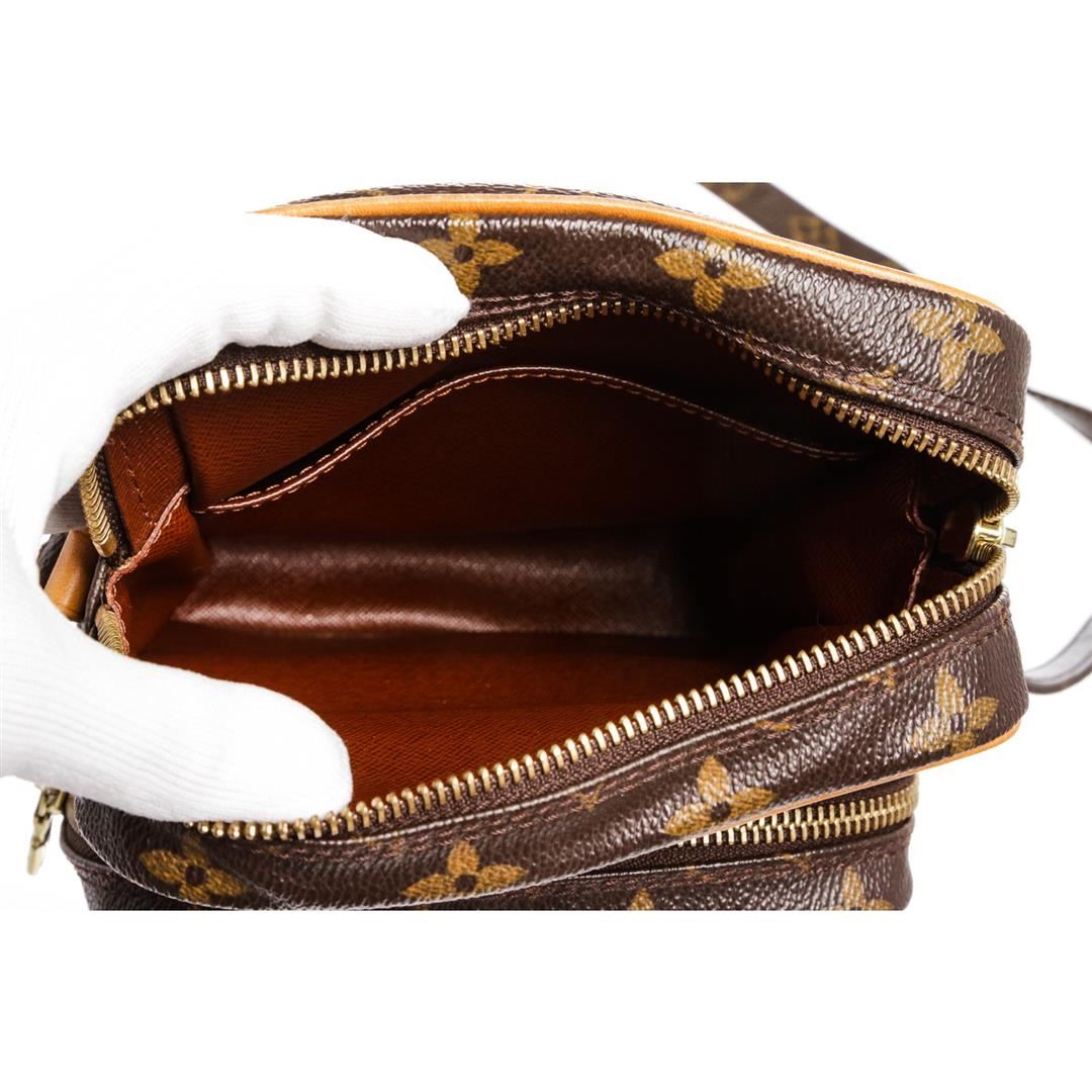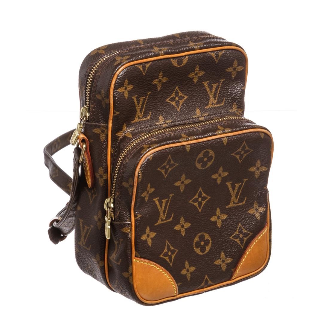 Brown and tan monogram coated canvas Louis Vuitton Amazon bag with brass hardware, tan vachetta leather trim, flat shoulder strap, exterior zip pocket, brown leather lining and zip closure at top. Item is pre-owned. Item Dimensions: 5"x3"x7"xBag Drop:22"/12.7cmx7.6cmx17.7cmxBag Drop:55.8cm.