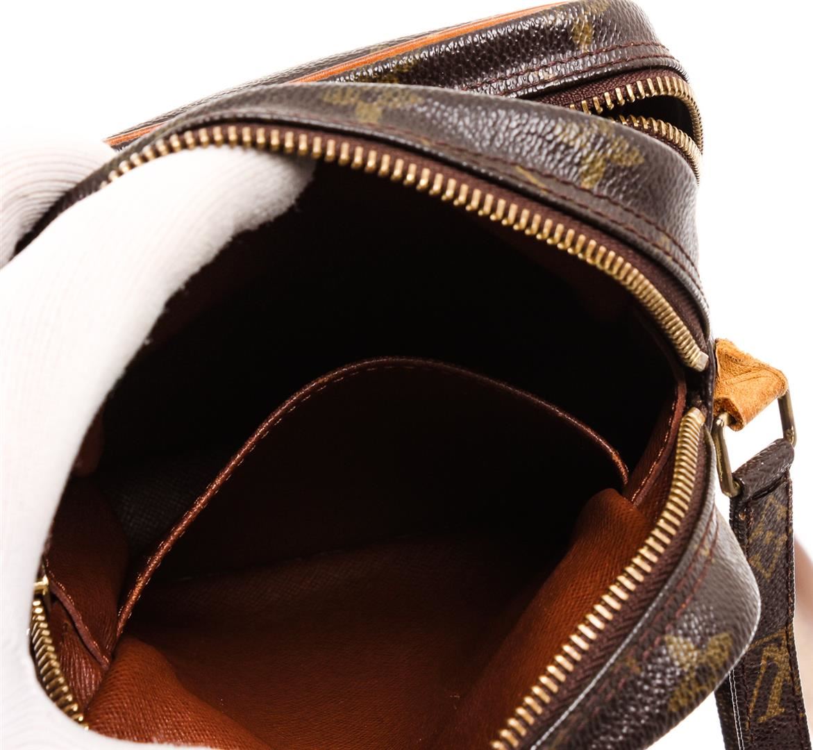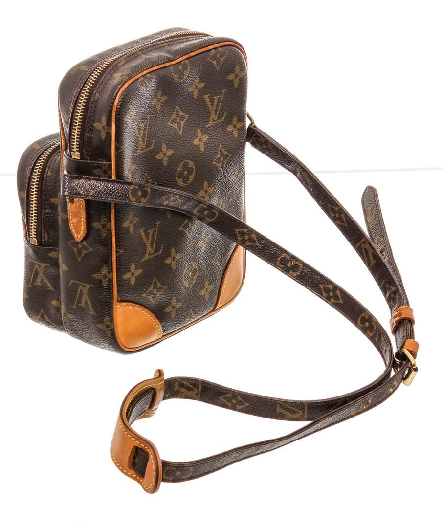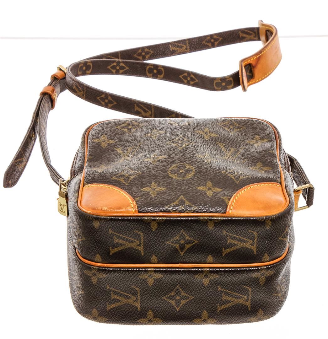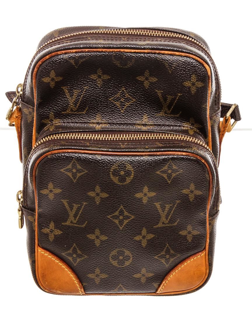 One Louis Vuitton Monogram Canvas Leather Amazone Crossbody Bag. Brown and tan monogram coated canvas Louis Vuitton Amazone bag with brass hardware, tan vachetta leather trim, flat shoulder strap, exterior zip pocket, brown leather lining and zip closure at top.
