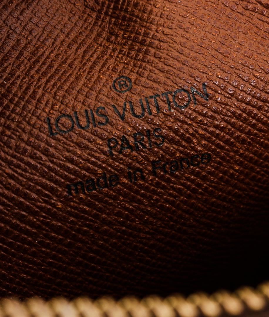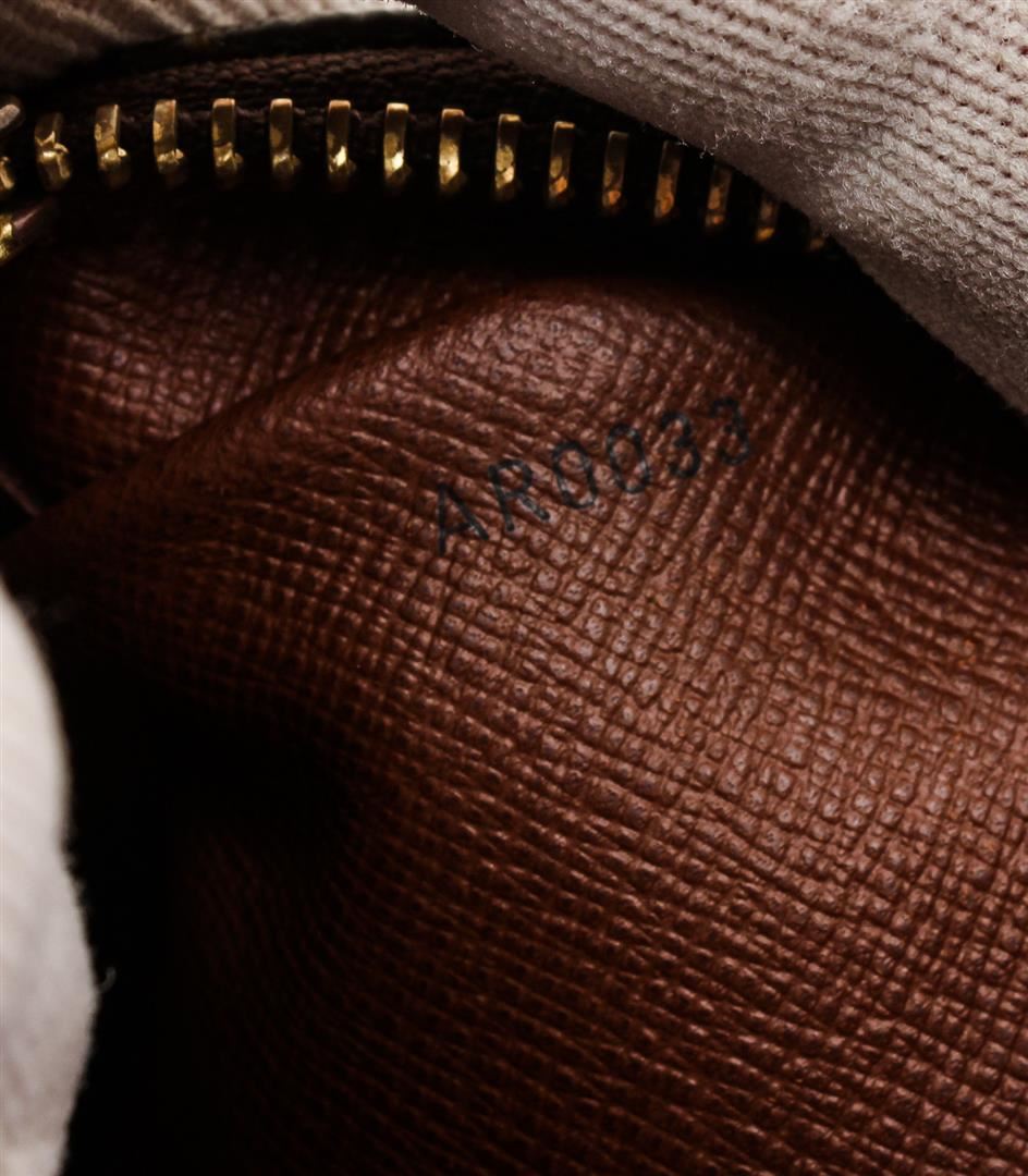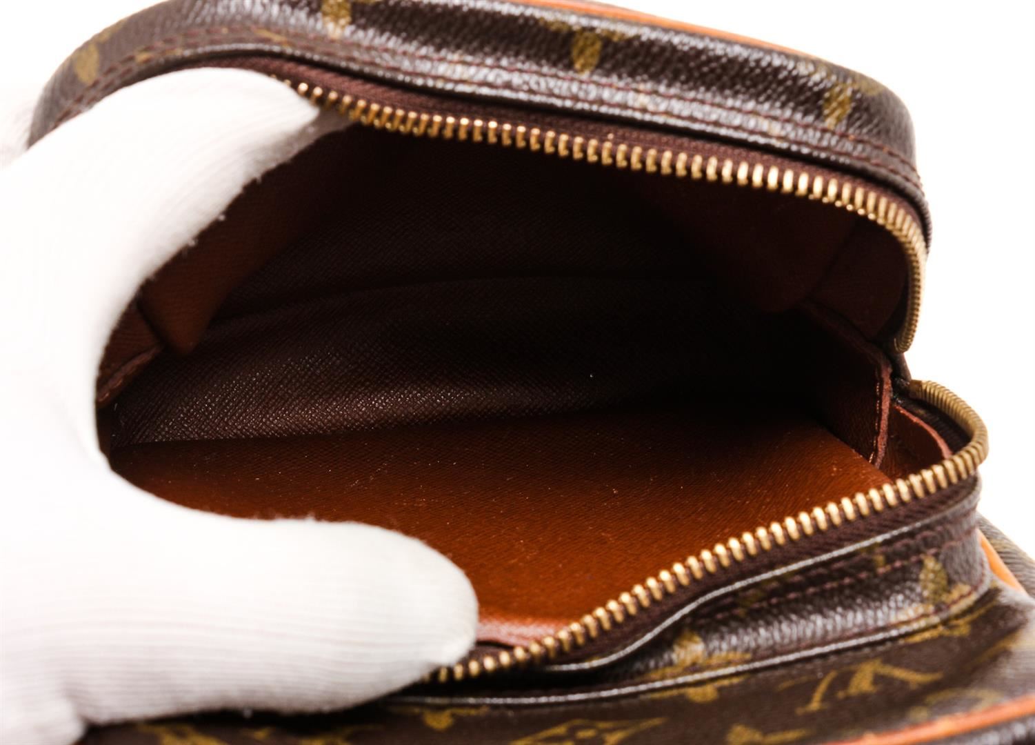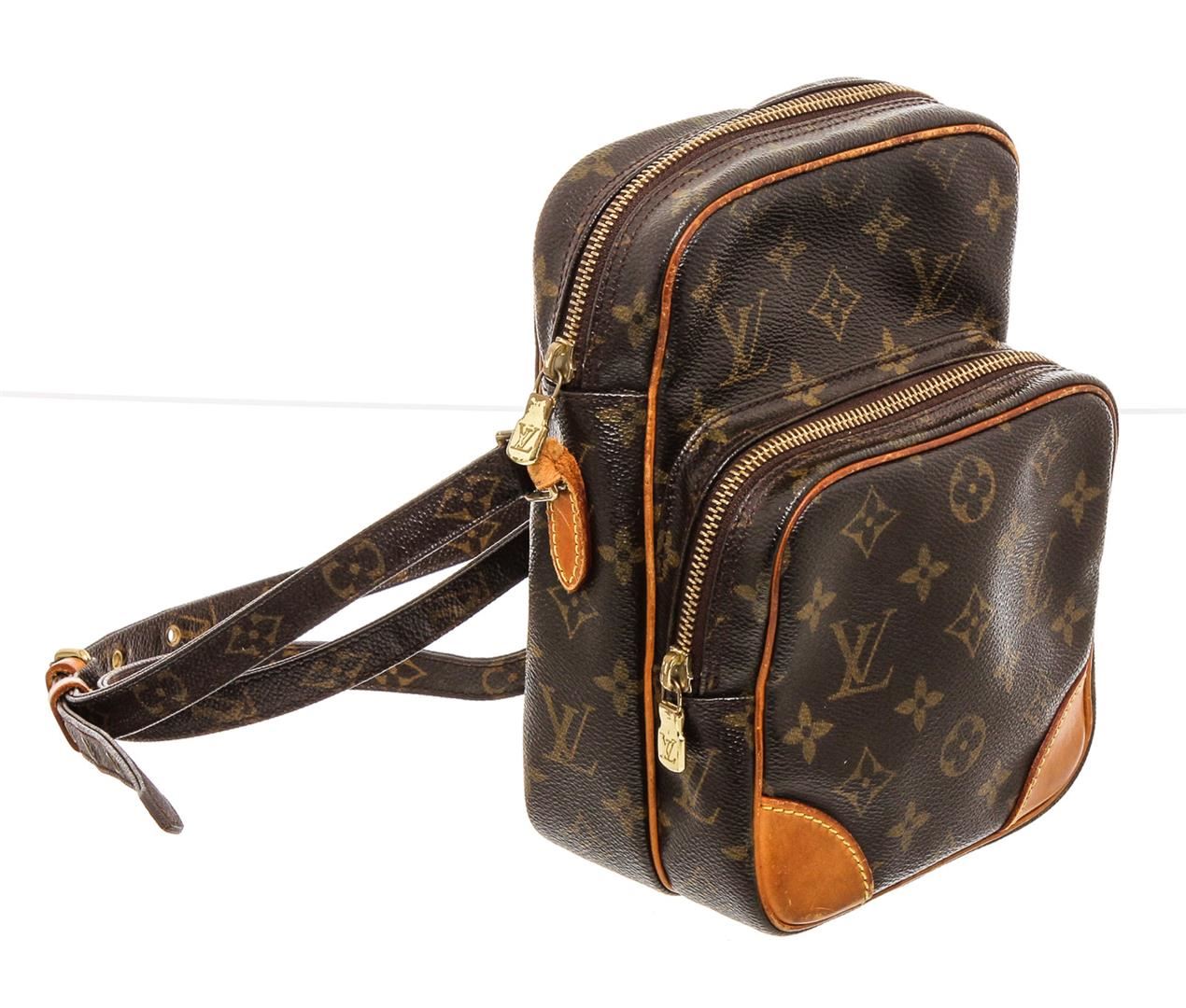 One Louis Vuitton Monogram Canvas Leather Amazone Crossbody Bag. Brown and tan monogram coated canvas Louis Vuitton Amazone bag with brass hardware, tan vachetta leather trim, flat shoulder strap, exterior zip pocket, brown leather lining and zip closure at top.