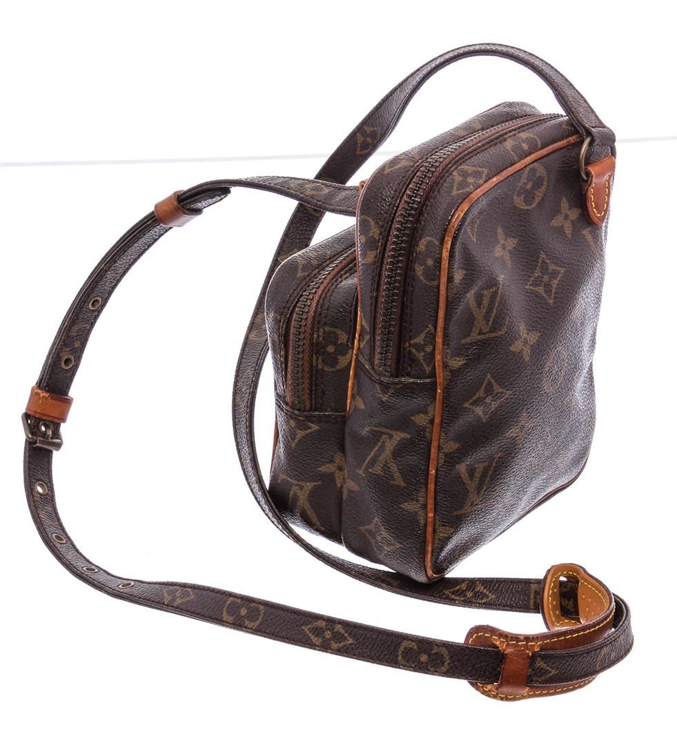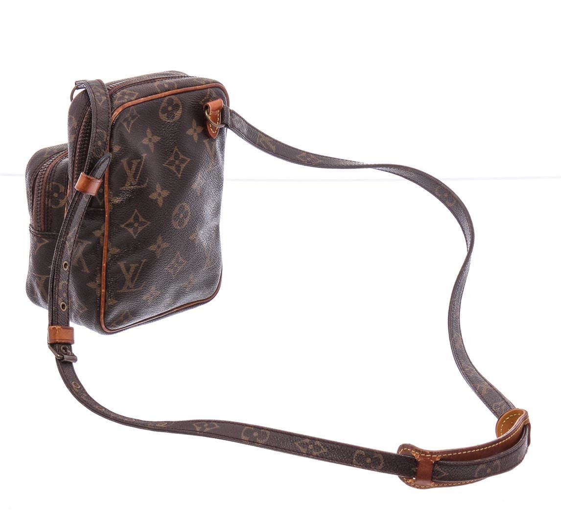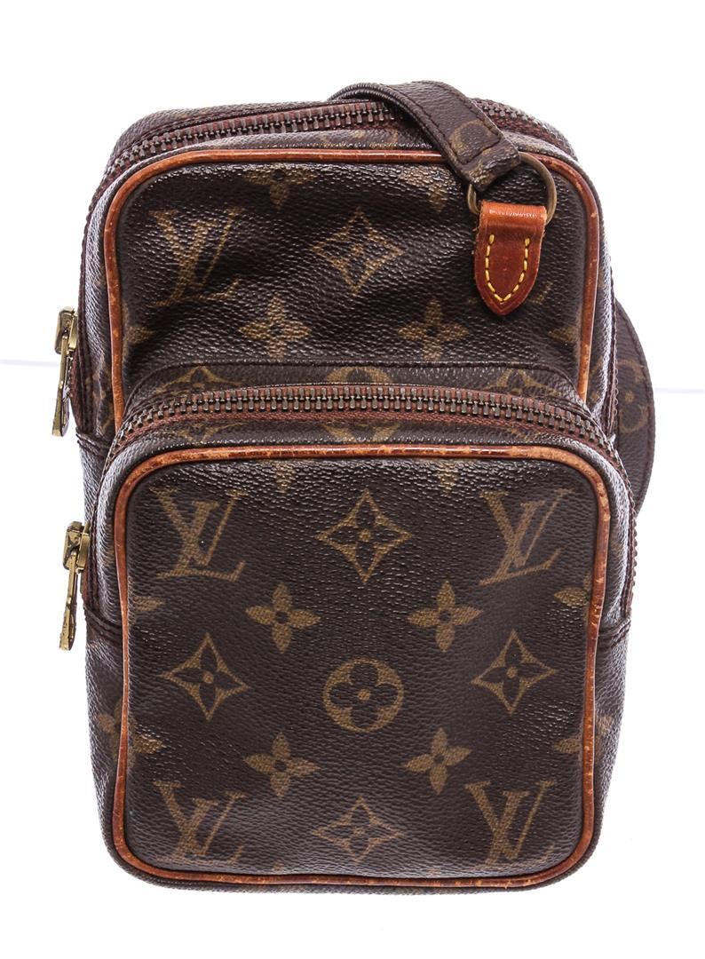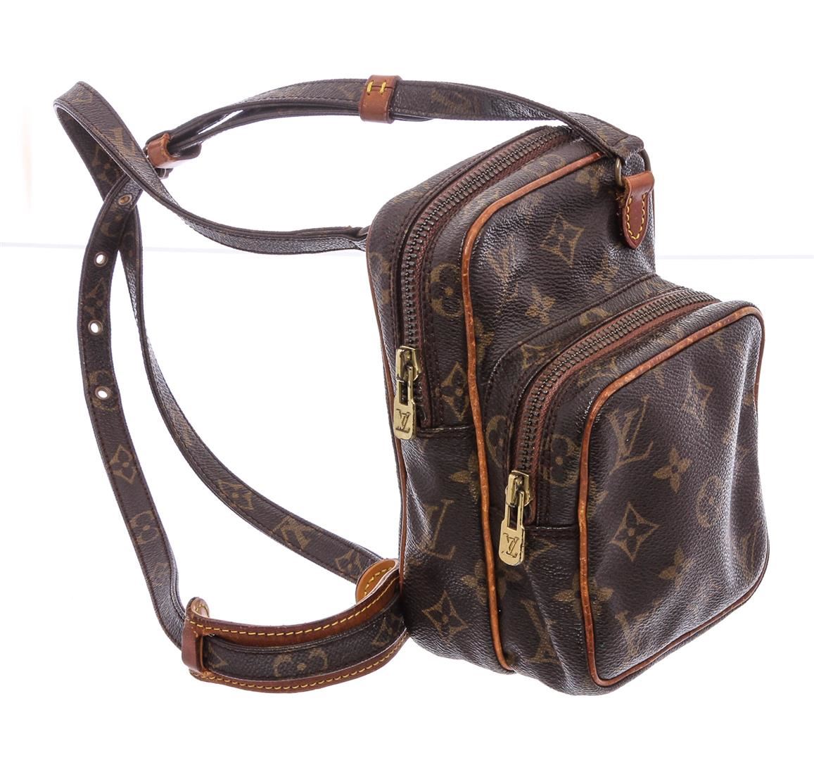 One Louis Vuitton Monogram Canvas Leather Amazone Crossbody Bag. Brown and tan monogram coated canvas Louis Vuitton Amazone bag with brass hardware, tan vachetta leather trim, flat shoulder strap, exterior zip pocket, brown leather lining and zip closure at top.
