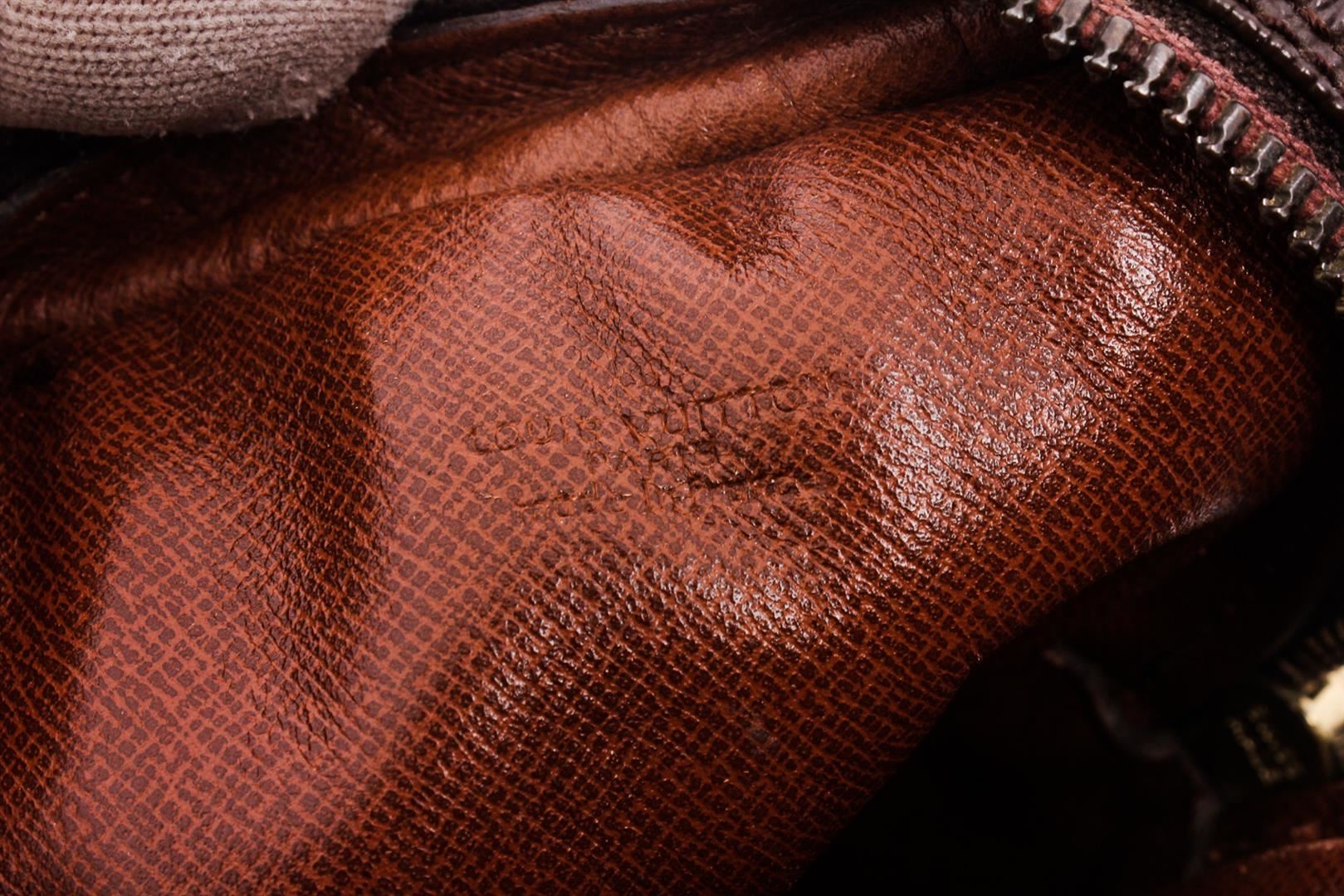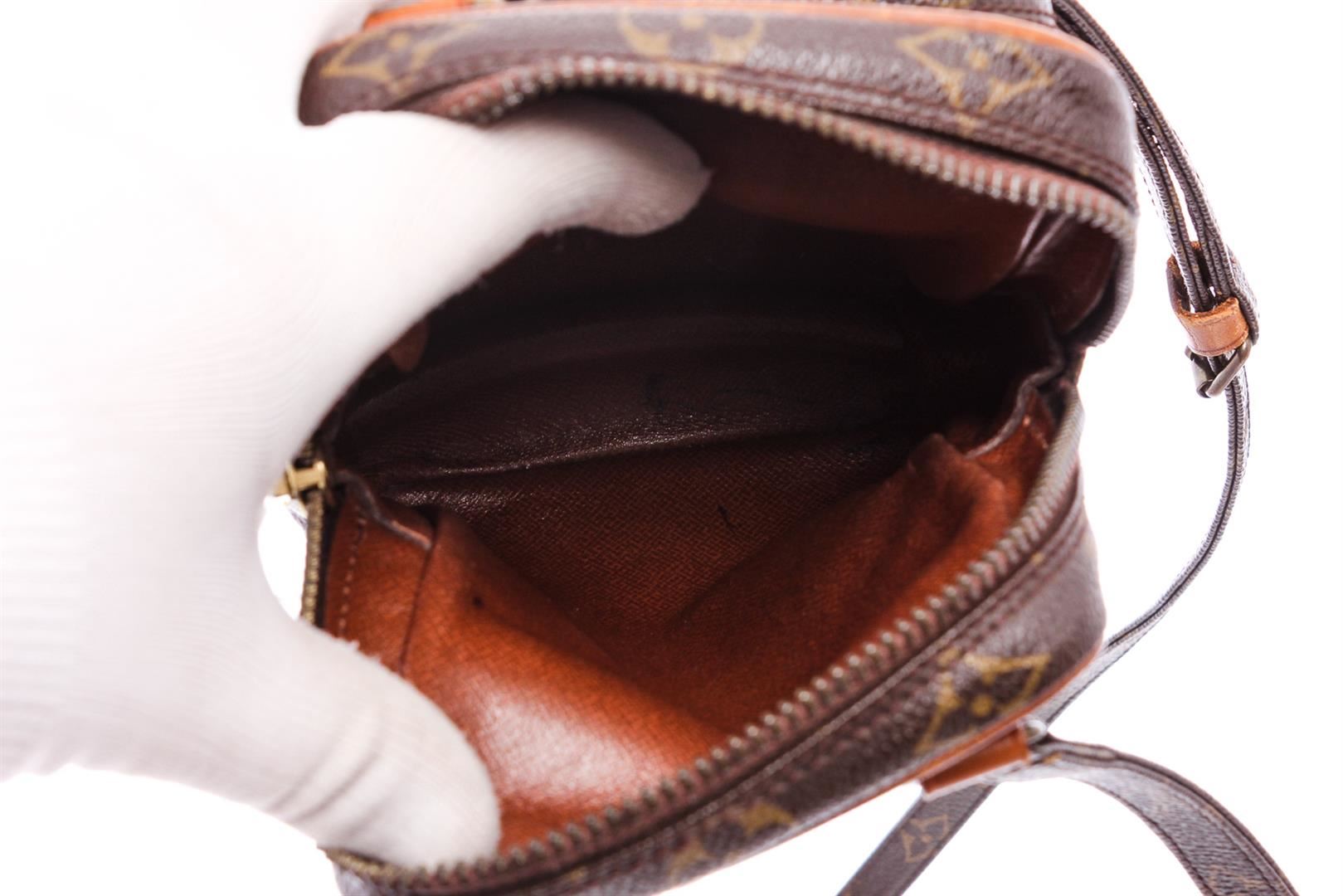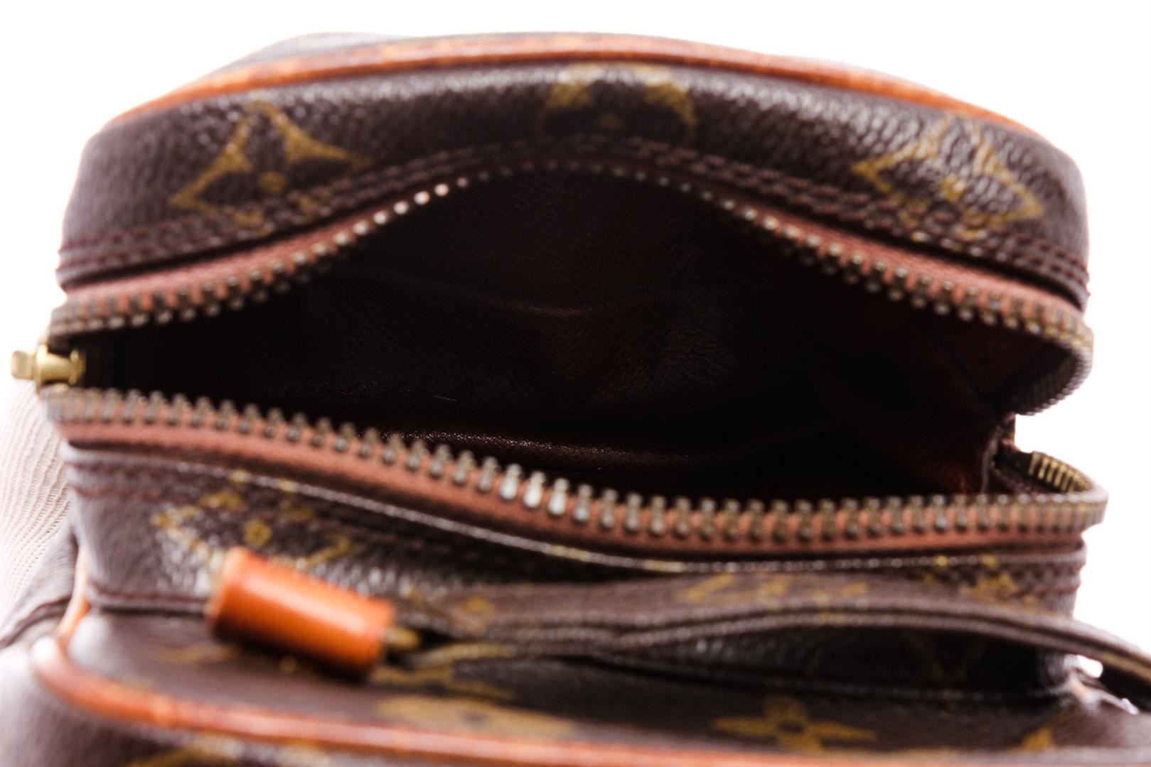 One Louis Vuitton Monogram Canvas Leather Amazone Crossbody Bag. Brown and tan monogram coated canvas Louis Vuitton Amazone bag with brass hardware, tan vachetta leather trim, flat shoulder strap, exterior zip pocket, brown leather lining and zip closure at top.