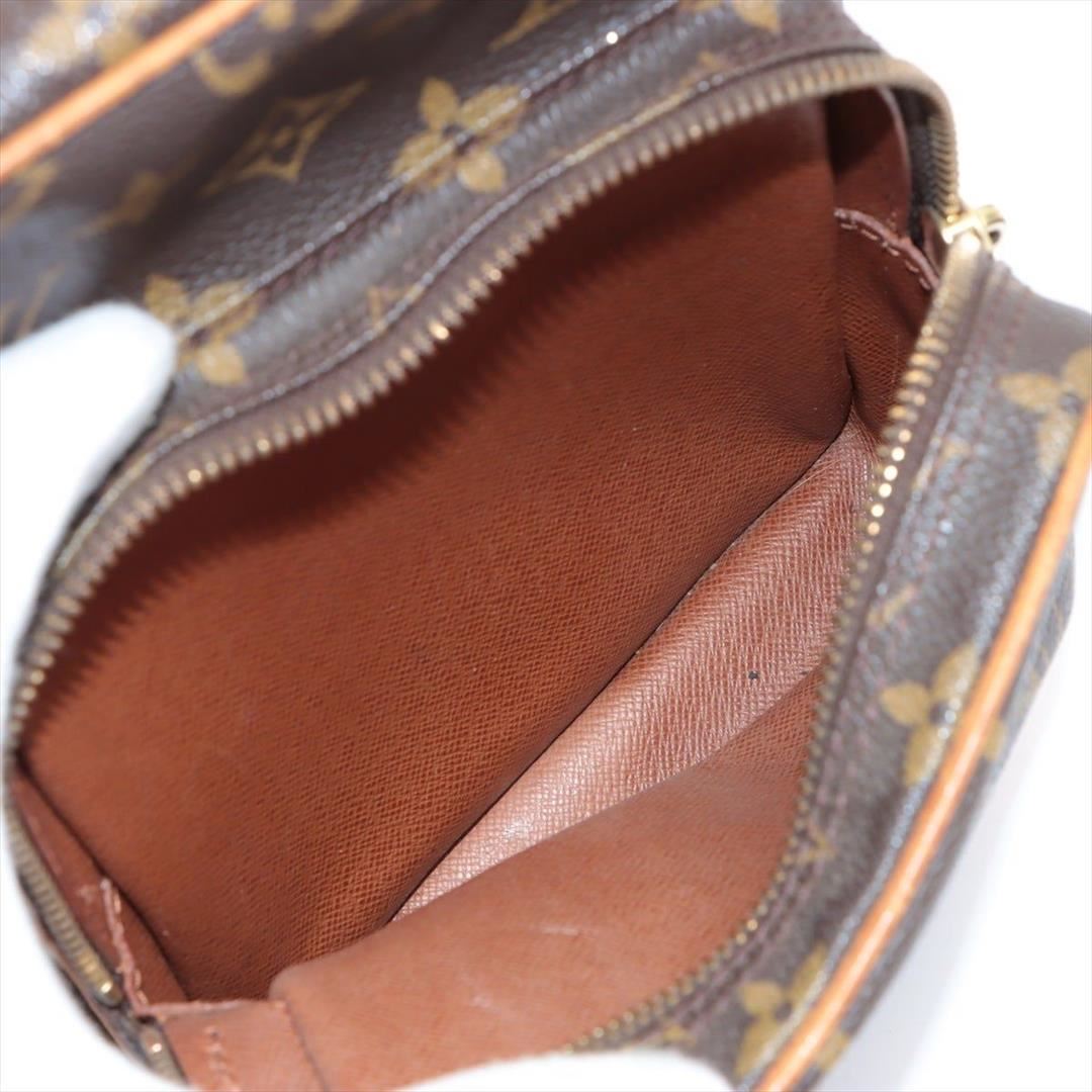Brown and tan monogram coated canvas Louis Vuitton Amazone bag with brass hardware, tan vachetta leather trim, flat shoulder strap, exterior zip pocket, brown leather lining and zip closure at top. 5"x3"x7"xBag Drop:22"/12.7cmx7.6cmx17.7cmxBag Drop:55.8cm