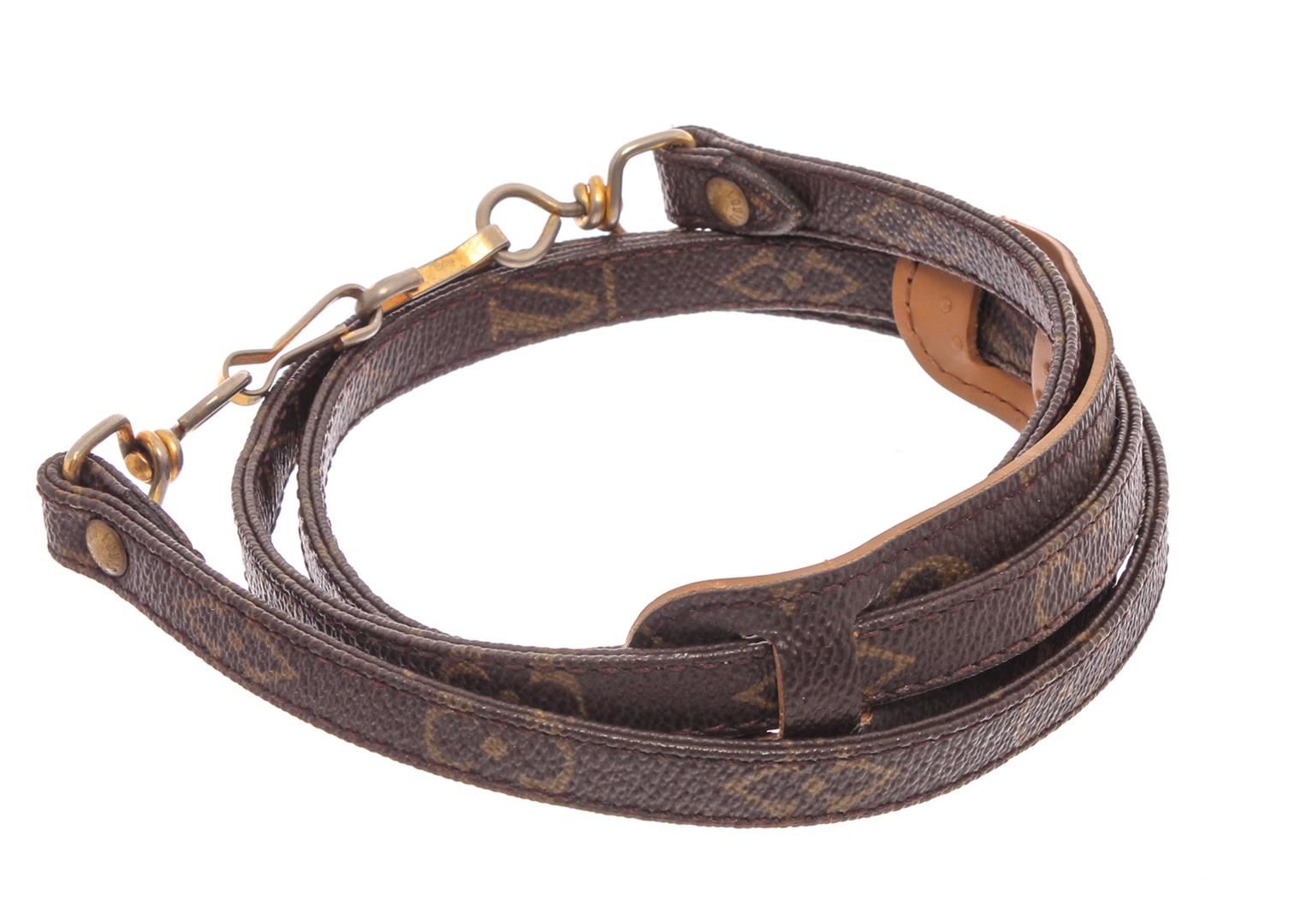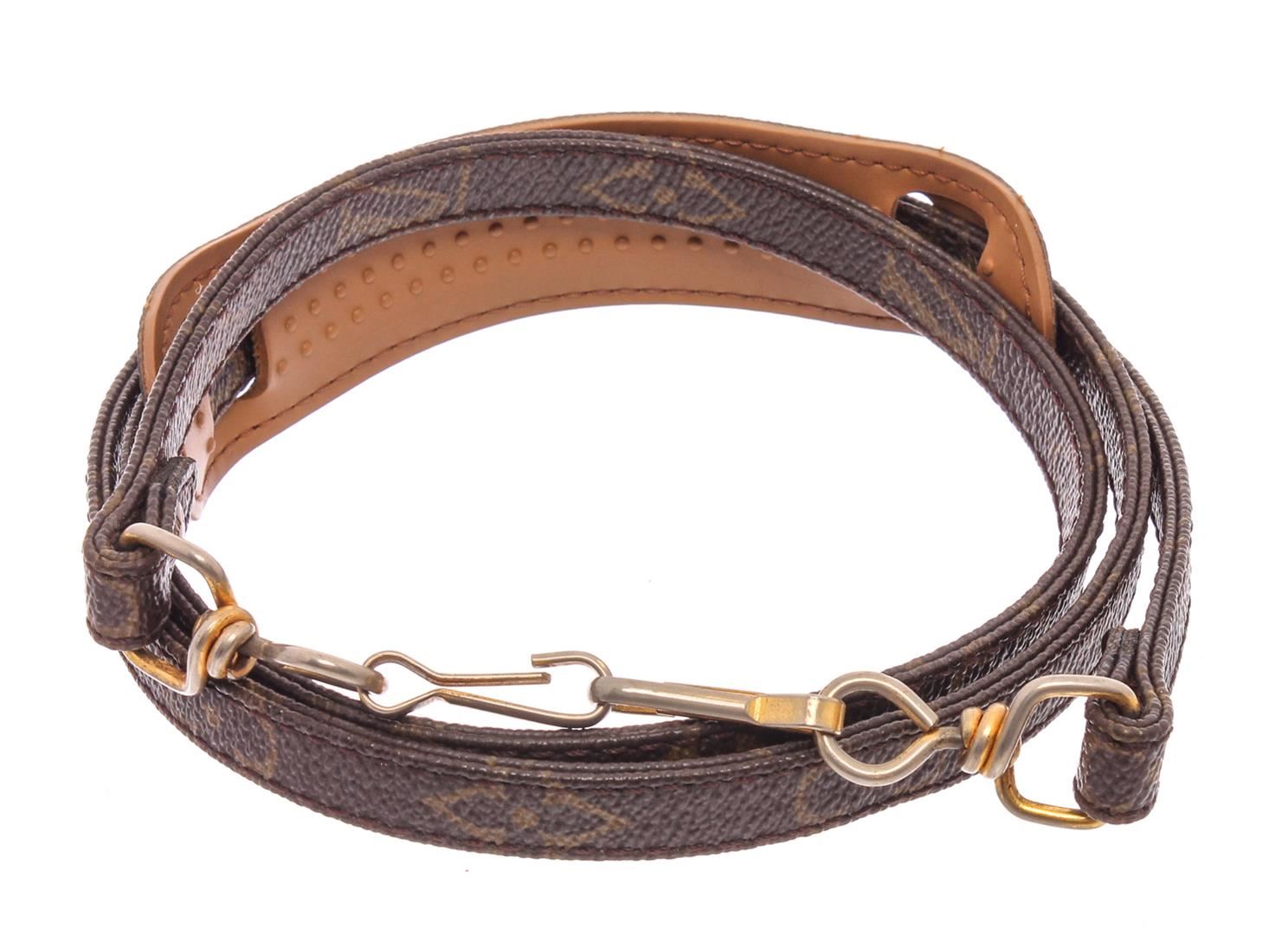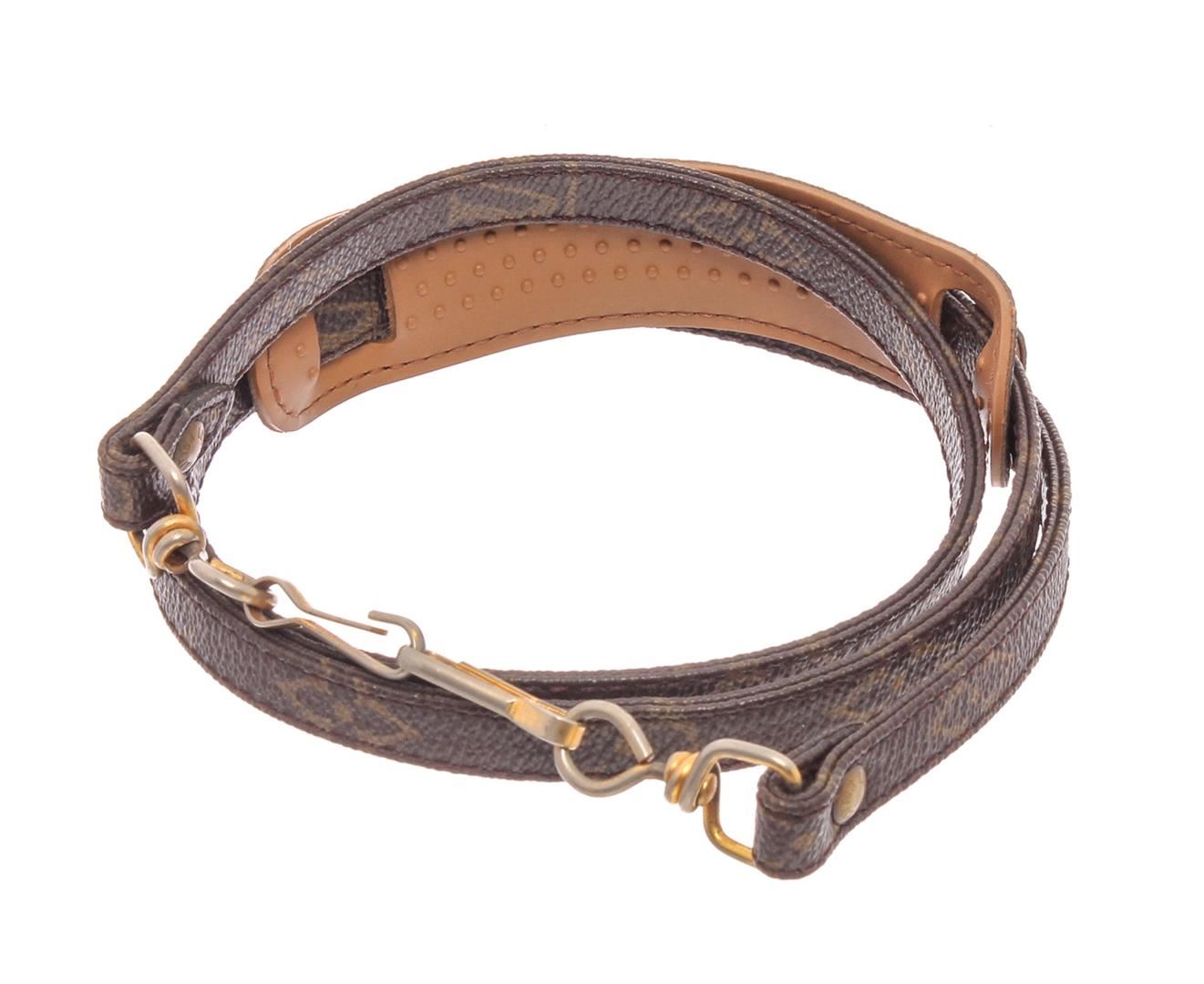 Monogram Louis Vuitton canvas leather bag strap with gold-tone hardware.
