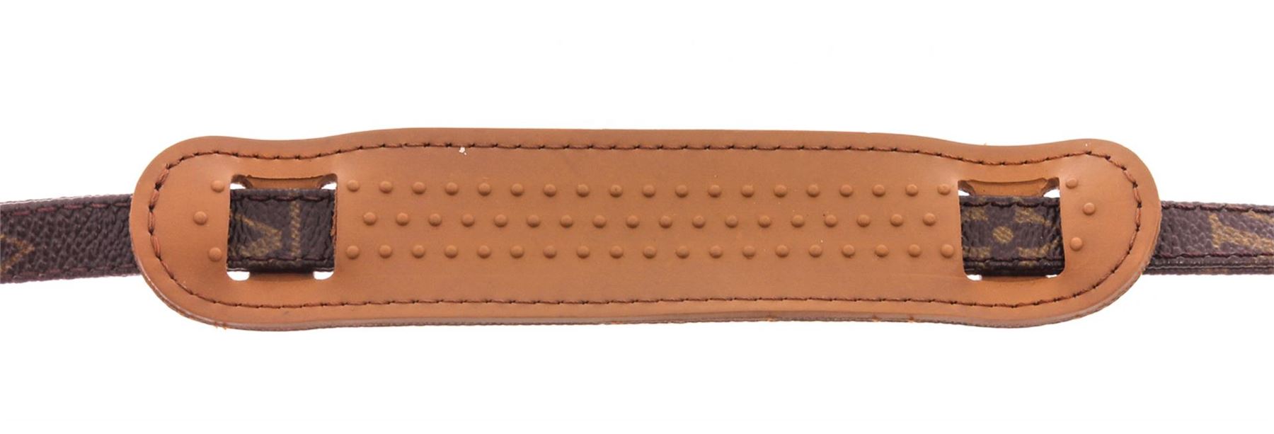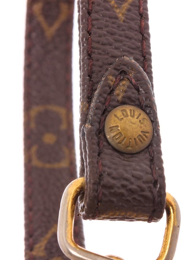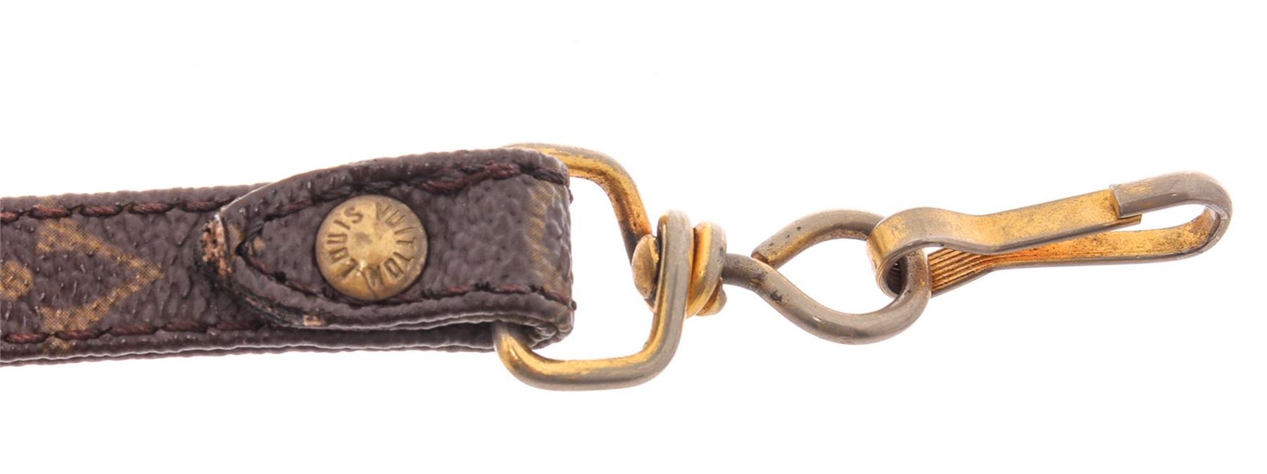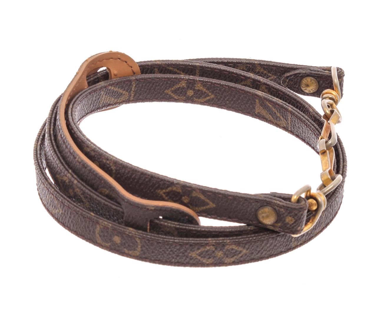 Monogram Louis Vuitton canvas leather bag strap with gold-tone hardware.
