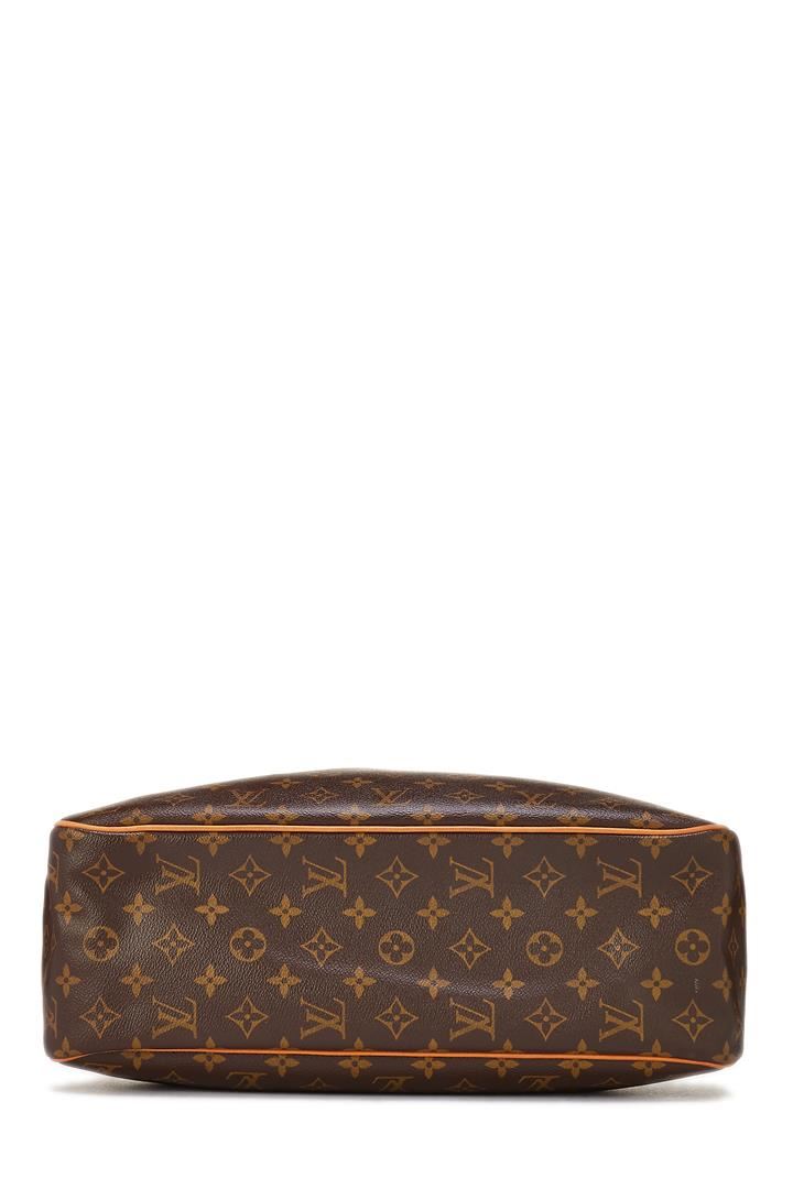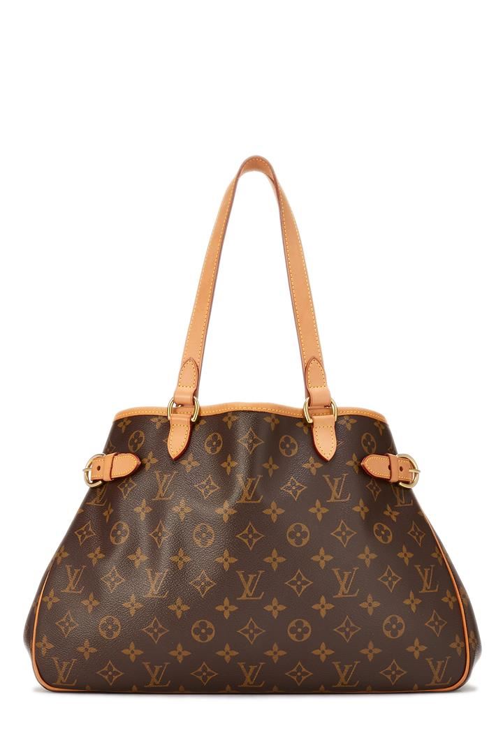 One Louis Vuitton Monogram Canvas Leather Batignolles Horizontal Bag. Brown and tan monogram coated canvas Louis Vuitton Batignolles Horizontal bag with brass hardware, tan vachetta leather trim throughout, dual flat top handles, optional flat shoulder strap, brown canvas lining, dual pockets; one with zip closure at interior walls and lobster-claw clasp closure at top.