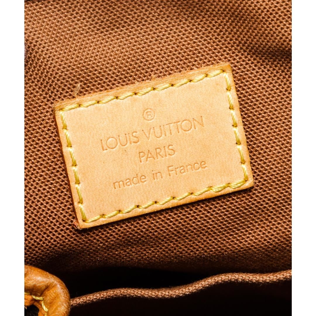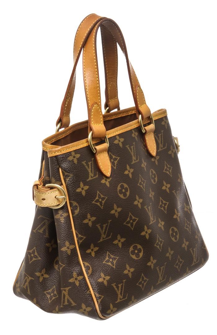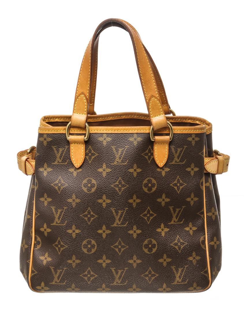 Brown and tan monogram coated canvas Louis Vuitton Batignolles Vertical bag with brass hardware, tan vachetta leather accents, dual flat shoulder straps, brown canvas lining, dual pockets at interior walls; one with zip closure and open top.