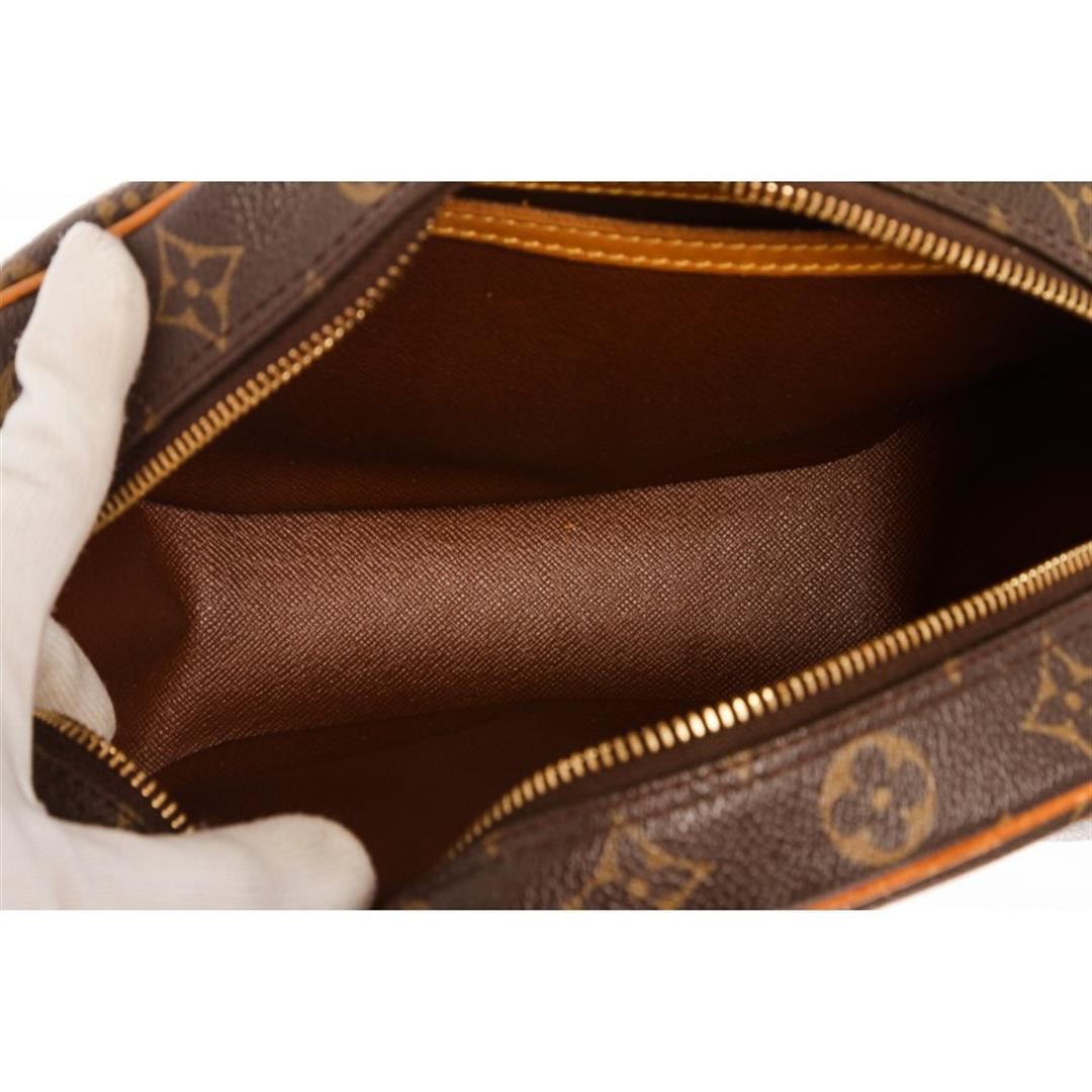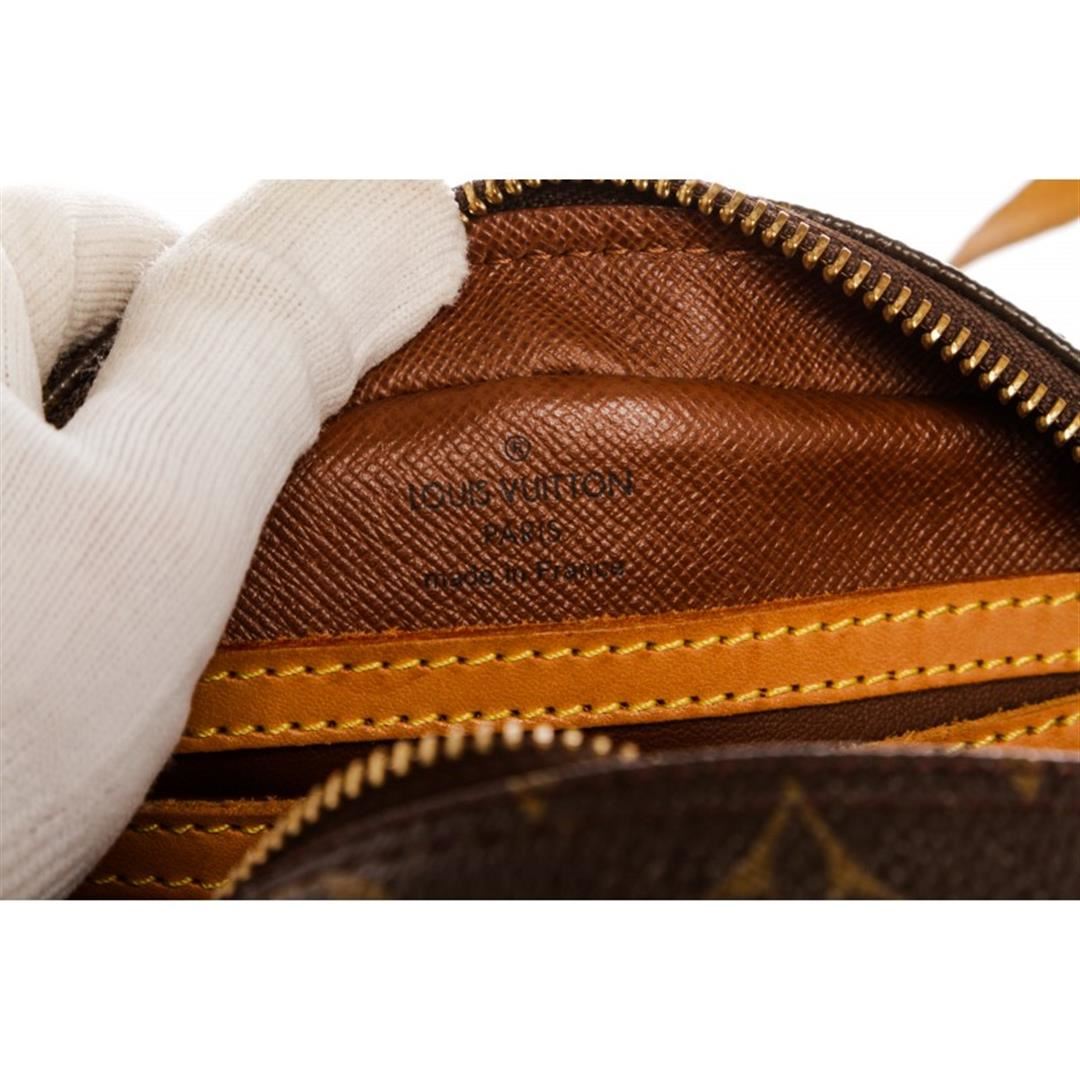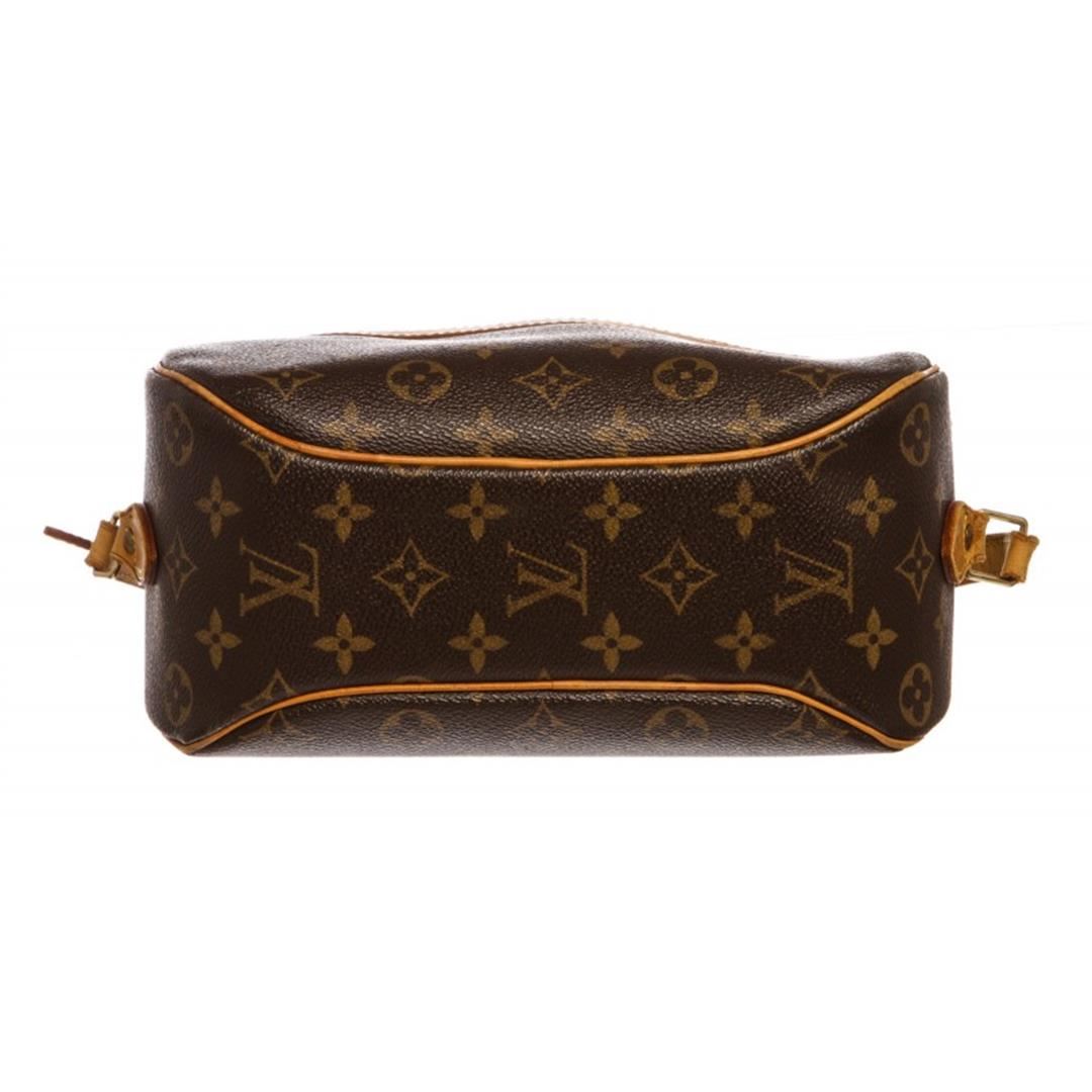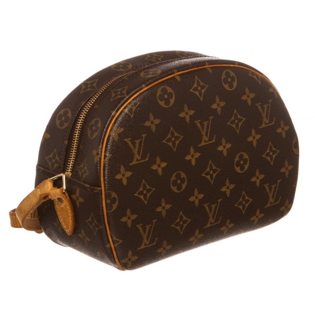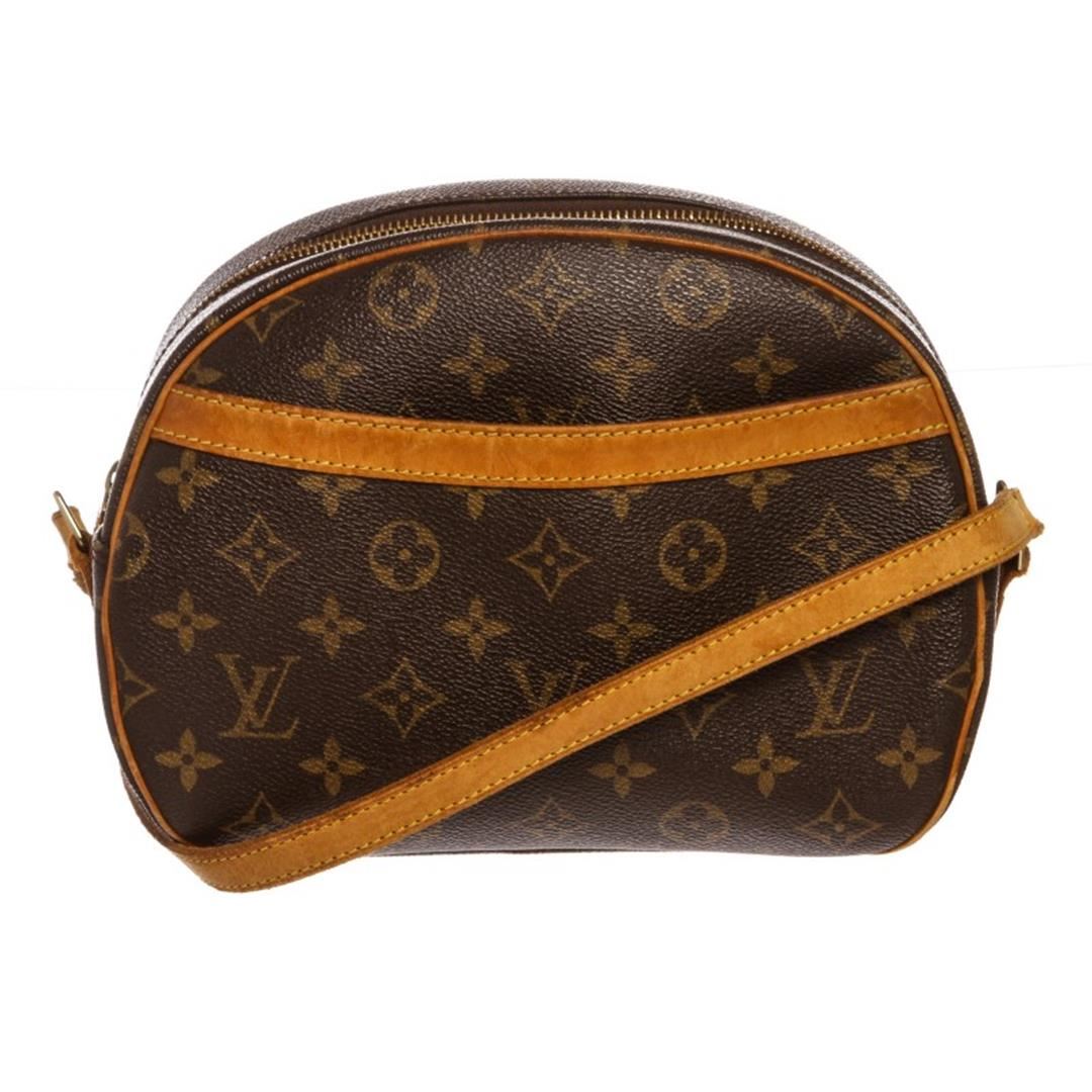 Brown and tan monogram coated canvas Louis Vuitton Blois bag with brass hardware, tan vachetta leather trim, flat shoulder strap, exterior pocket at front, brown leather lining, singleit pocket at interior wall and zip closure at top. Item is pre-owned.