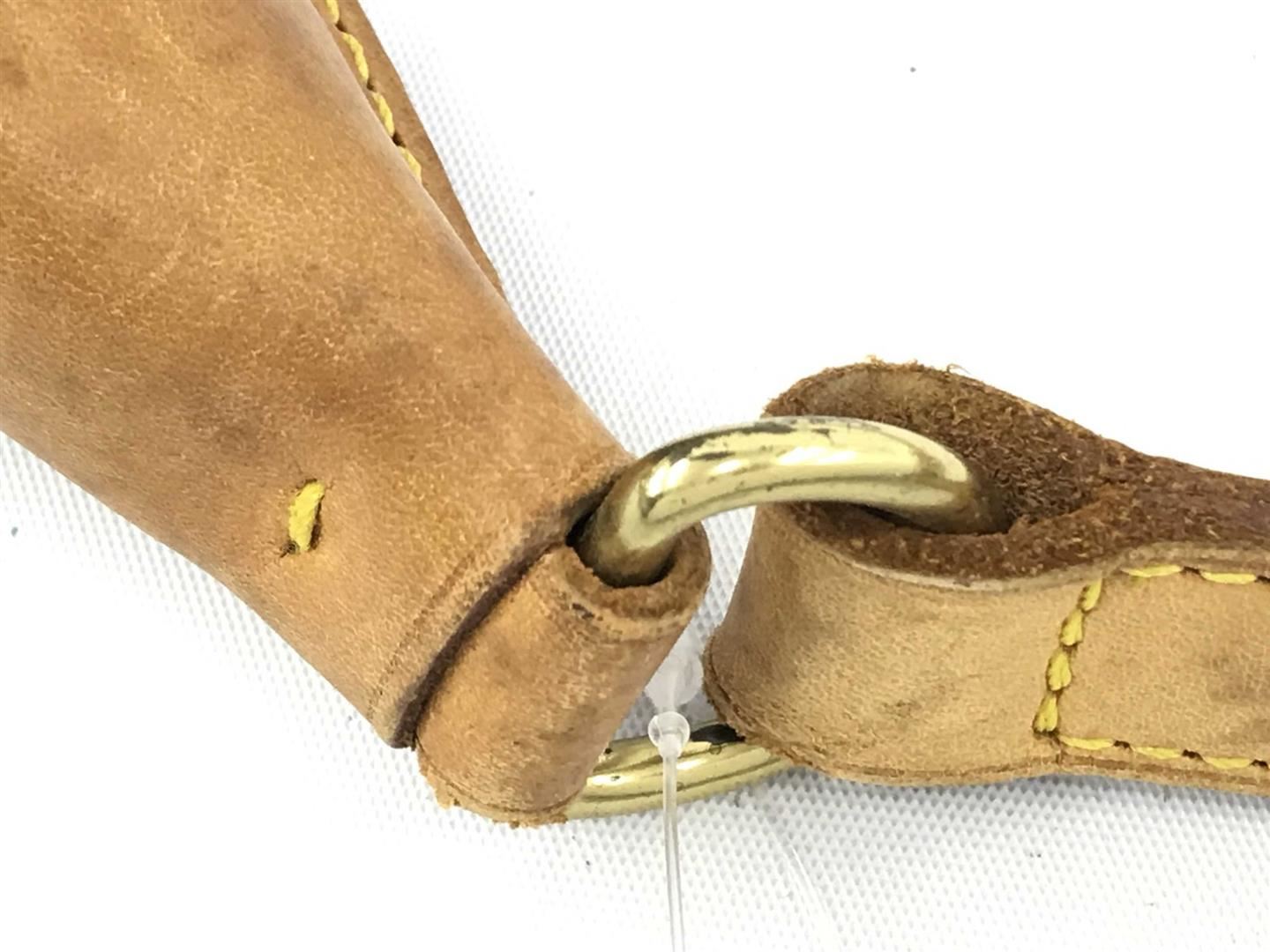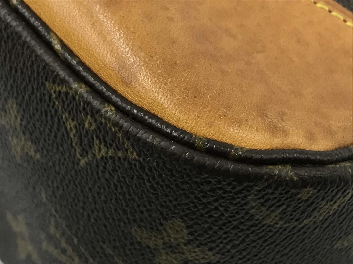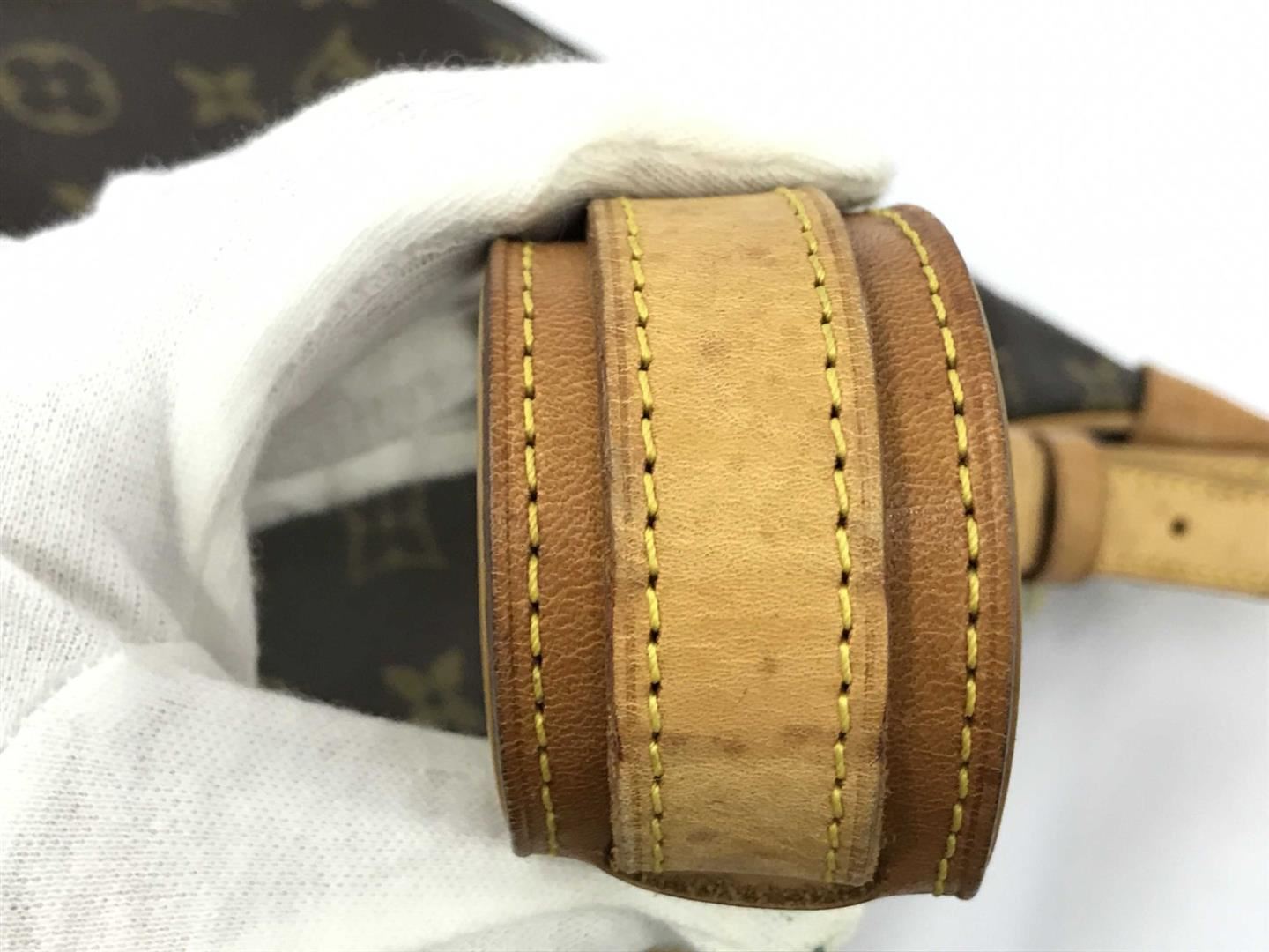 Brown and tan monogram coated canvas Louis Vuitton Boulogne 30 with brass hardware, tan vachetta leather accents throughout, single flat shoulder strap with buckle adjustment and shoulder guard, brown coated canvas interior lining, single pocket at interi