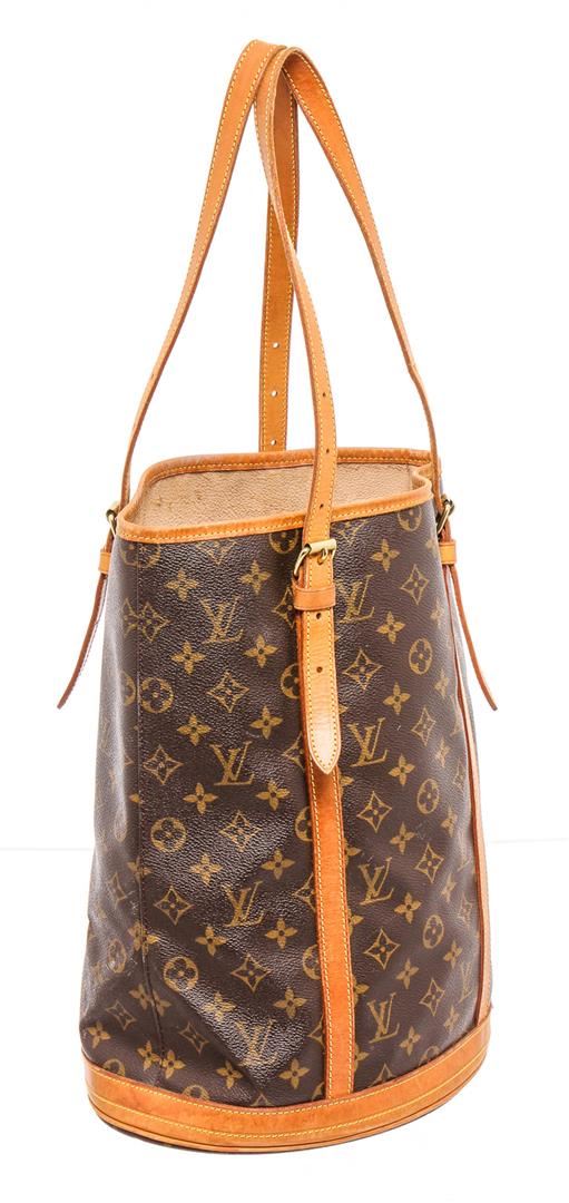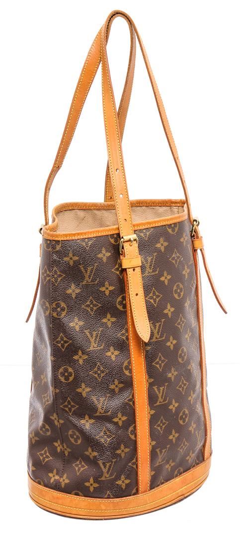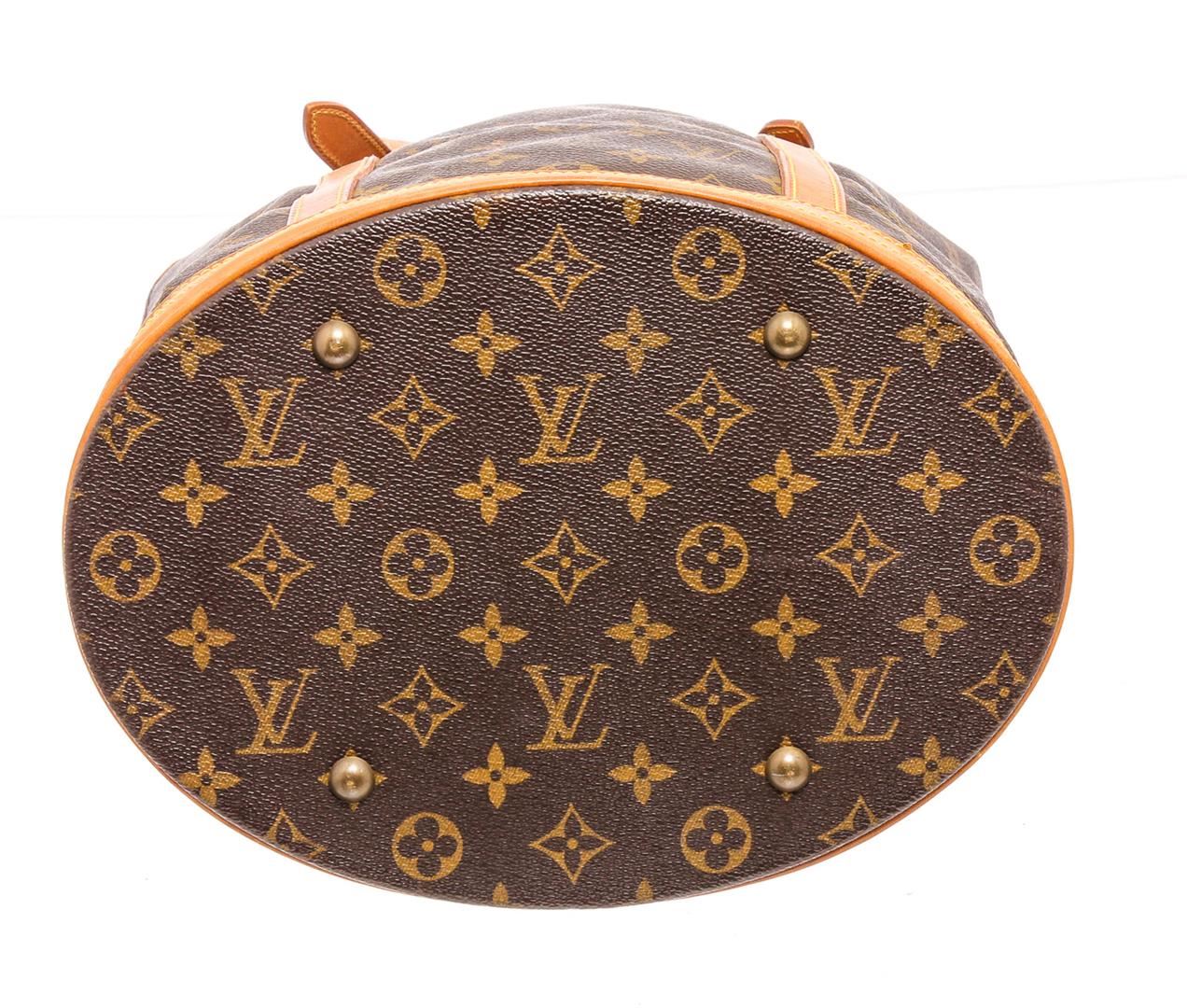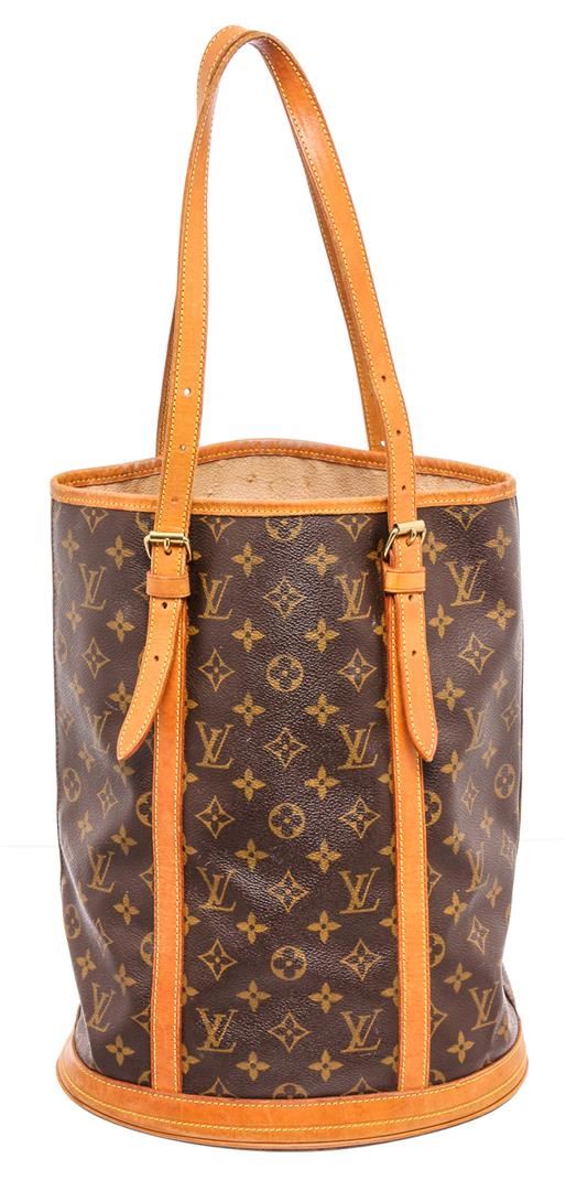Brown and tan monogram Louis Vuitton Bucket GM with brass hardware, tan vachetta leather accents, dual flat shoulder straps, beige Taiga leather interior and dual pockets; one with zip closure at interior walls. PLEASE NOTE: Interior is pealing and sticky.