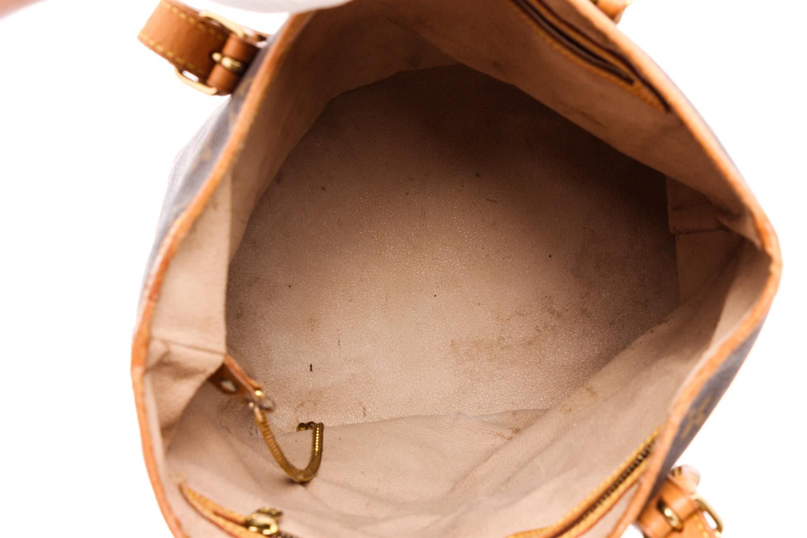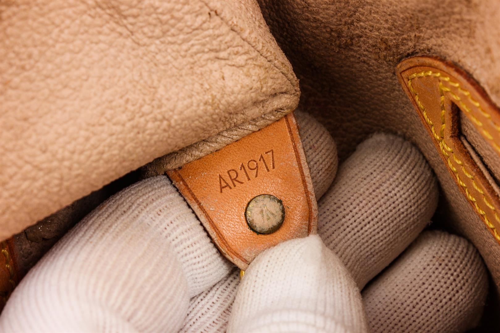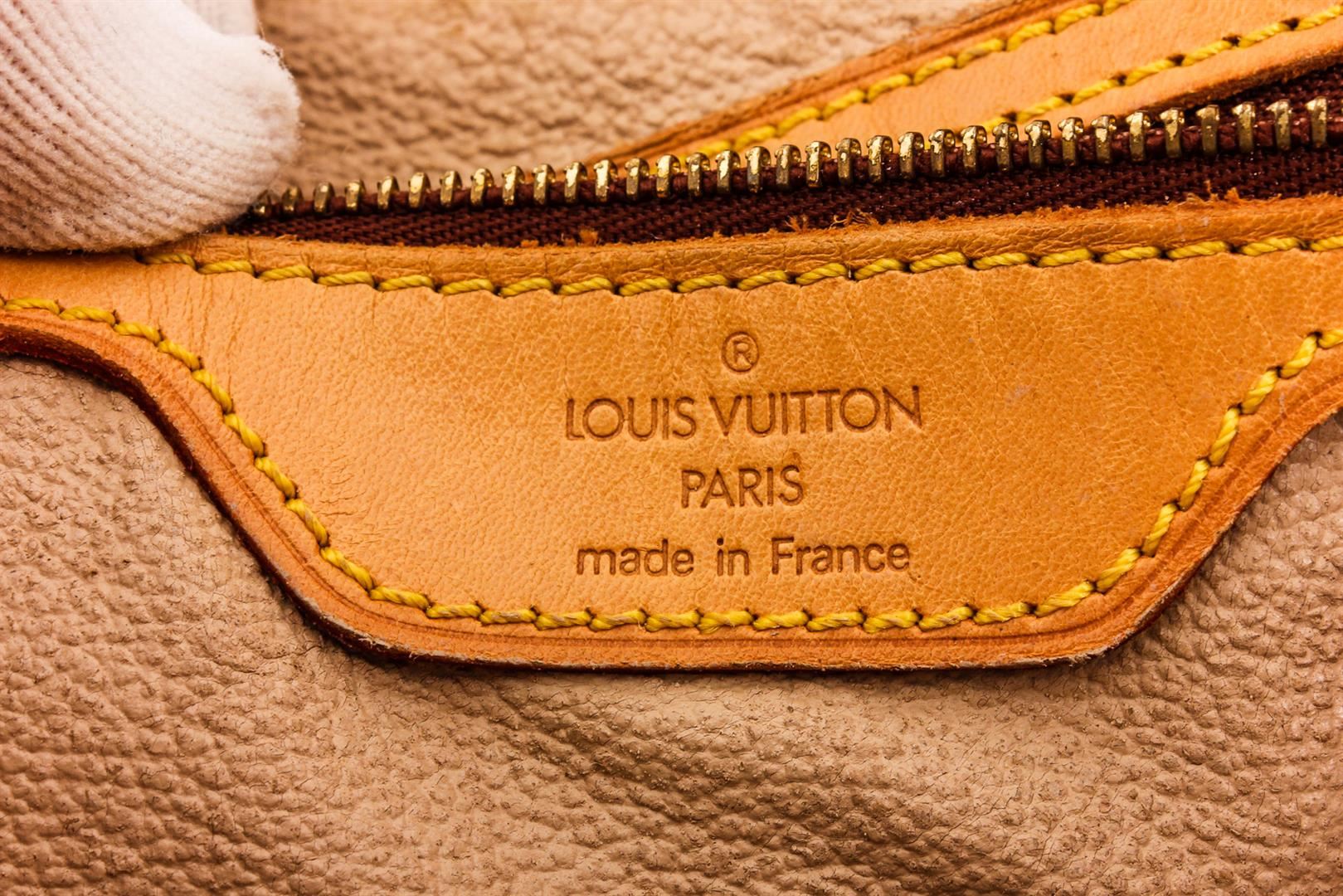 Brown and tan monogram Louis Vuitton Bucket GM with brass hardware, tan vachetta leather accents, dual flat shoulder straps, beige Taiga leather interior and dual pockets; one with zip closure at interior walls. PLEASE NOTE: Interior is pealing and sticky.