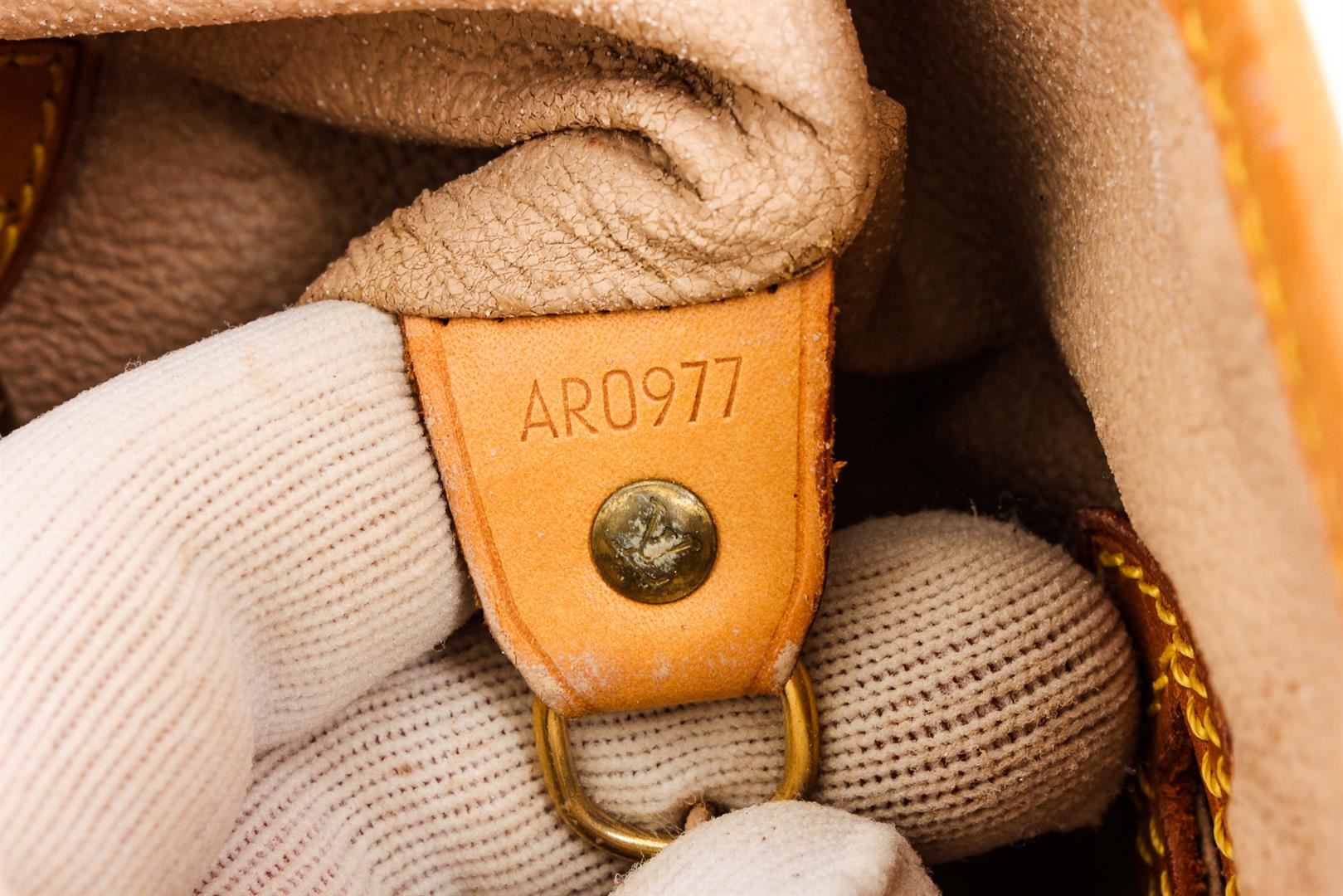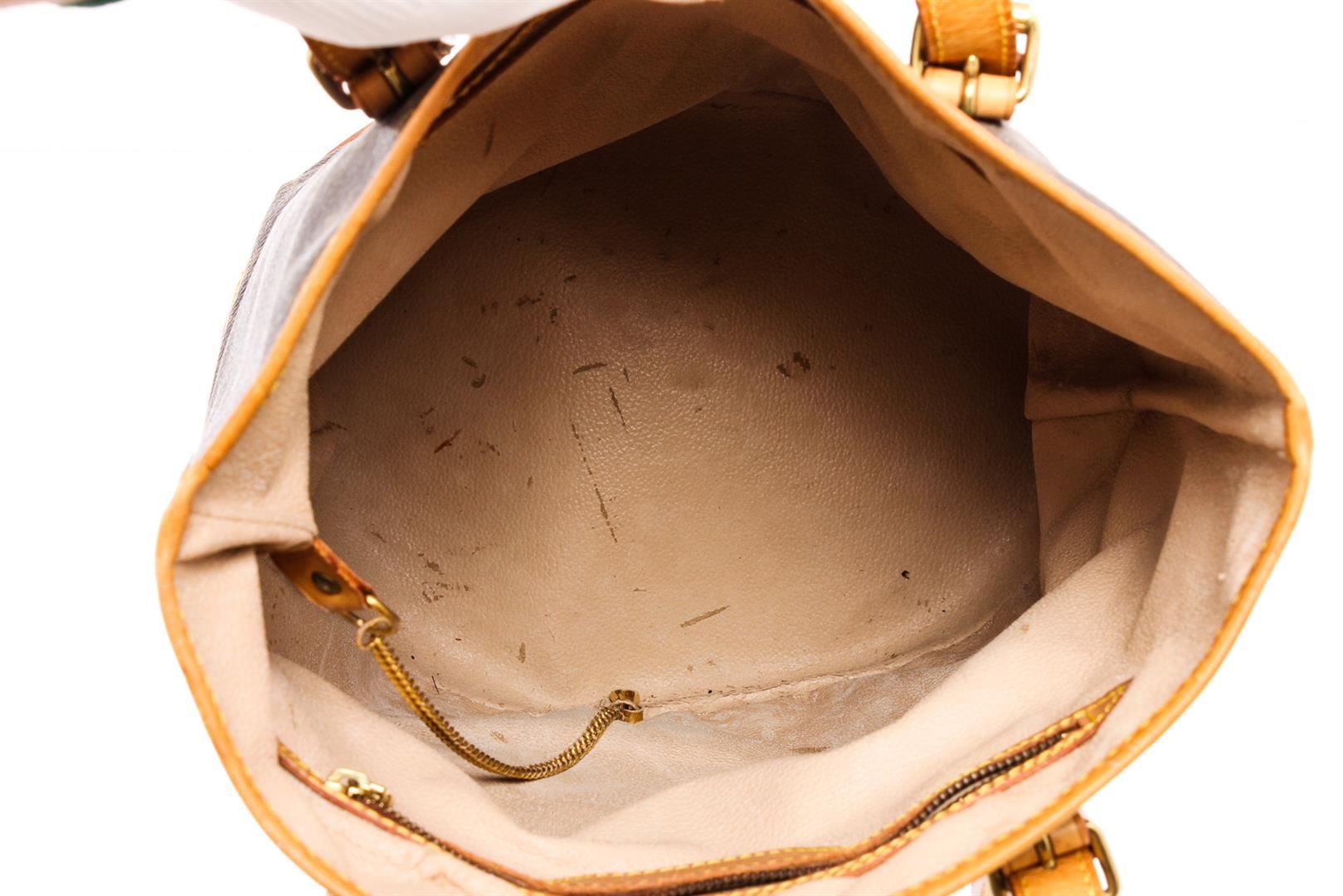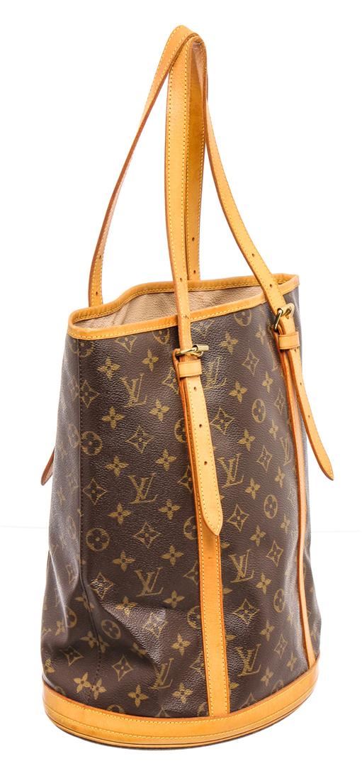Brown and tan monogram Louis Vuitton Bucket GM with brass hardware, tan vachetta leather accents, dual flat shoulder straps, beige Taiga leather interior and dual pockets; one with zip closure at interior walls. PLEASE NOTE: Interior is pealing and sticky.