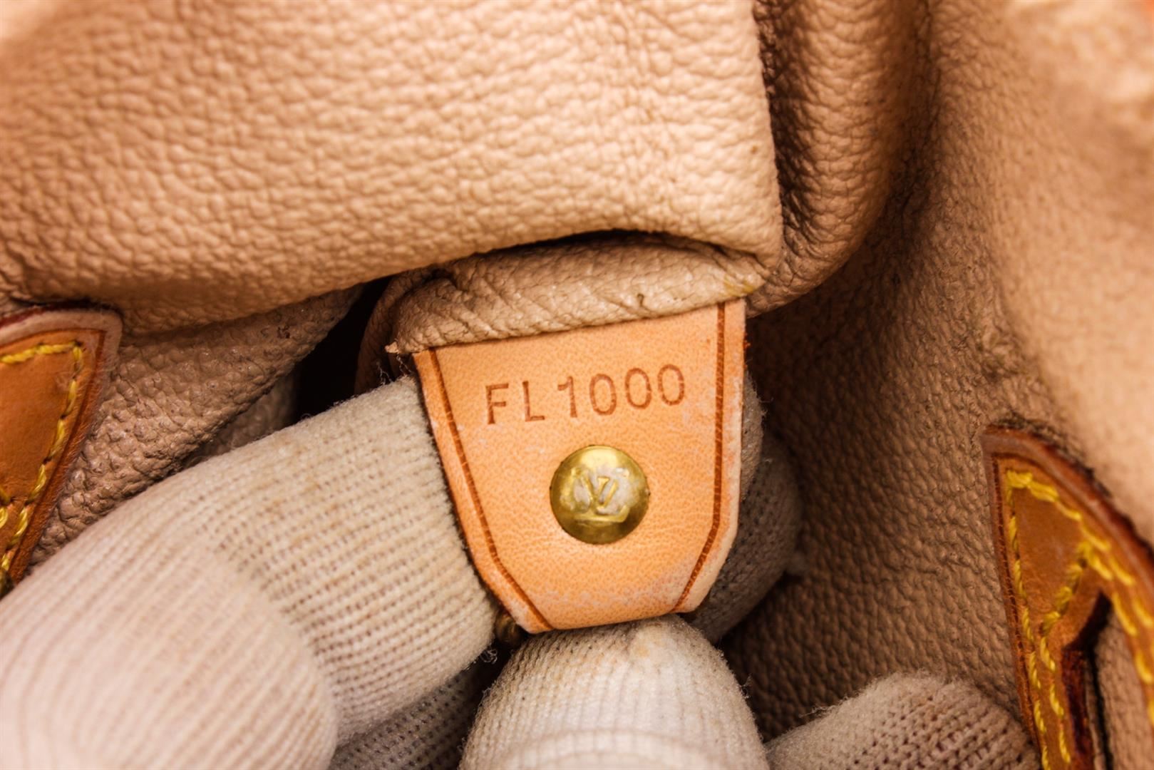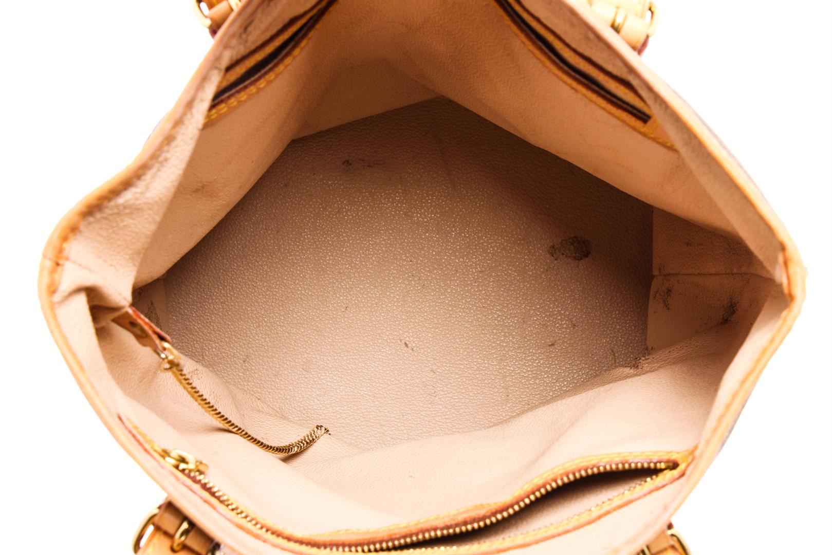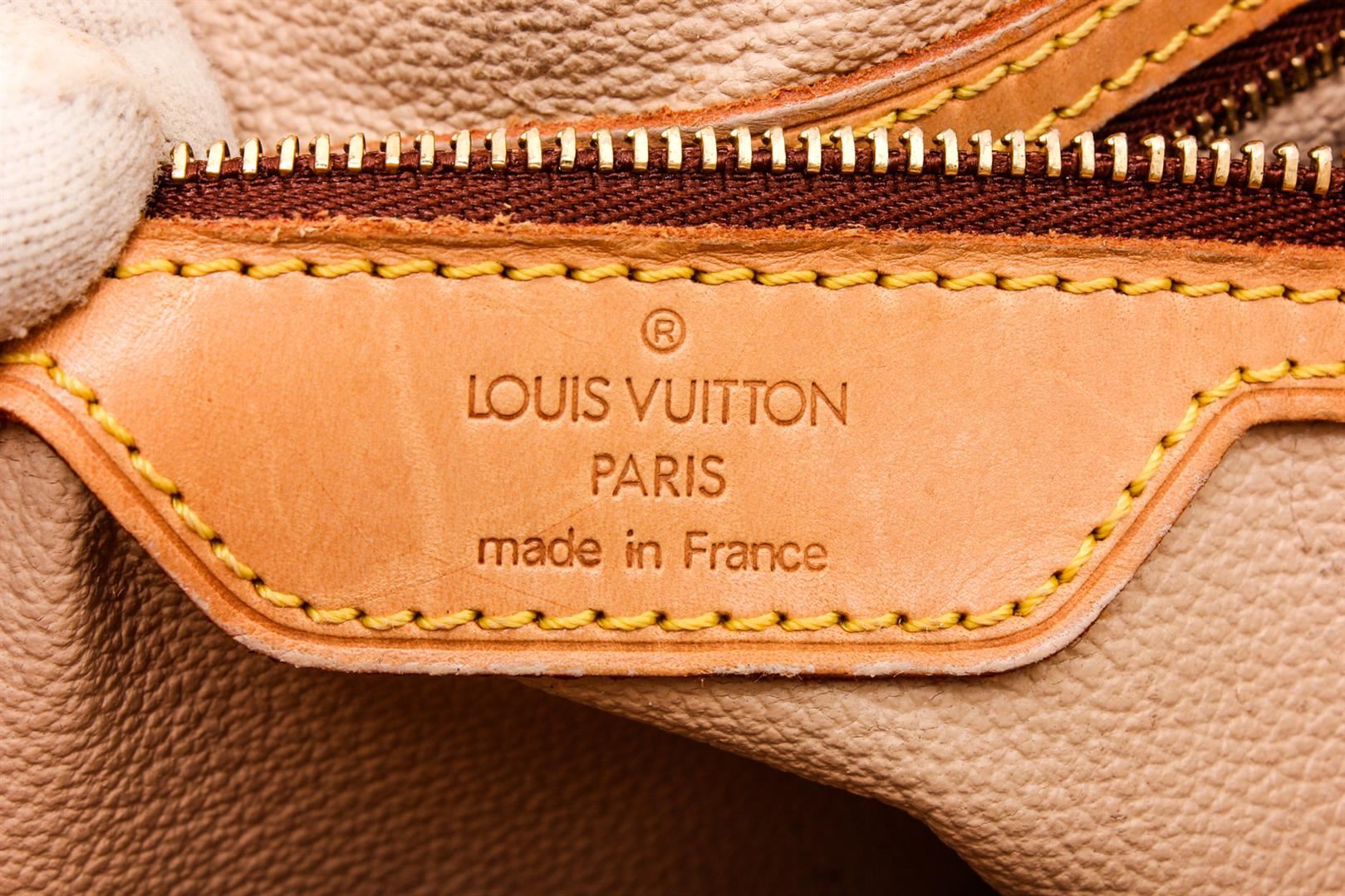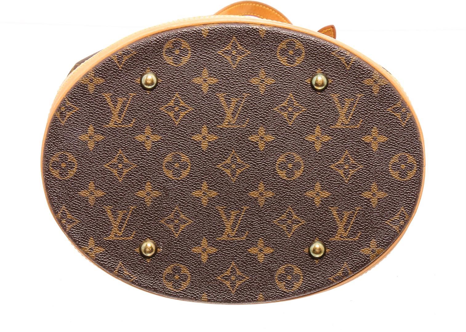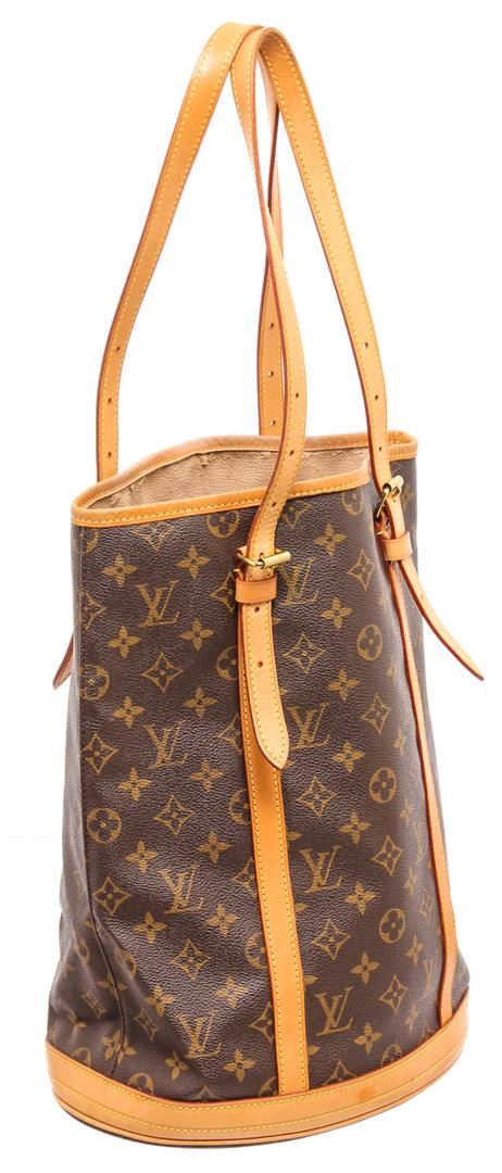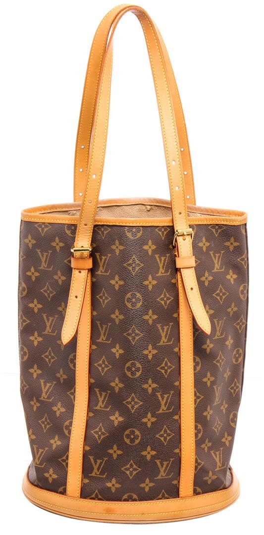 Brown and tan monogram Louis Vuitton Bucket GM with brass hardware, tan vachetta leather accents, dual flat shoulder straps, beige Taiga leather interior and dual pockets; one with zip closure at interior walls. PLEASE NOTE: Interior is pealing and sticky.