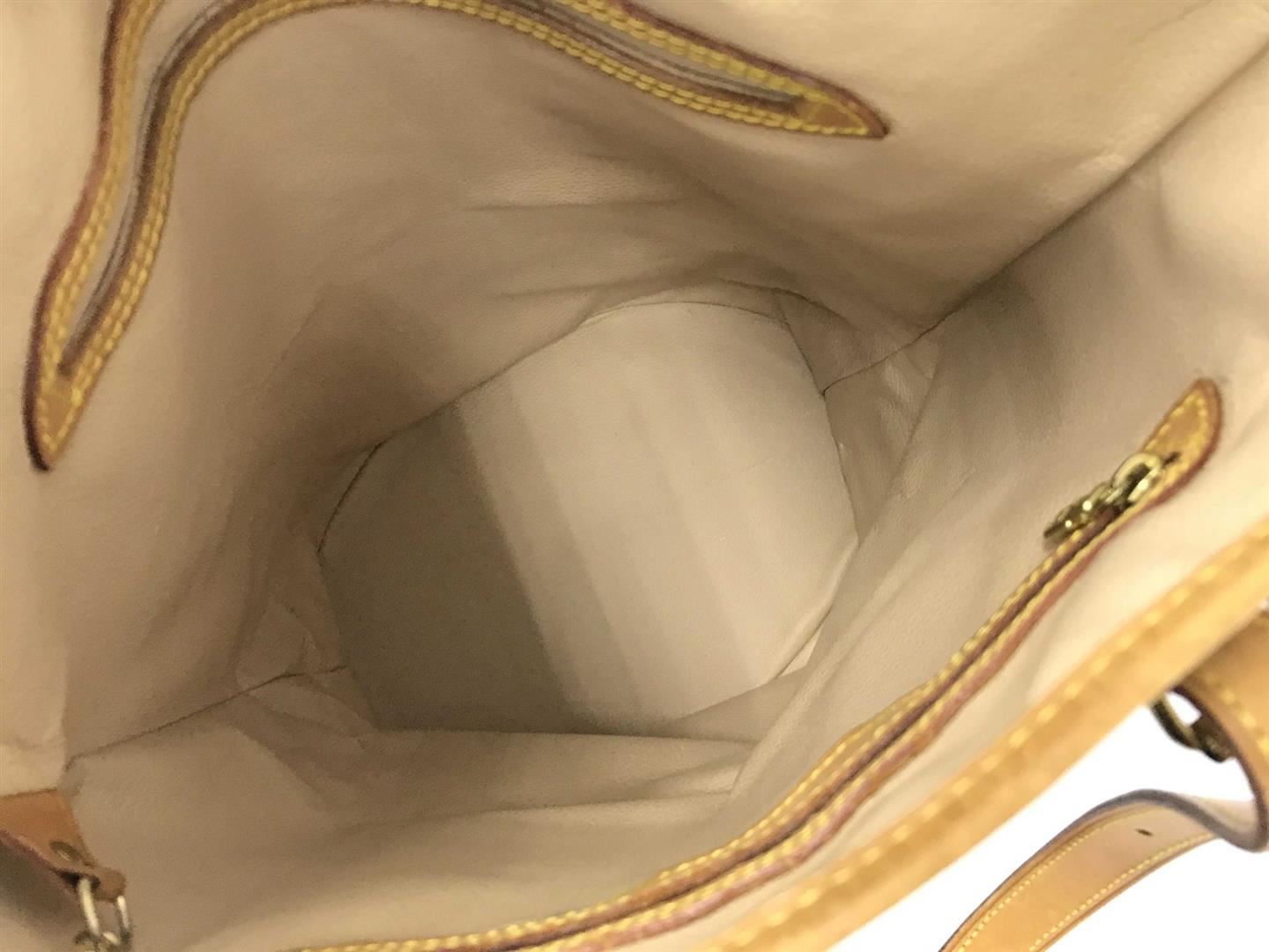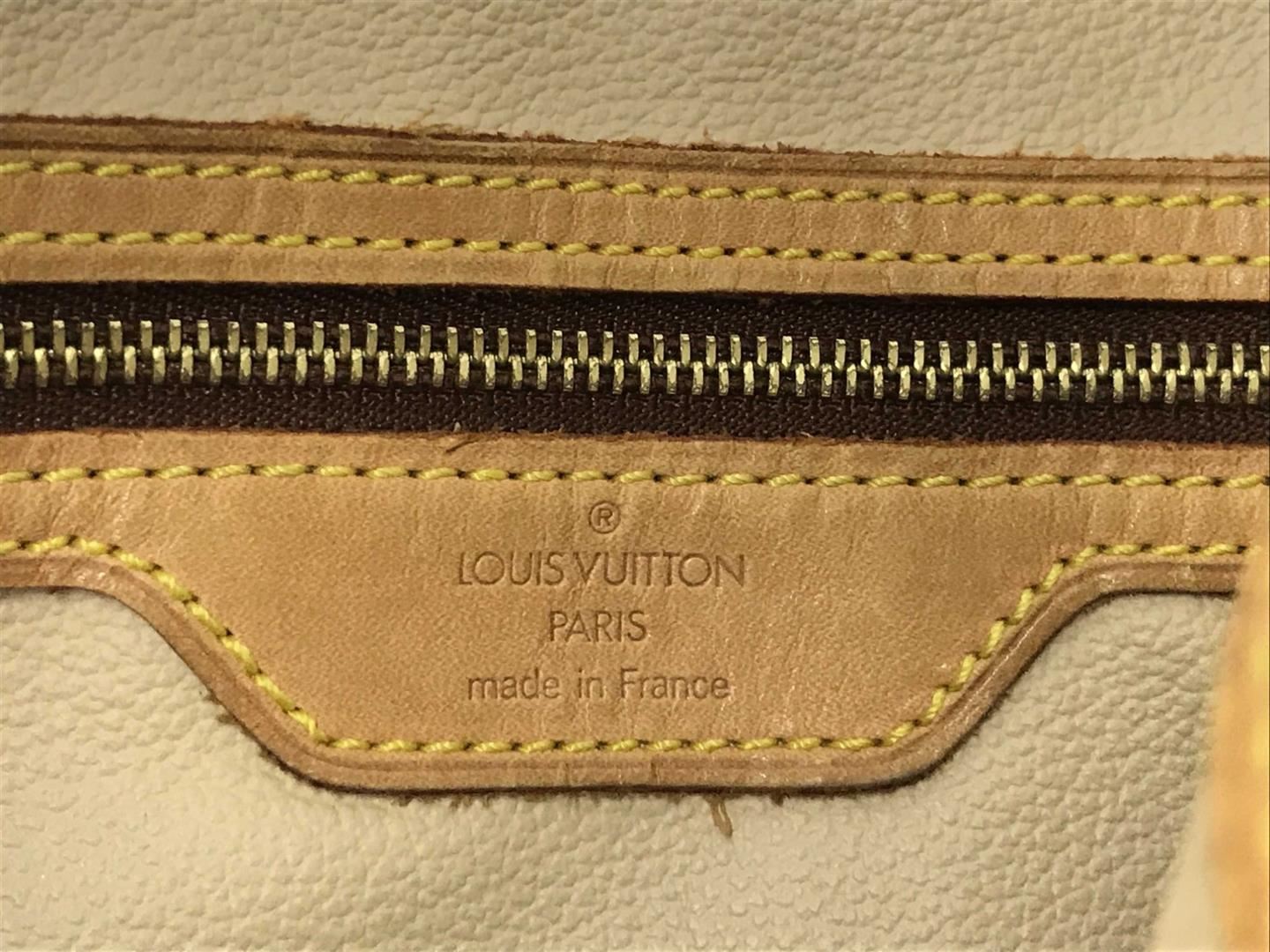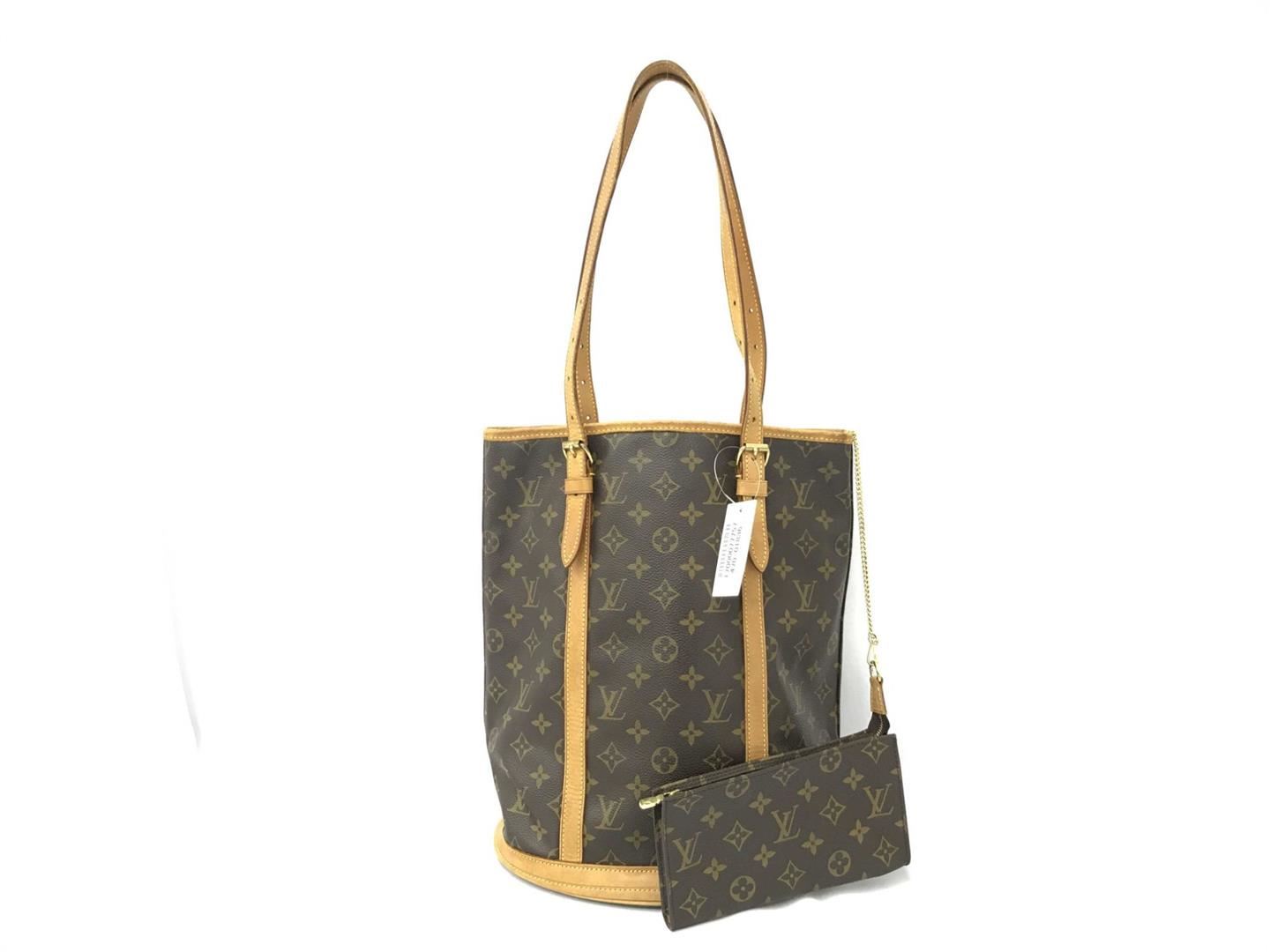 Brown and tan monogram Louis Vuitton Bucket GM with brass hardware, tan vachetta leather accents, dual flat shoulder straps, beige Taiga leather interior and dual pockets; one with zip closure at interior walls.
