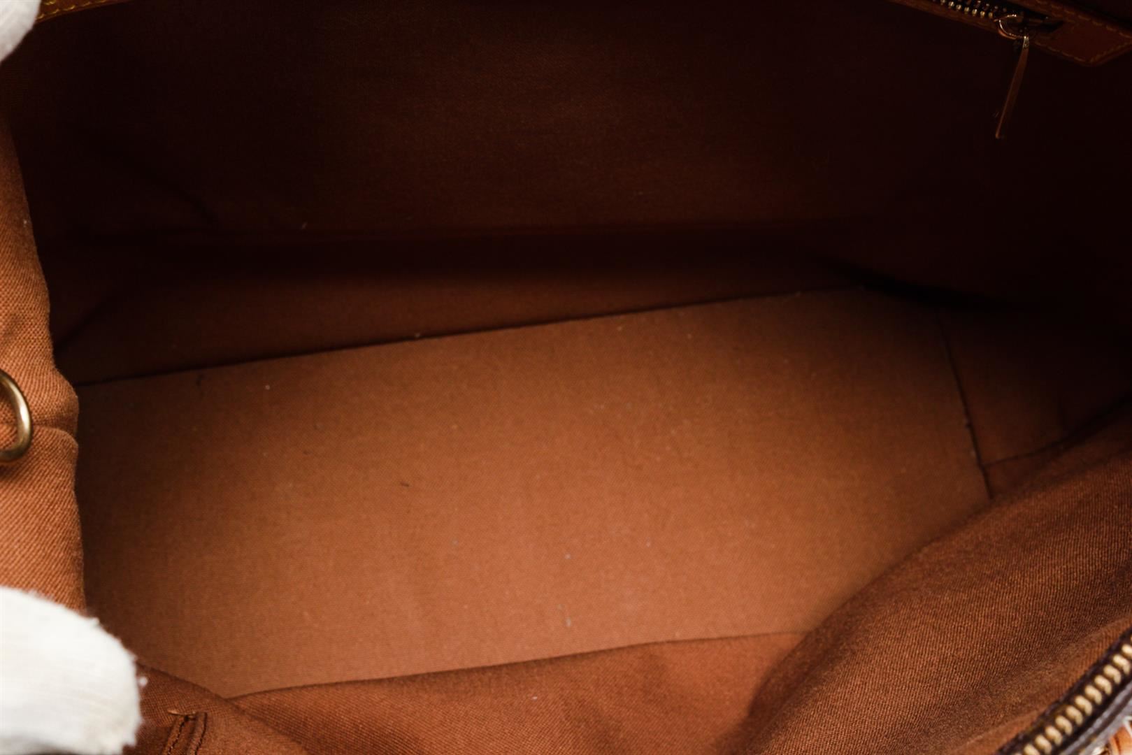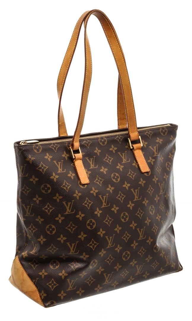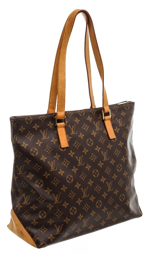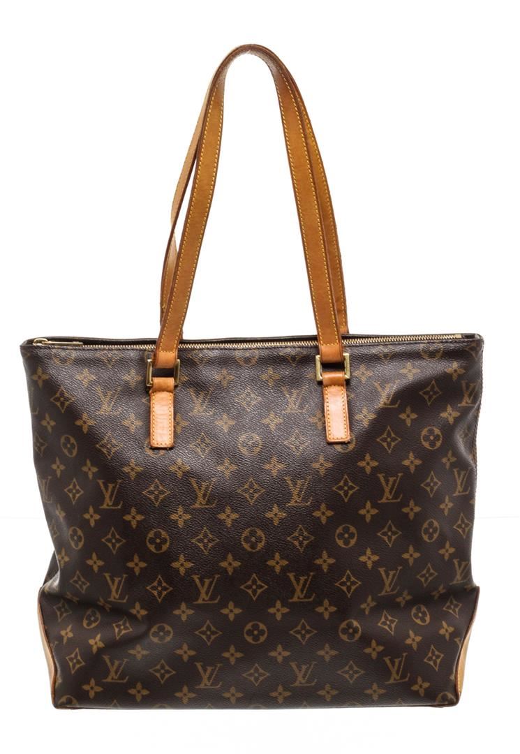 Brown and tan monogram coated canvas Louis Vuitton Cabas Mezzo tote with brass hardware, tan vachetta leather trim, dual flat shoulder straps, brown canvas lining, dual interior wall pockets; one with zip closure and zip closure at top.