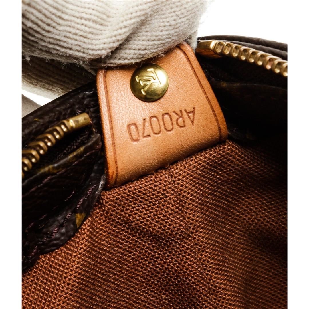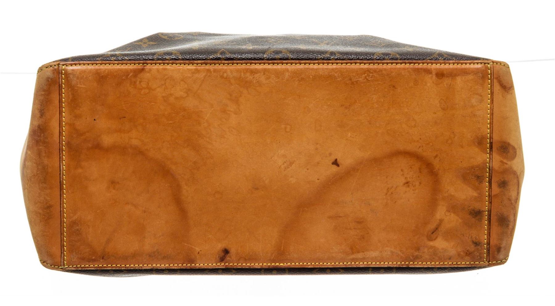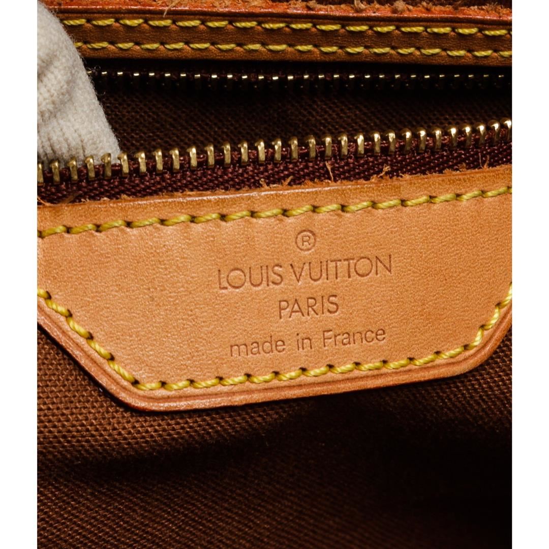 Brown and tan monogram coated canvas Louis Vuitton Cabas Mezzo tote with brass hardware, tan vachetta leather trim, dual flat shoulder straps, brown canvas lining, dual interior wall pockets; one with zip closure and zip closure at top.