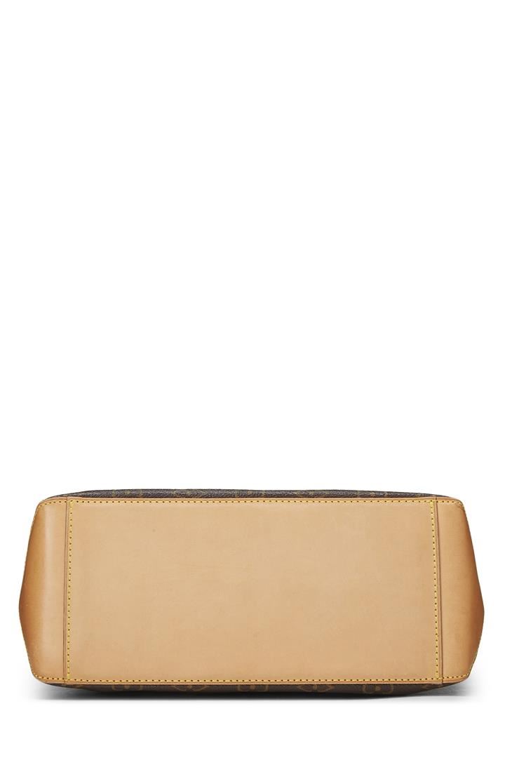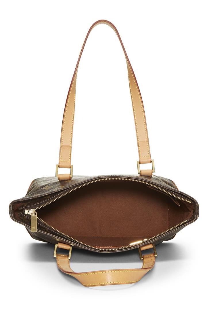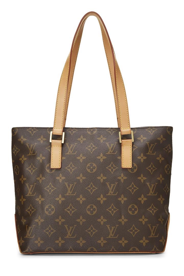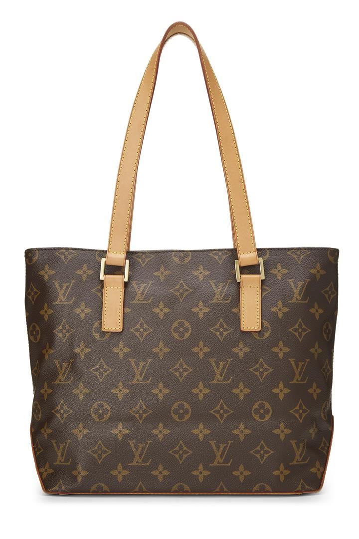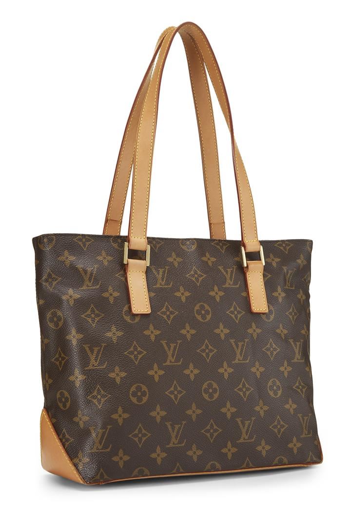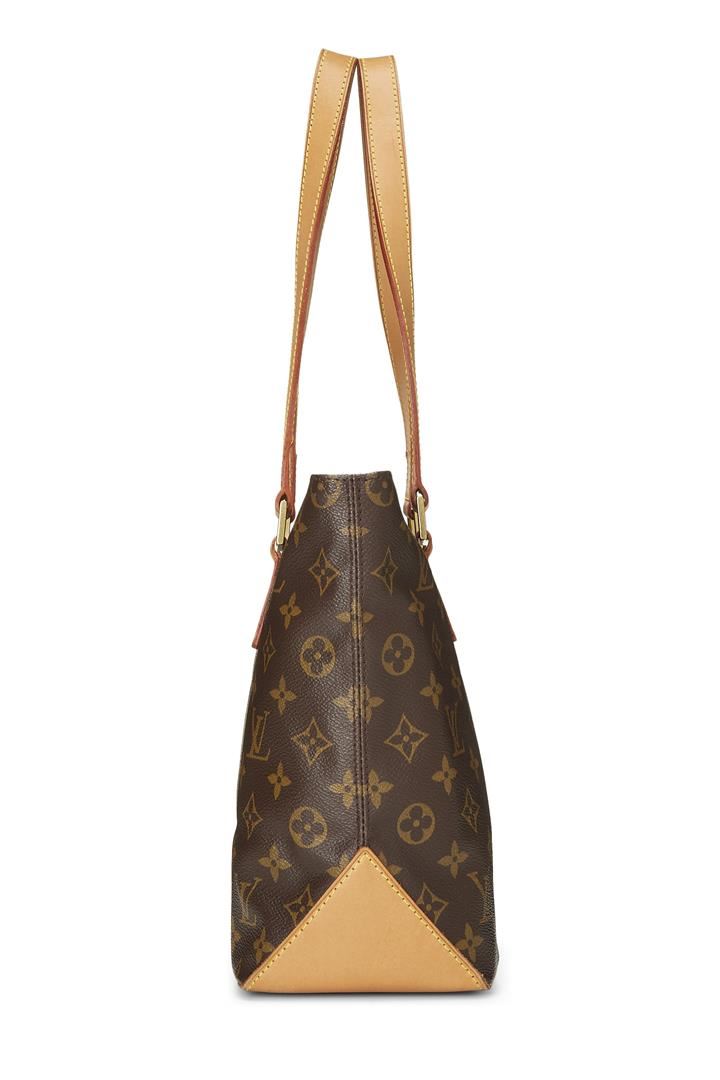 One Louis Vuitton Monogram Canvas Leather Cabas Piano Shoulder Bag. Brown and tan monogram coated canvas Louis Vuitton Cabas Piano tote with brass hardware, tan vachetta leather trim, dual flat shoulder straps, brown canvas lining, dual pockets at interior wall; one with zip closure and zip closure at top.