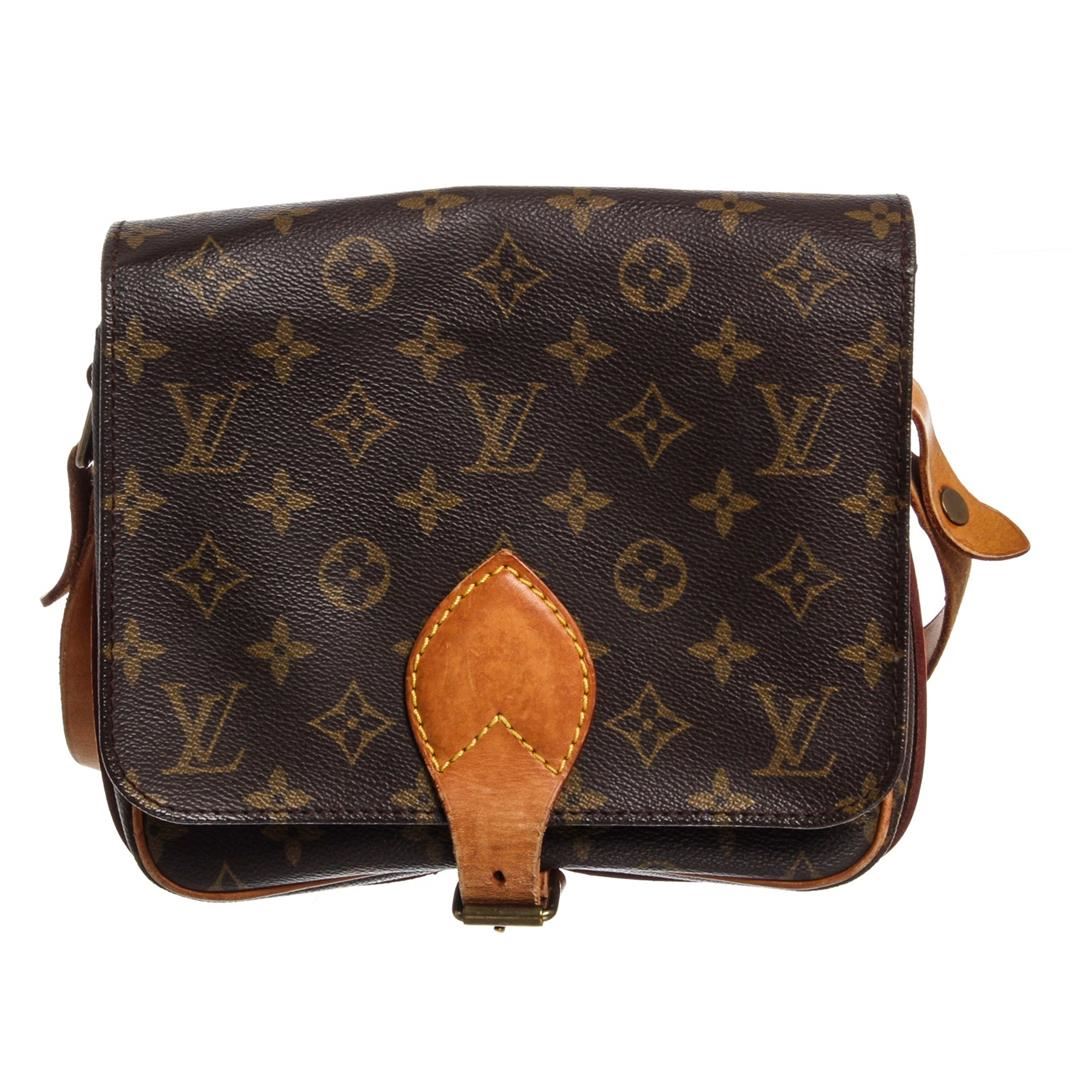 Brown and tan monogram coated canvas Louis Vuitton Cartouchière MM with brass hardware, tan vachetta leather trim, single adjustable shoulder strap, brown Taiga leather interior, dual interior compartments and flap with buckle closure at front.