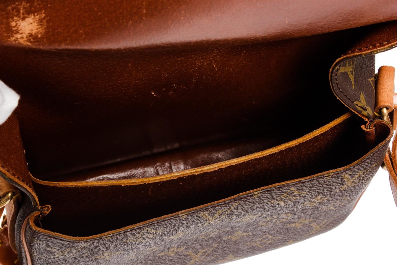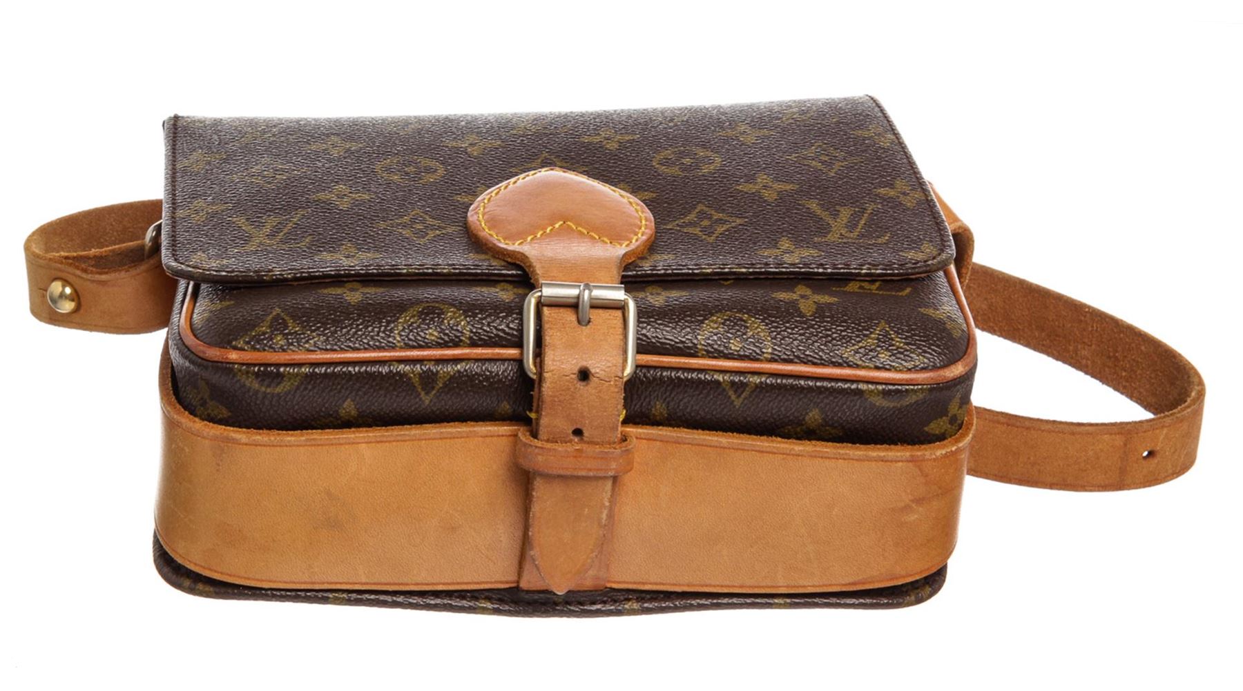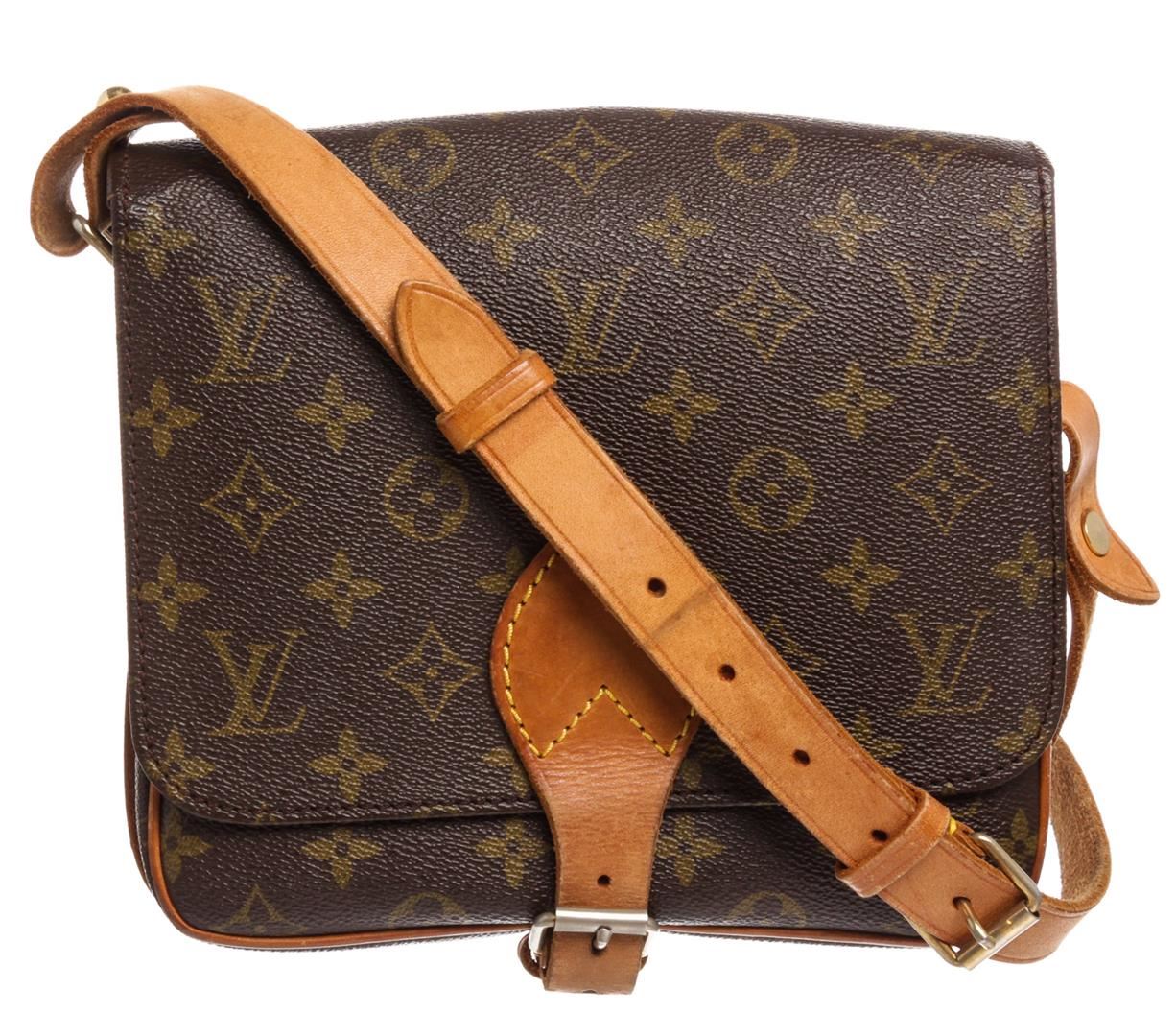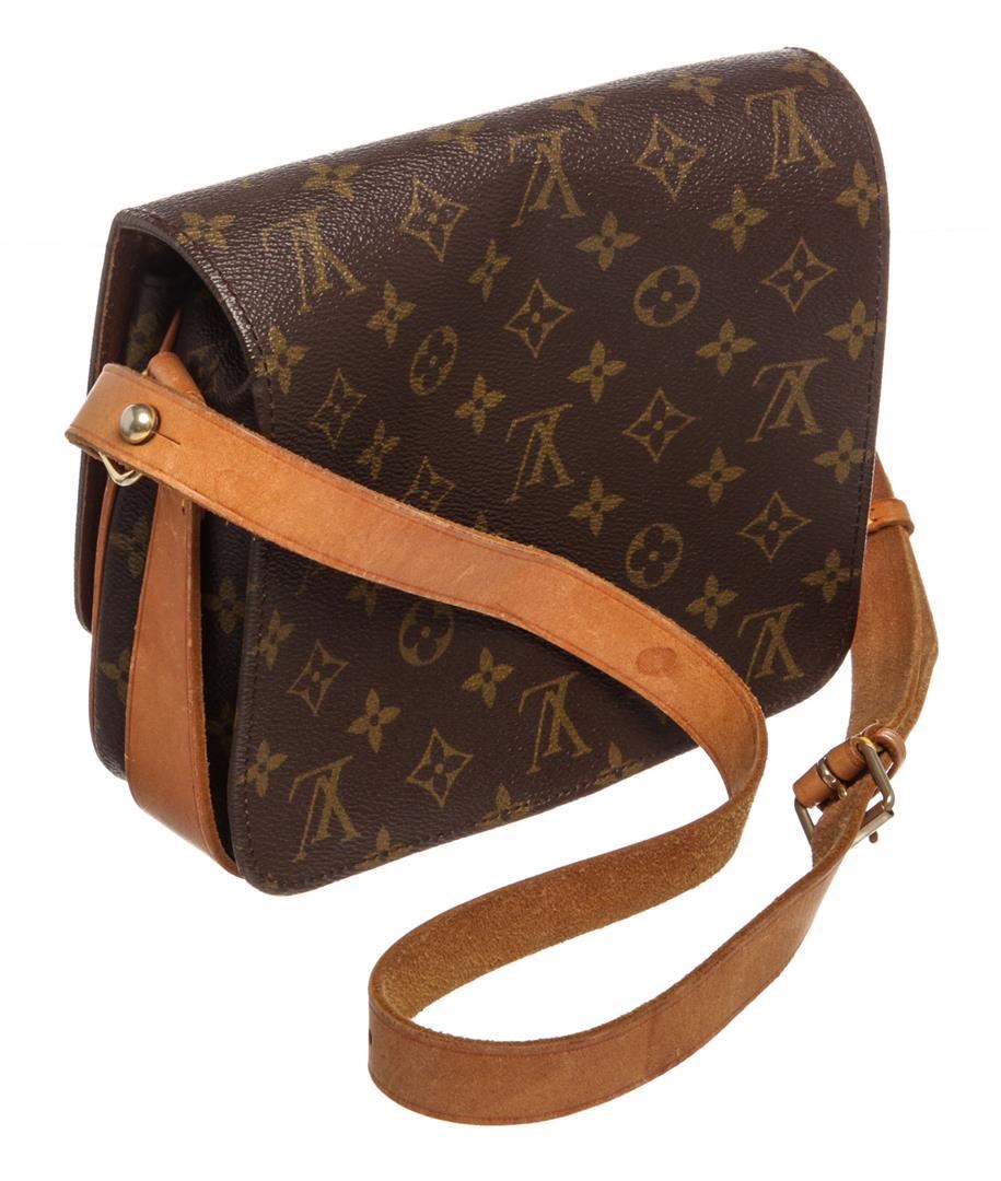 Brown and tan monogram coated canvas Louis Vuitton Cartouchière MM with brass hardware, tan vachetta leather trim, single adjustable shoulder strap, brown Taiga leather interior, dual interior compartments and flap with buckle closure at front