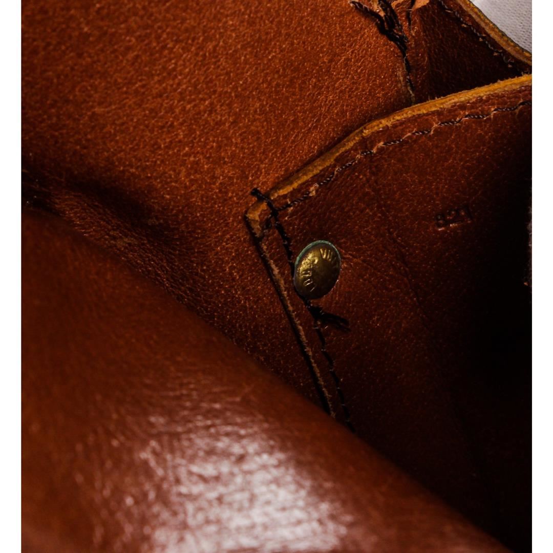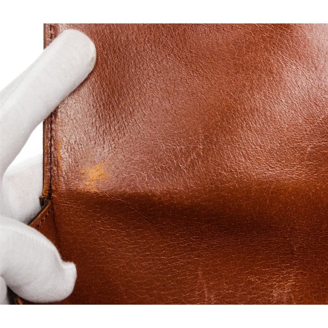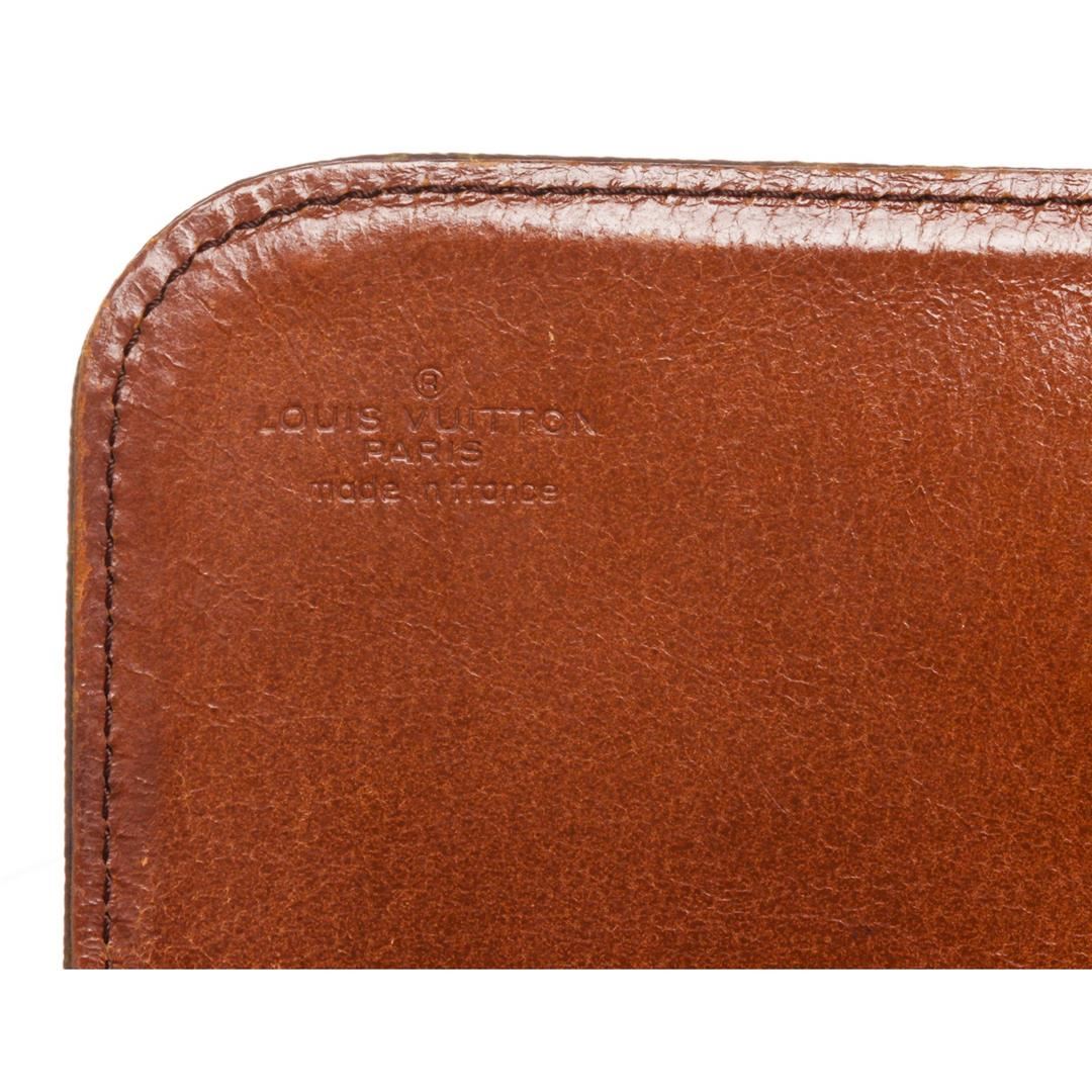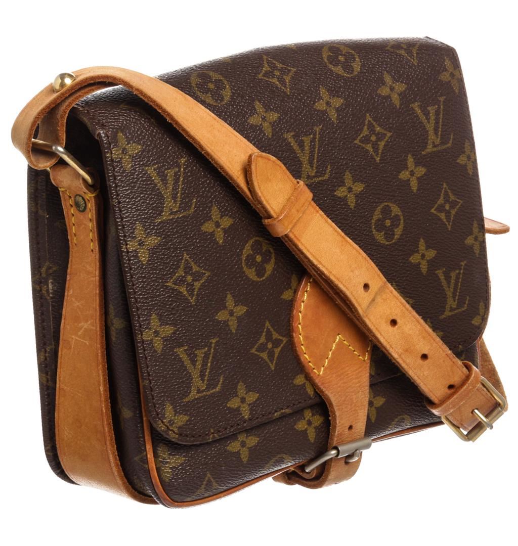 Brown and tan monogram coated canvas Louis Vuitton Cartouchière MM with brass hardware, tan vachetta leather trim, single adjustable shoulder strap, brown Taiga leather interior, dual interior compartments and flap with buckle closure at front