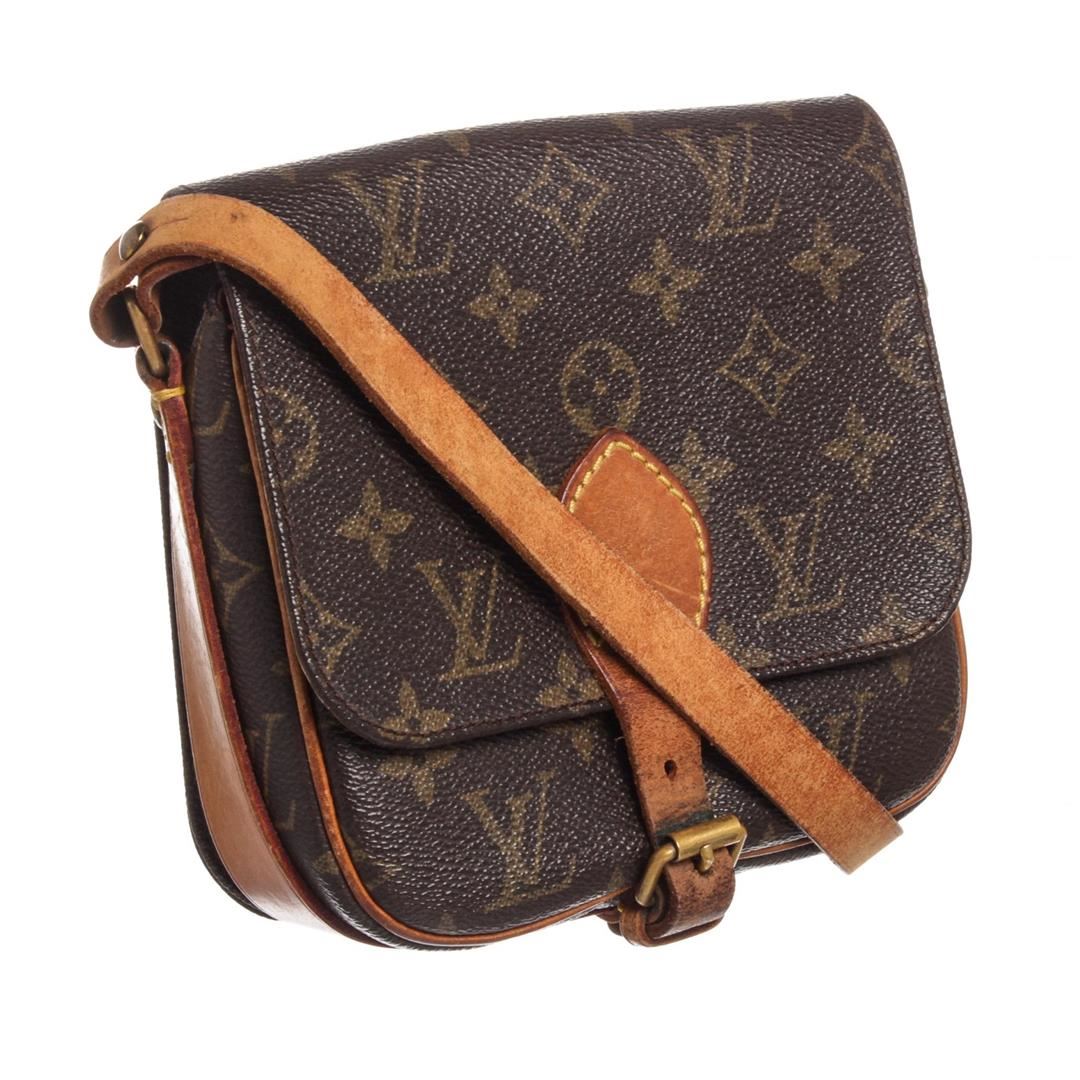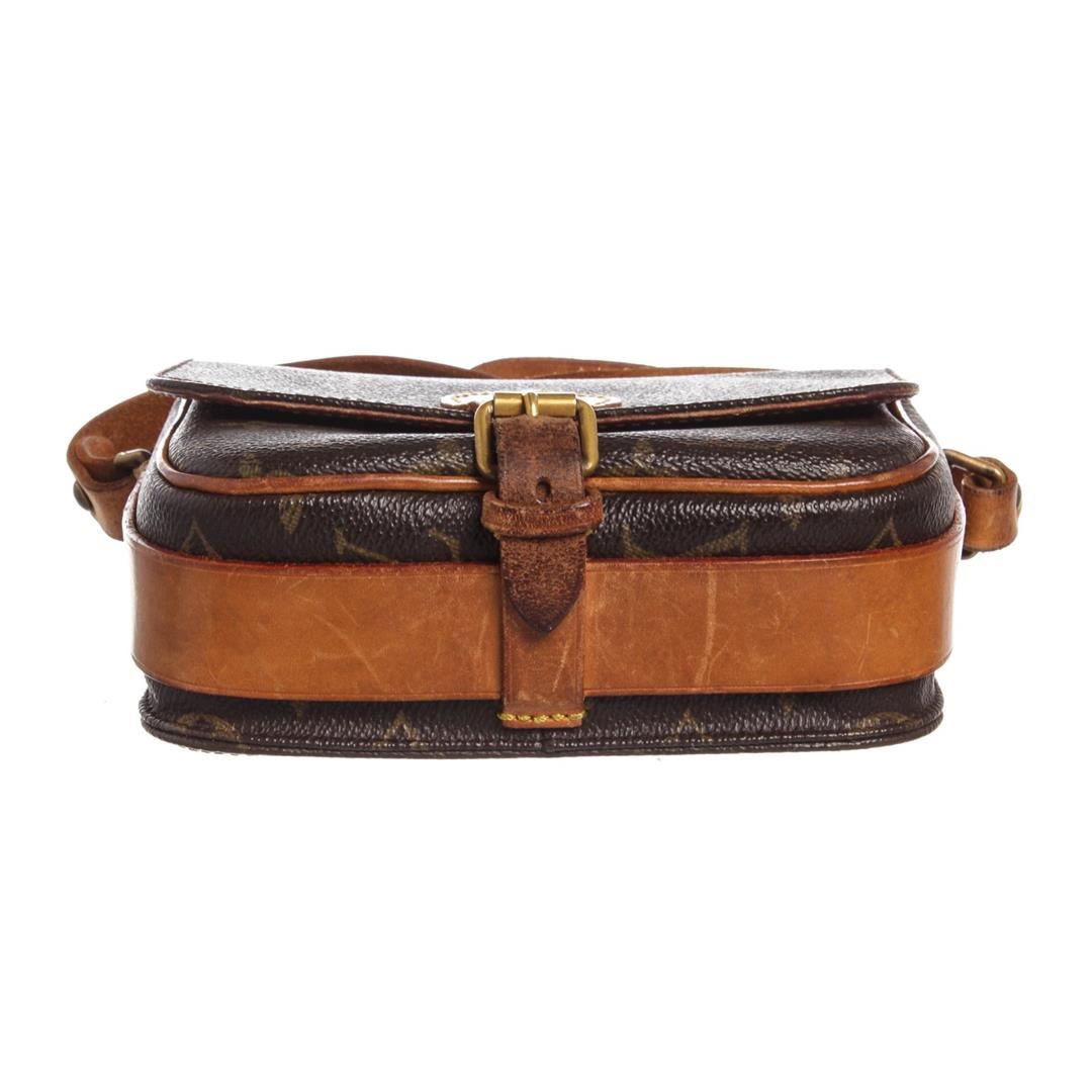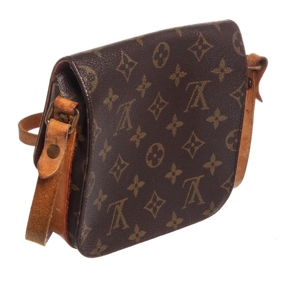 Brown and tan coated canvas monogram Louis Vuitton Monogram Vintage Cartouchière PM with brass hardware, tan Vachetta leather trim, tonal stitching, single flat shoulder strap, brown leather lining, dual compartments at interior and buckle closure at front flap.