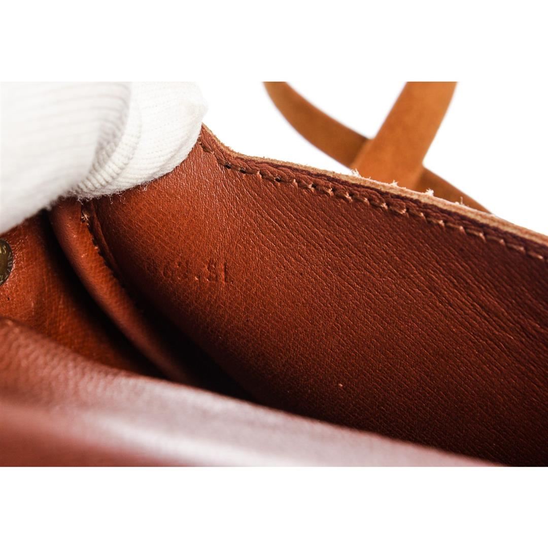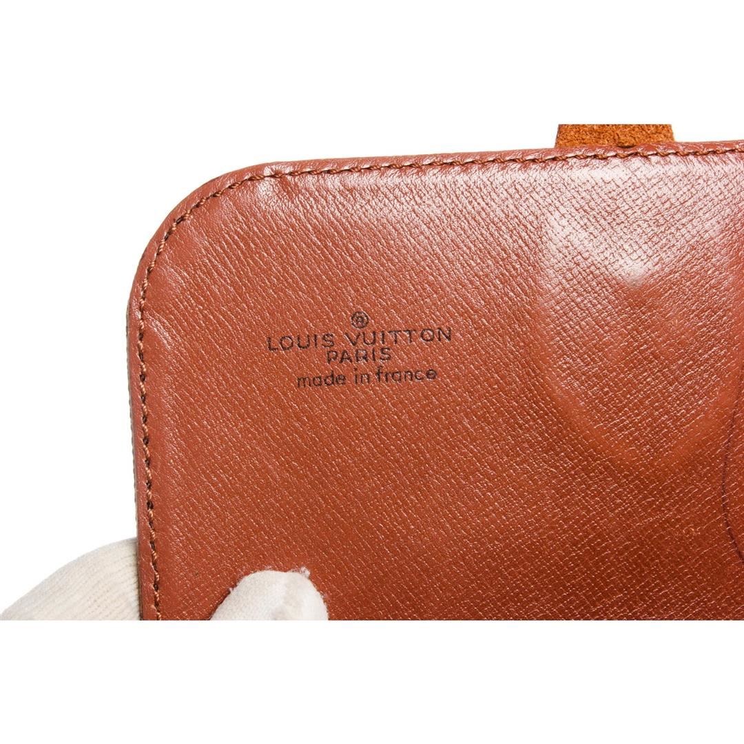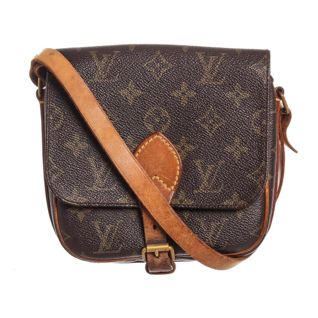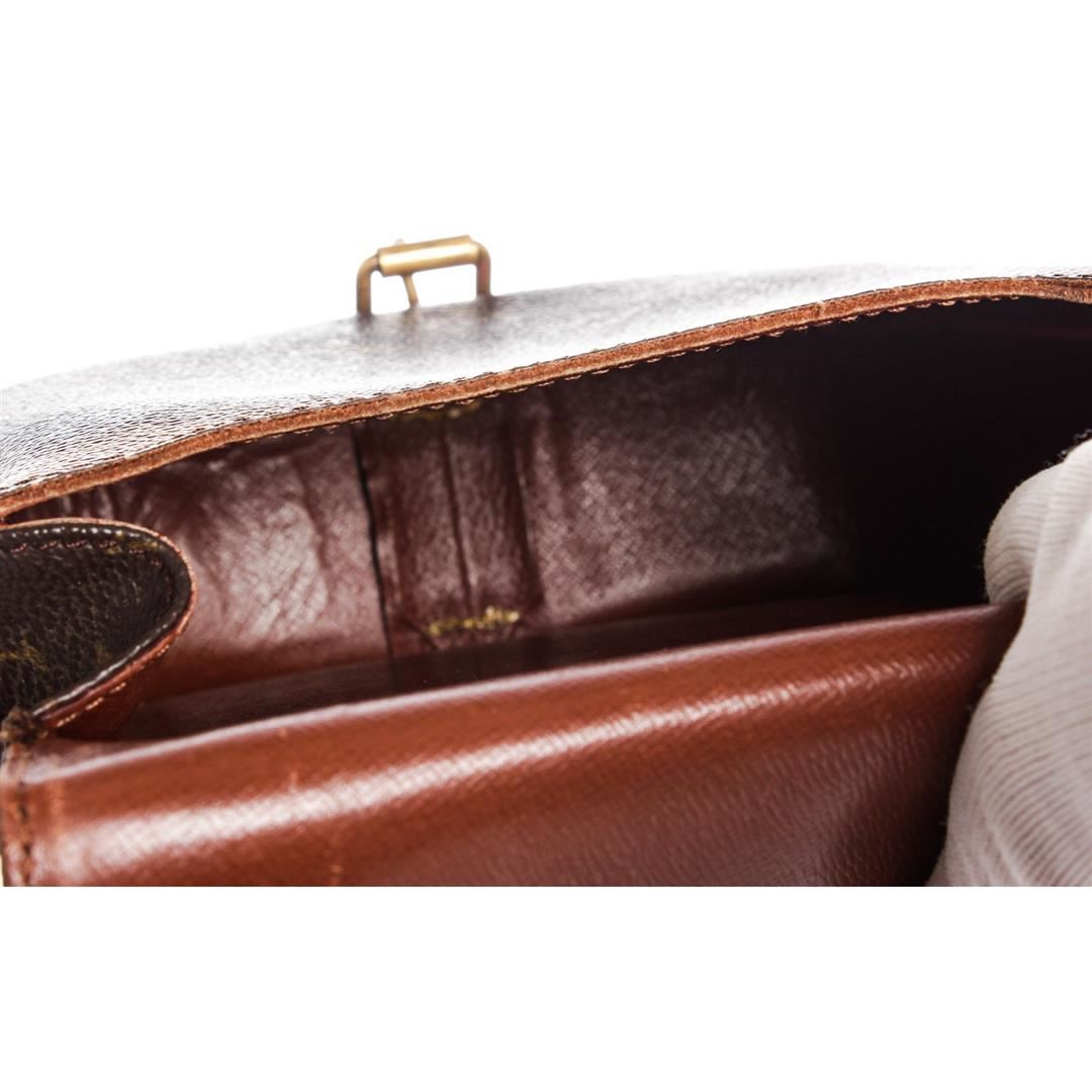 Brown and tan coated canvas monogram Louis Vuitton Monogram Vintage Cartouchière PM with brass hardware, tan Vachetta leather trim, tonal stitching, single flat shoulder strap, brown leather lining, dual compartments at interior and buckle closure at front flap.