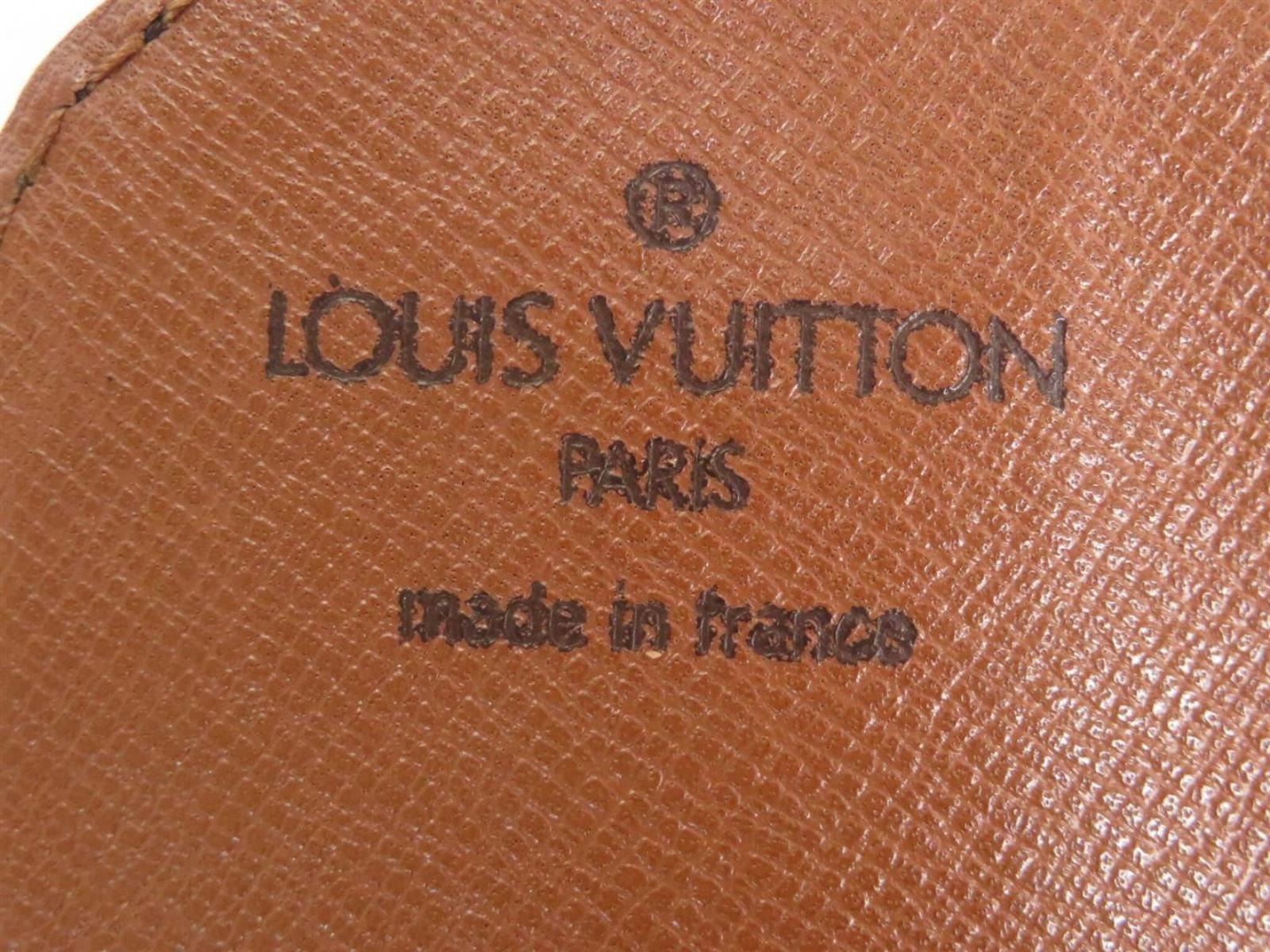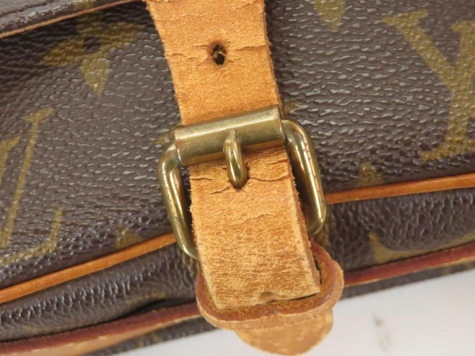 Brown and tan coated canvas monogram Louis Vuitton Monogram Vintage Cartouchière PM with gold-tone hardware, tan Vachetta leather trim, tonal stitching, single flat shoulder strap, brown leather lining, dual compartments at interior and buckle closure at