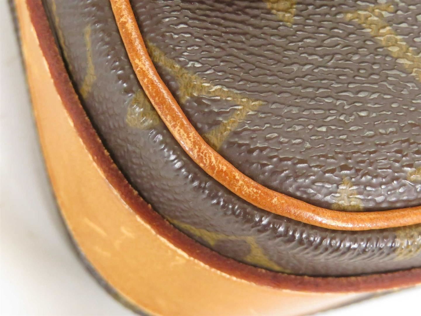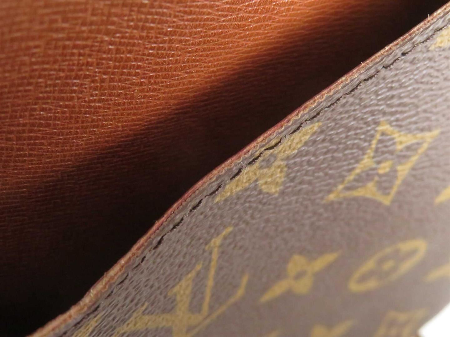 Brown and tan coated canvas monogram Louis Vuitton Monogram Vintage Cartouchière PM with gold-tone hardware, tan Vachetta leather trim, tonal stitching, single flat shoulder strap, brown leather lining, dual compartments at interior and buckle closure at