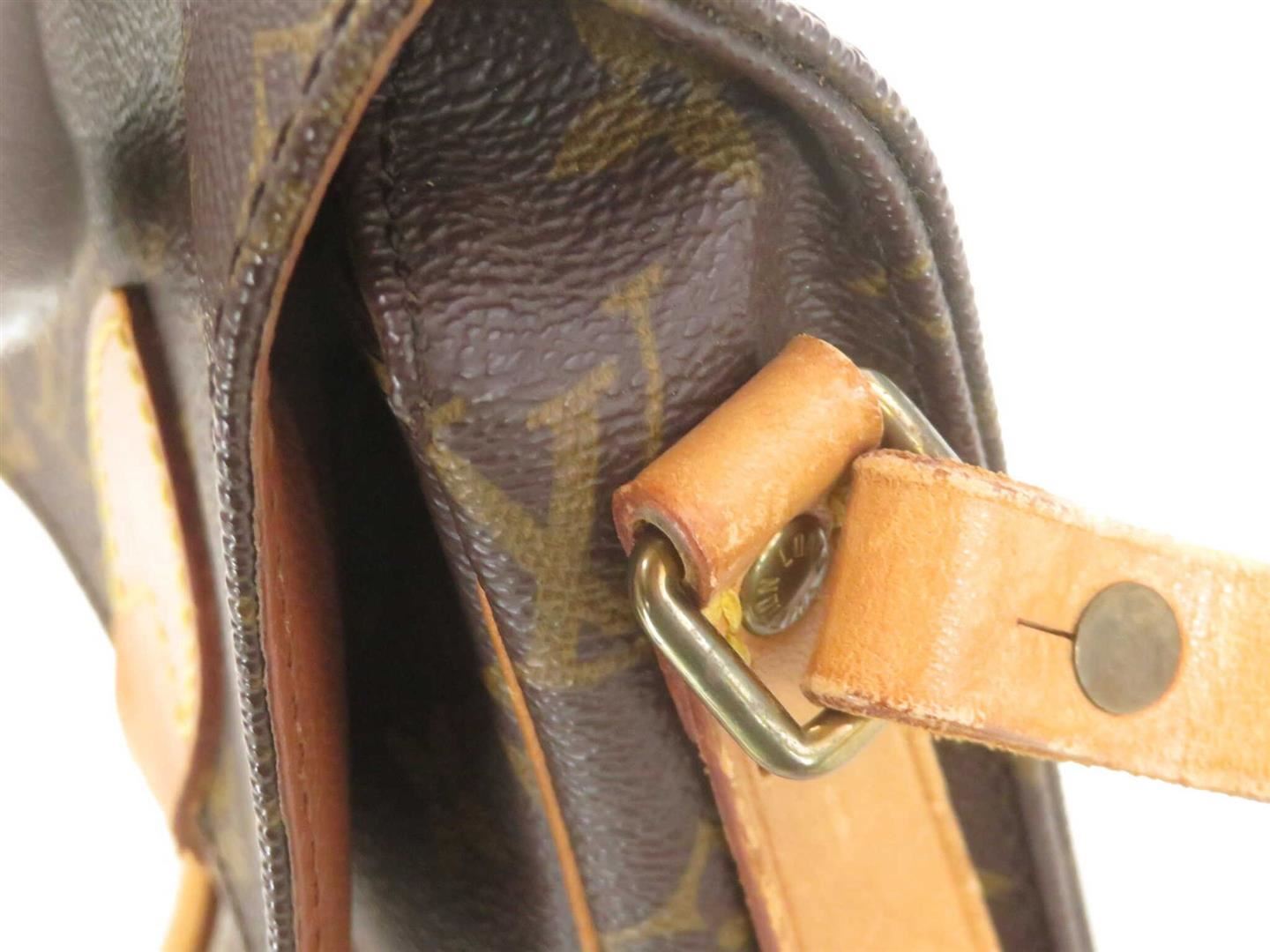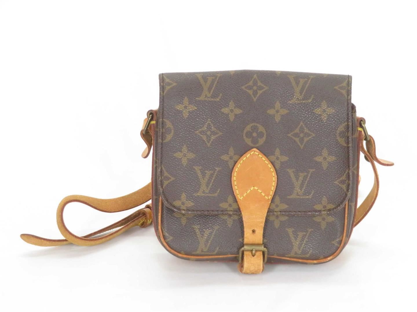 Brown and tan coated canvas monogram Louis Vuitton Monogram Vintage Cartouchière PM with gold-tone hardware, tan Vachetta leather trim, tonal stitching, single flat shoulder strap, brown leather lining, dual compartments at interior and buckle closure at front flap.