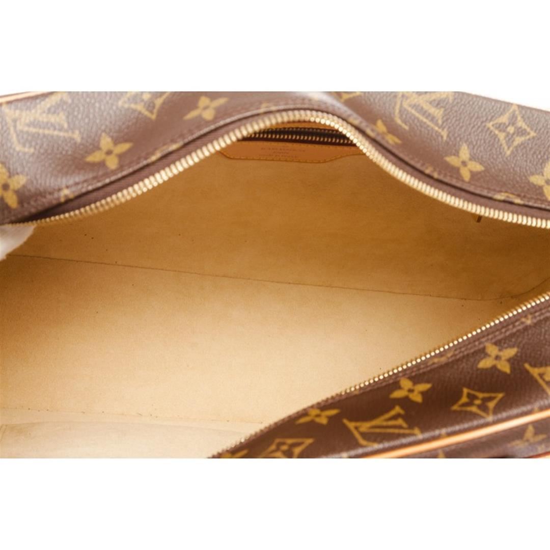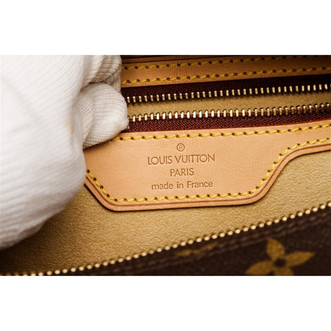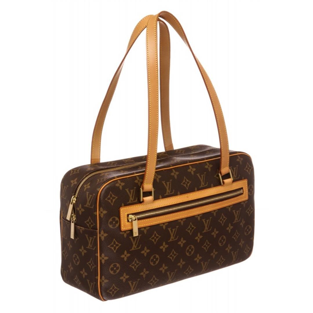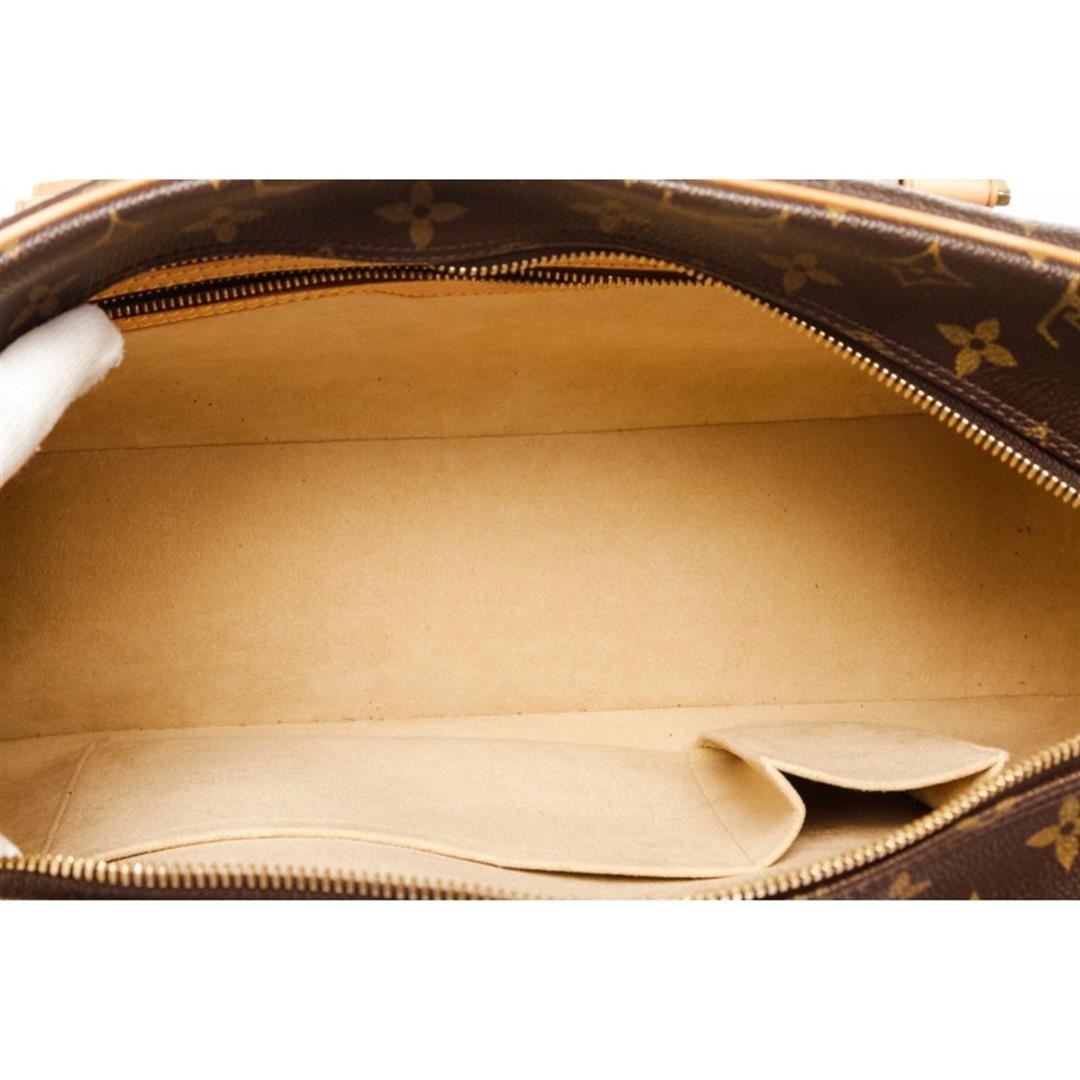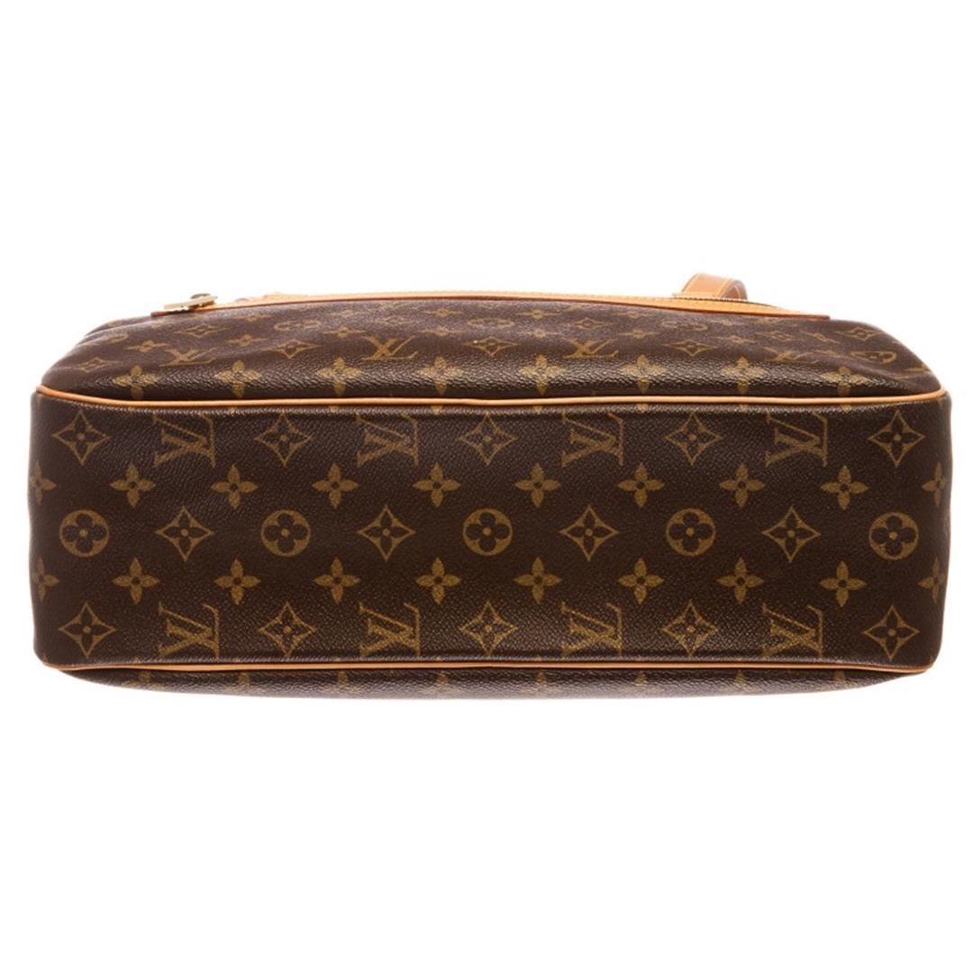 Brown and tan monogram coated canvas Louis Vuitton Cite GM with brass hardware, tan vachetta trim, single zip pocket at exterior, dual flat shoulder straps, beige Alcantara lining, three interior pockets; one with zip closure and two-way zip closure at to