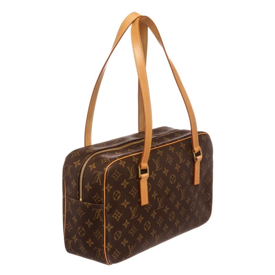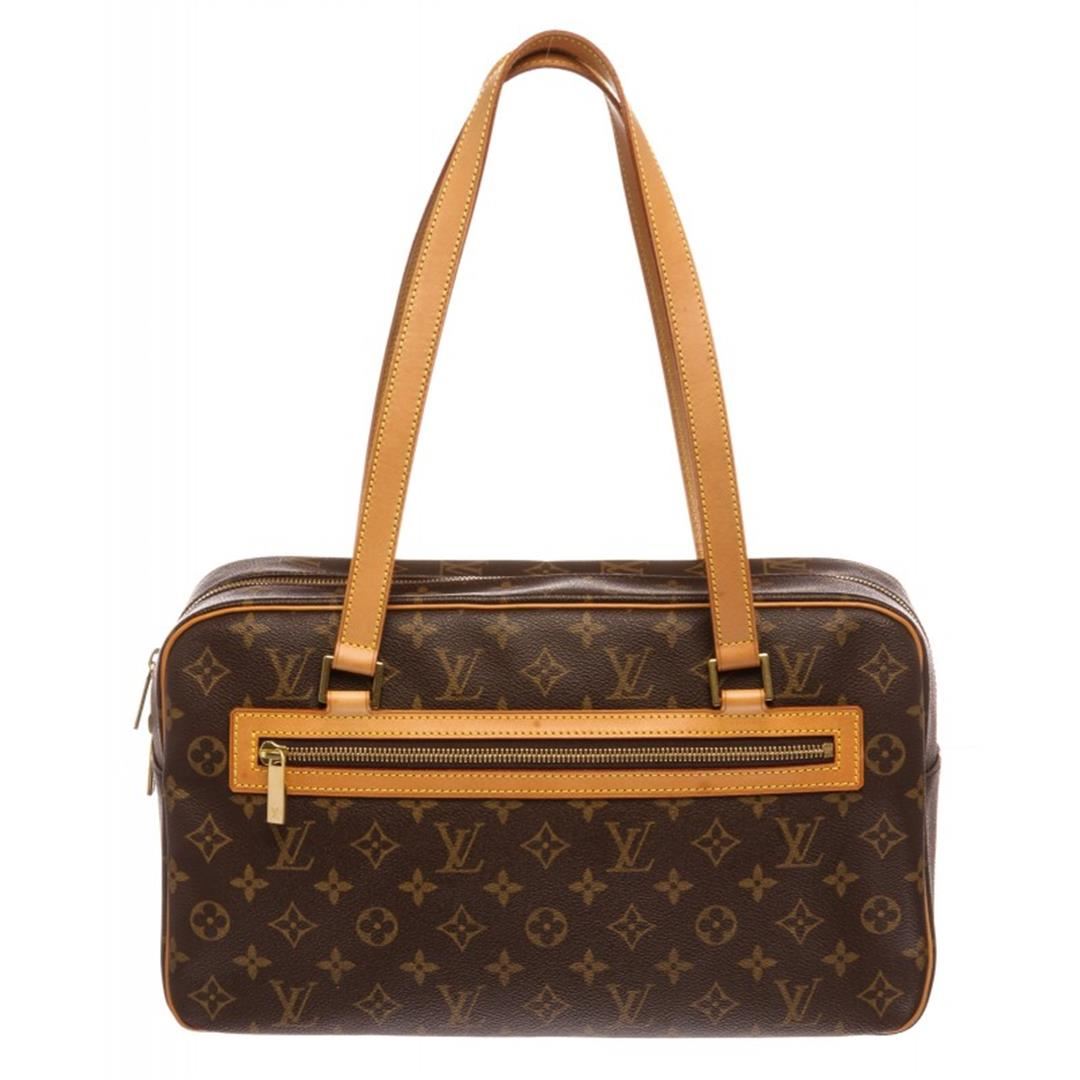 Brown and tan monogram coated canvas Louis Vuitton Cite GM with brass hardware, tan vachetta trim, single zip pocket at exterior, dual flat shoulder straps, beige Alcantara lining, three interior pockets; one with zip closure and two-way zip closure at top. Item is pre-owned.