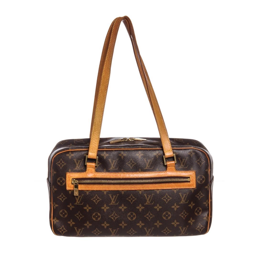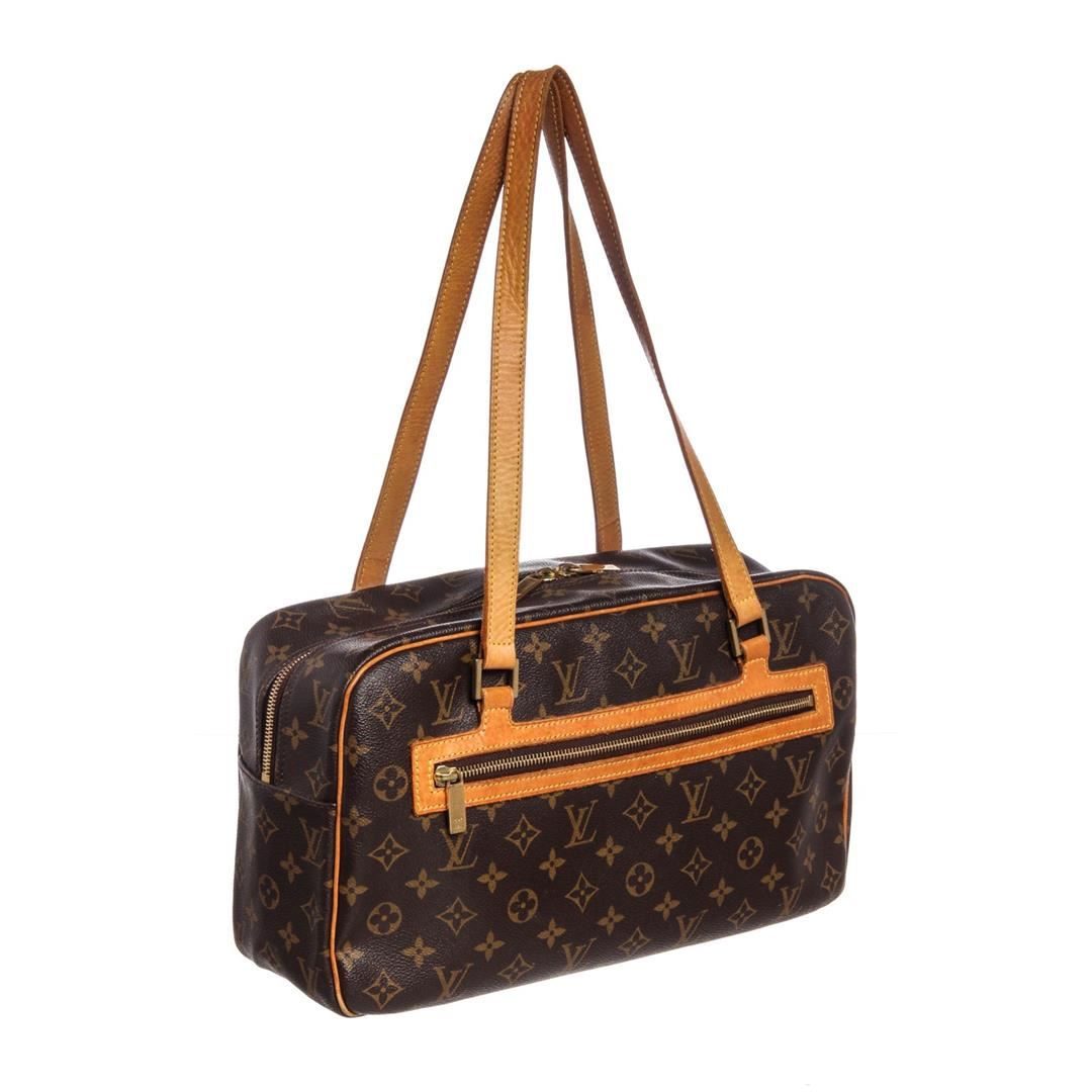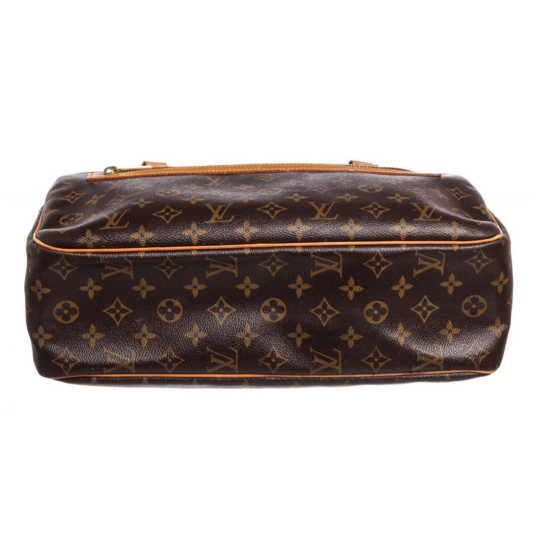 Brown and tan monogram coated canvas Louis Vuitton Cite GM with brass hardware, tan vachetta trim, single zip pocket at exterior, dual flat shoulder straps, beige Alcantara lining, three interior pockets; one with zip closure and two-way zip closure at top. Dimensions = 14"x4"x8.5"Bag Drop:11"/35.5cmx10cmx21.5cmxBag Drop:27.9cm. Item is pre-owned.