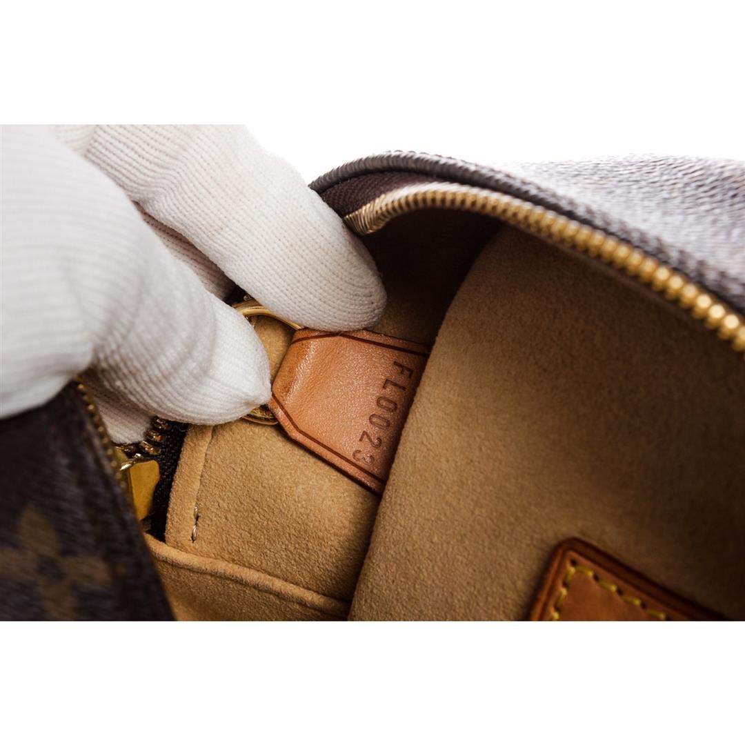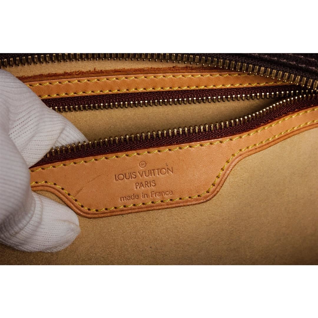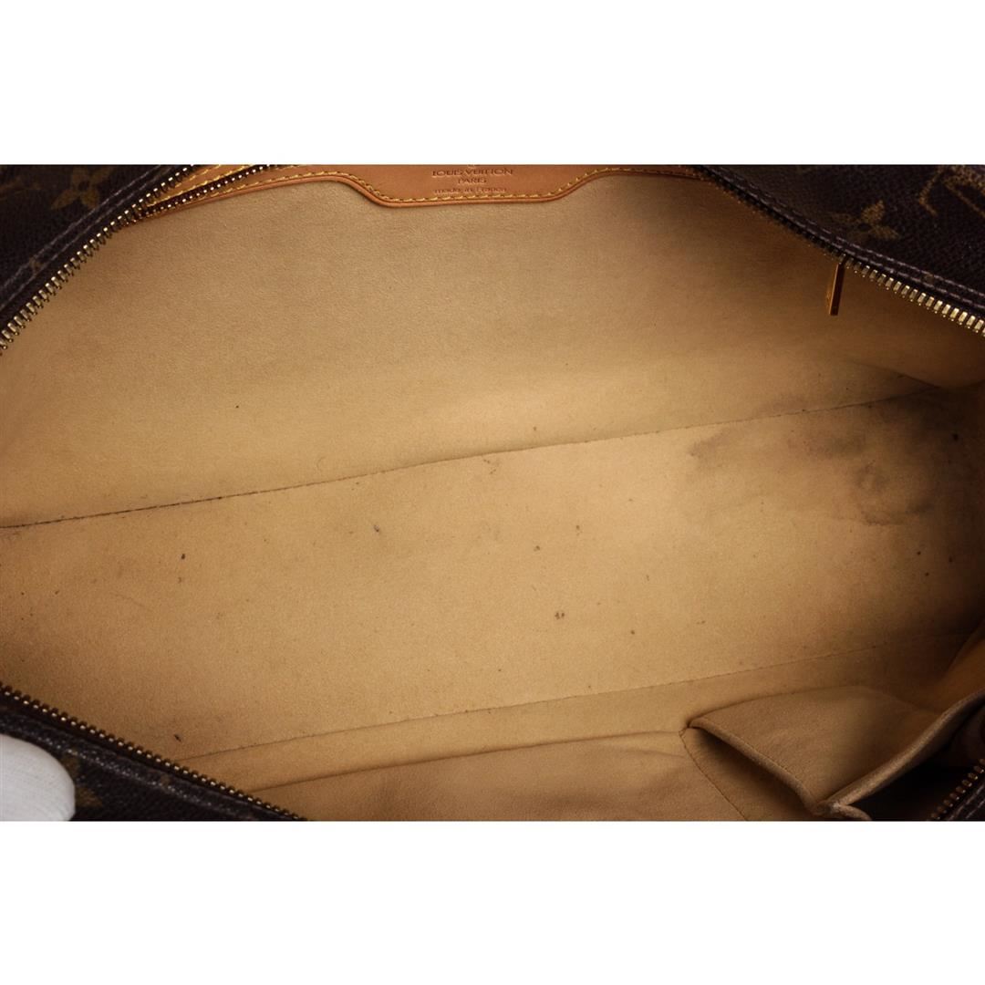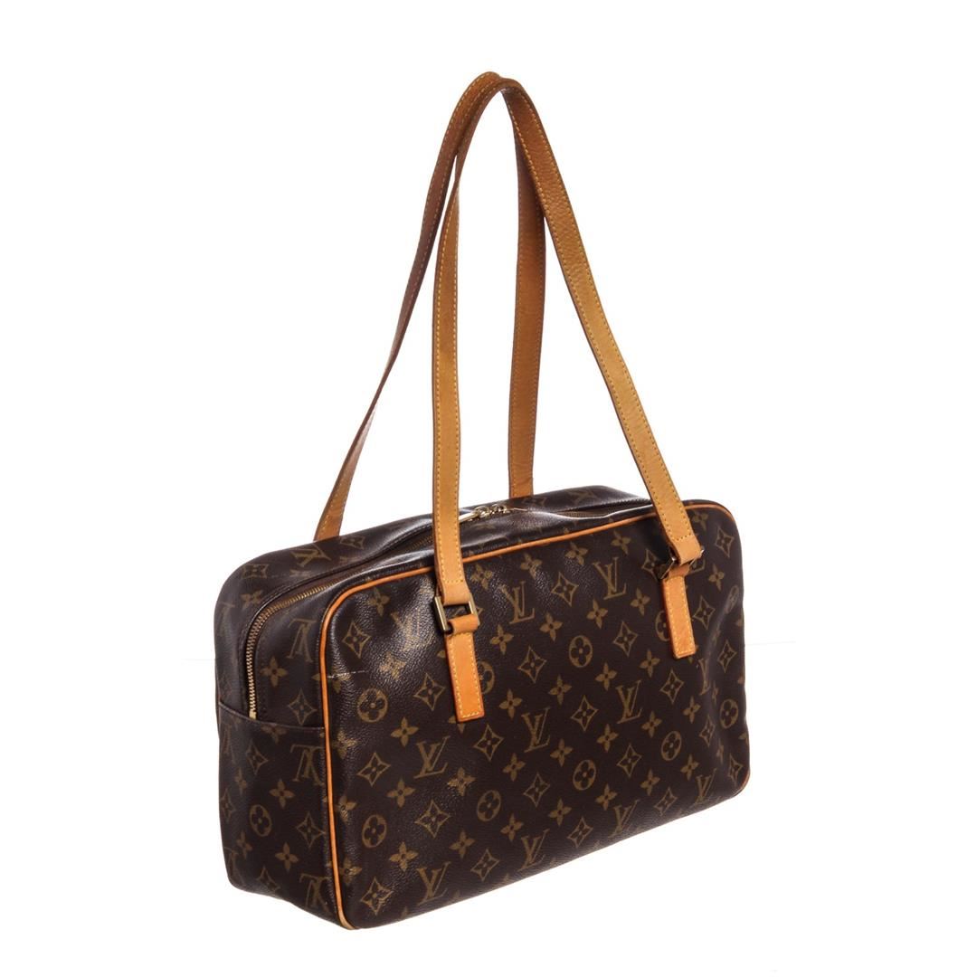 Brown and tan monogram coated canvas Louis Vuitton Cite GM with brass hardware, tan vachetta trim, single zip pocket at exterior, dual flat shoulder straps, beige Alcantara lining, three interior pockets; one with zip closure and two-way zip closure at top. Dimensions = 14"x4"x8.5"Bag Drop:11"/35.5cmx10cmx21.5cmxBag Drop:27.9cm. Item is pre-owned.