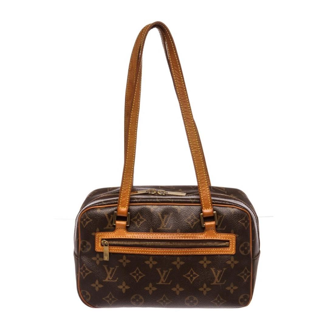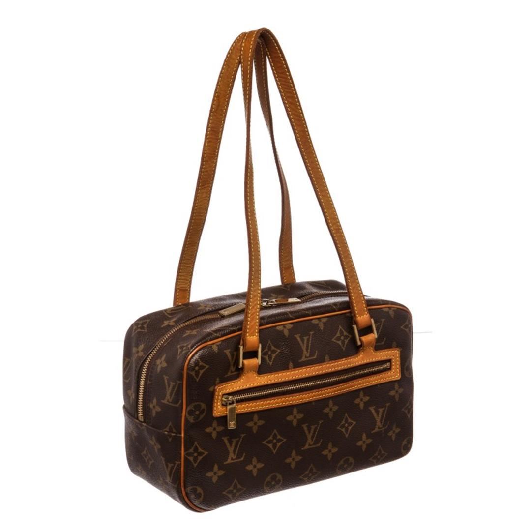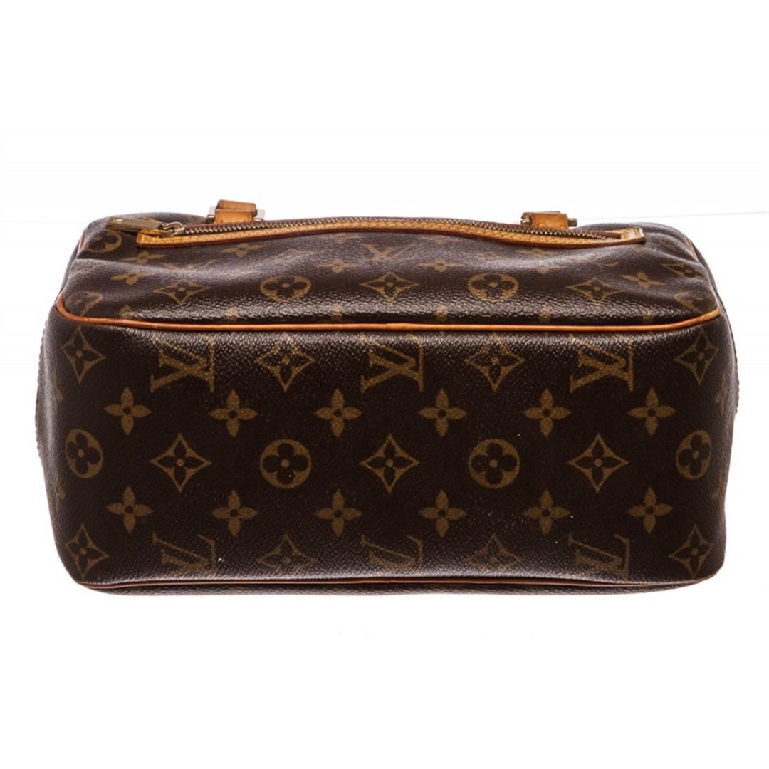 Brown and tan monogram Louis Vuitton Cite MM with brass hardware, tan vachetta leather trim, dual flat shoulder straps, exterior zip pocket at front, brown canvas lining, three pockets at interior wall and two-way zip closures at top. Item is Pre-Owned.