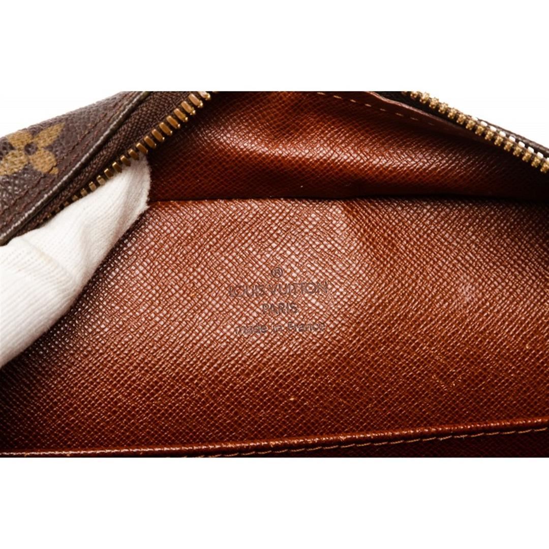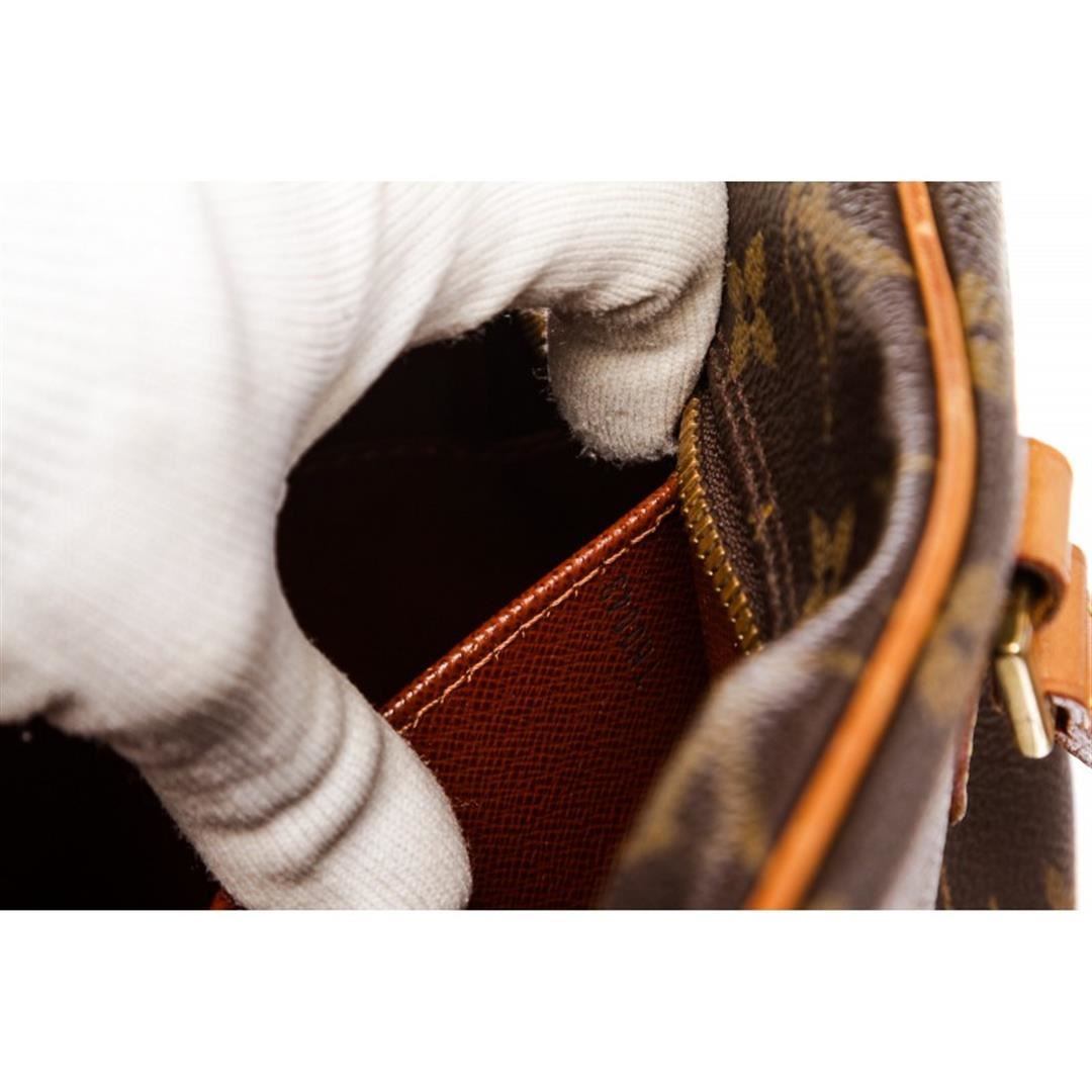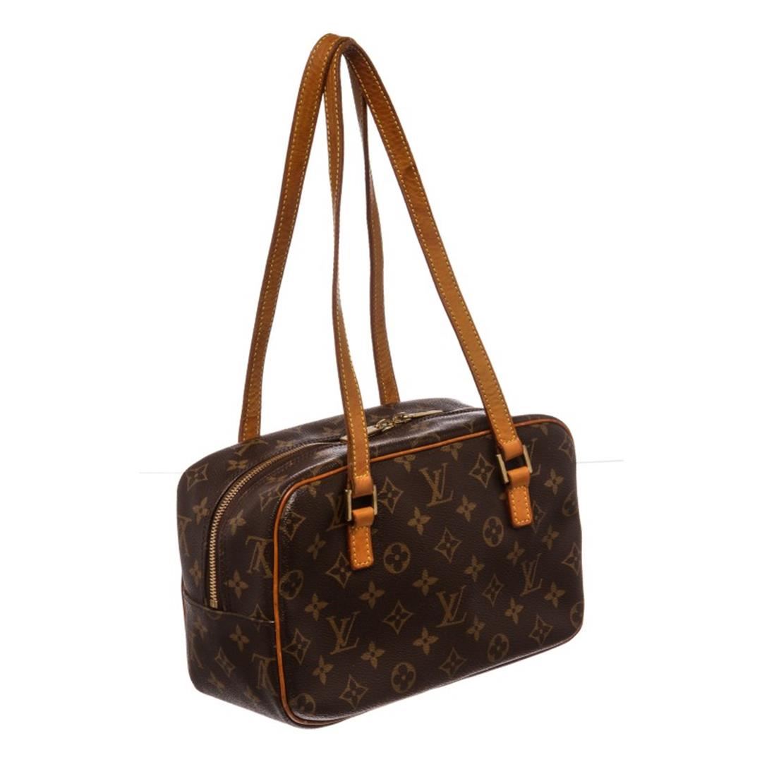 Brown and tan monogram Louis Vuitton Cite MM with brass hardware, tan vachetta leather trim, dual flat shoulder straps, exterior zip pocket at front, brown canvas lining, three pockets at interior wall and two-way zip closures at top. Item is Pre-Owned.