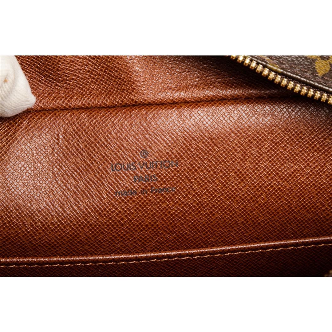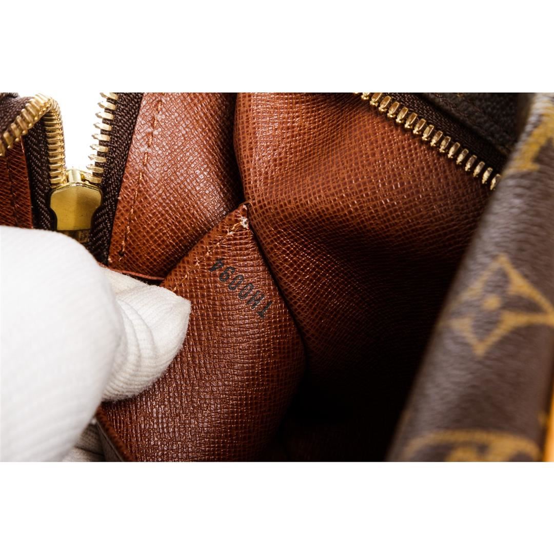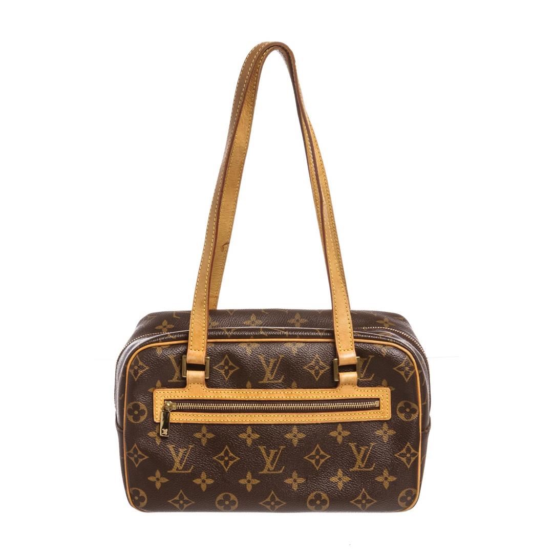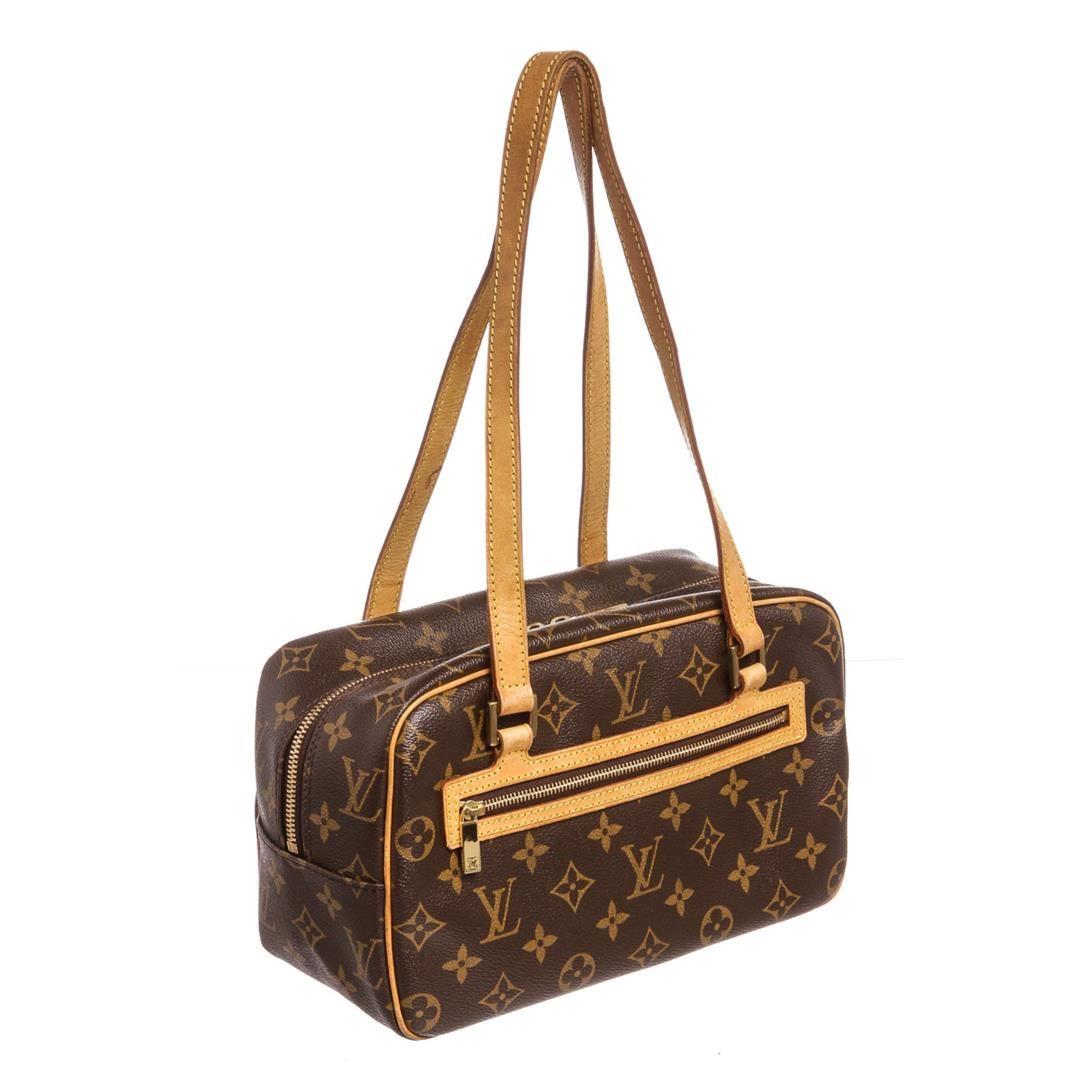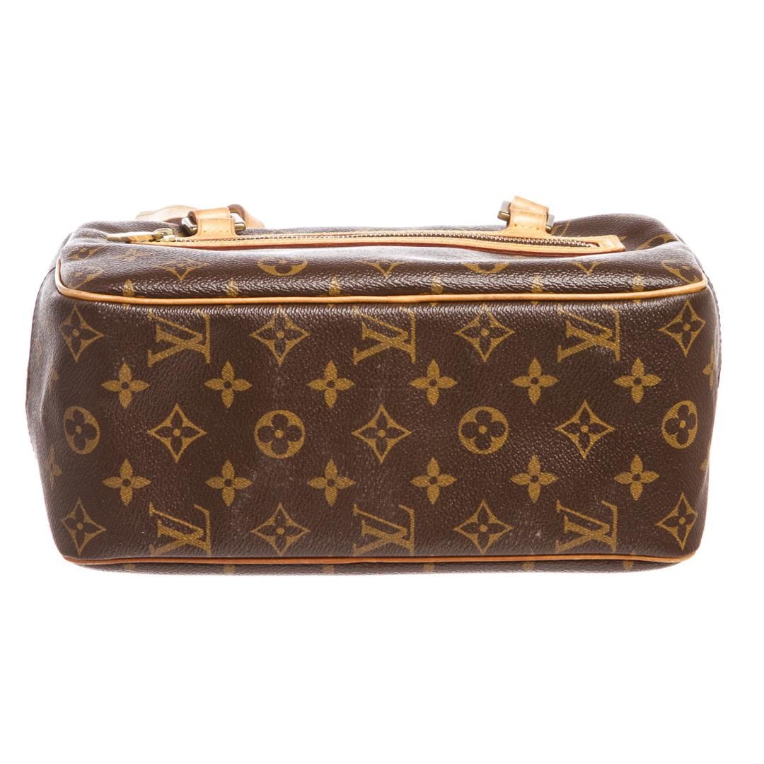 Brown and tan monogram Louis Vuitton Cite MM with brass hardware, tan vachetta leather trim, dual flat shoulder straps, exterior zip pocket at front, brown canvas lining, three pockets at interior wall and two-way zip closures at top. Item is pre-owned.