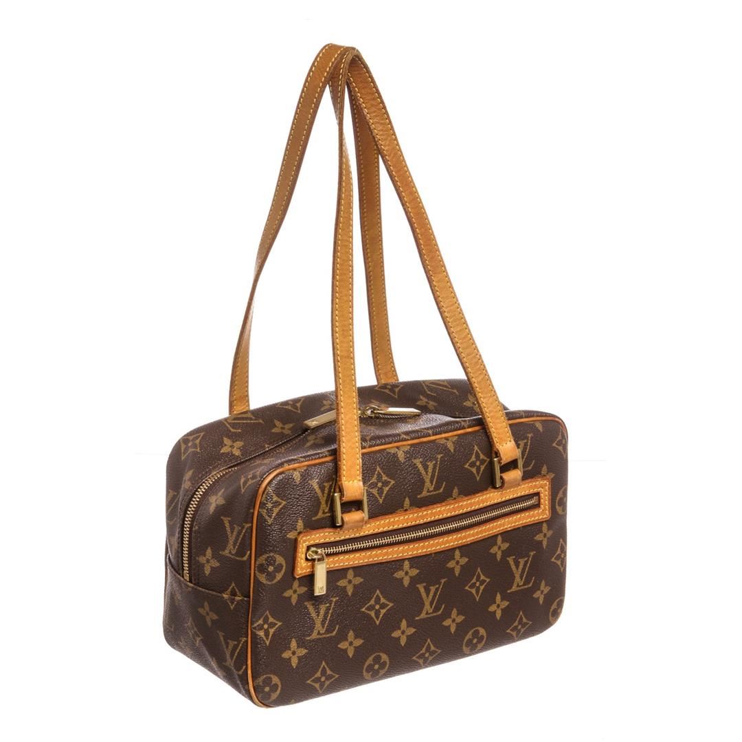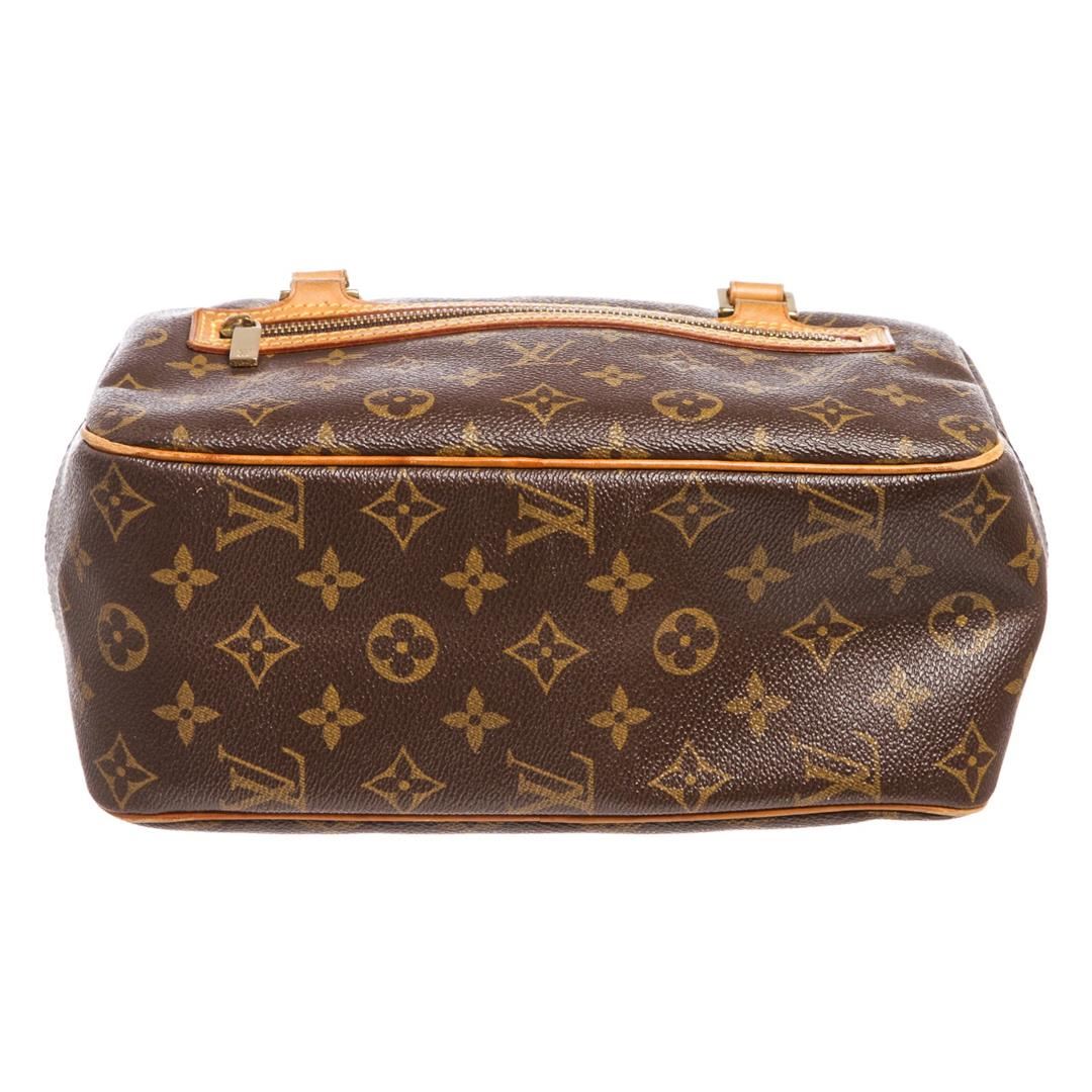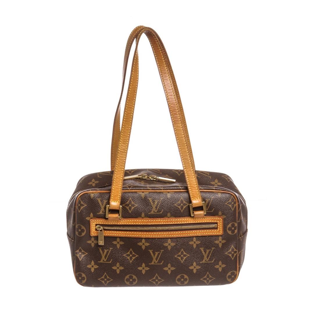 Brown and tan monogram Louis Vuitton Cite MM with brass hardware, tan vachetta leather trim, dual flat shoulder straps, exterior zip pocket at front, brown canvas lining, three pockets at interior wall and two-way zip closures at top. Item is pre-owned. Item Dimensions: 10"x4.5"x6.5"xBag Drop:9.5"/25.4cmx11.43cmx16.5cmxBag Drop:24.1cm.