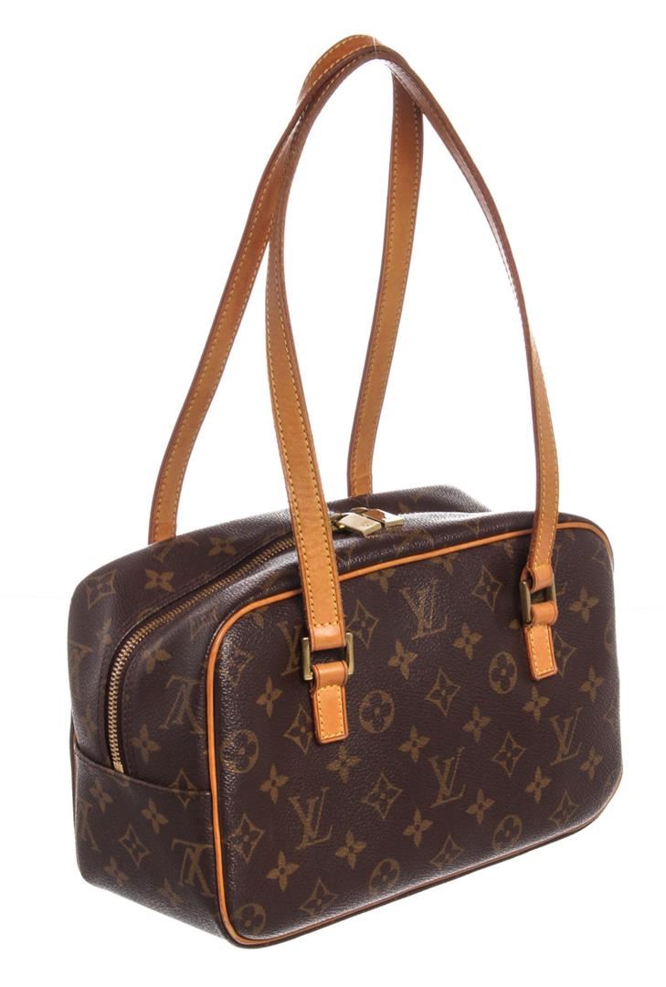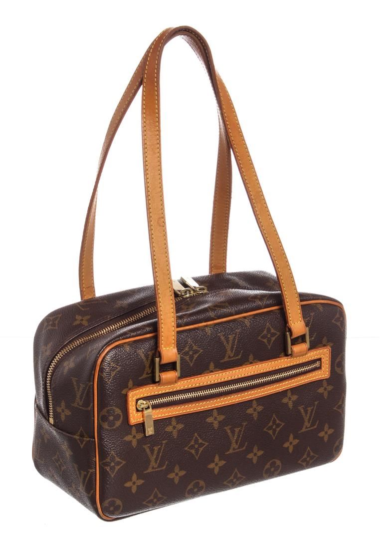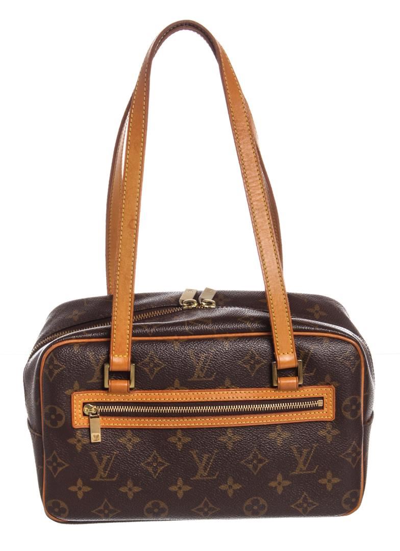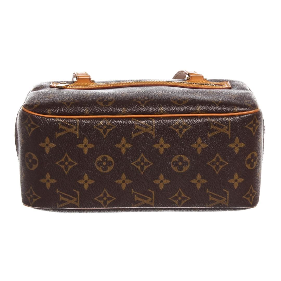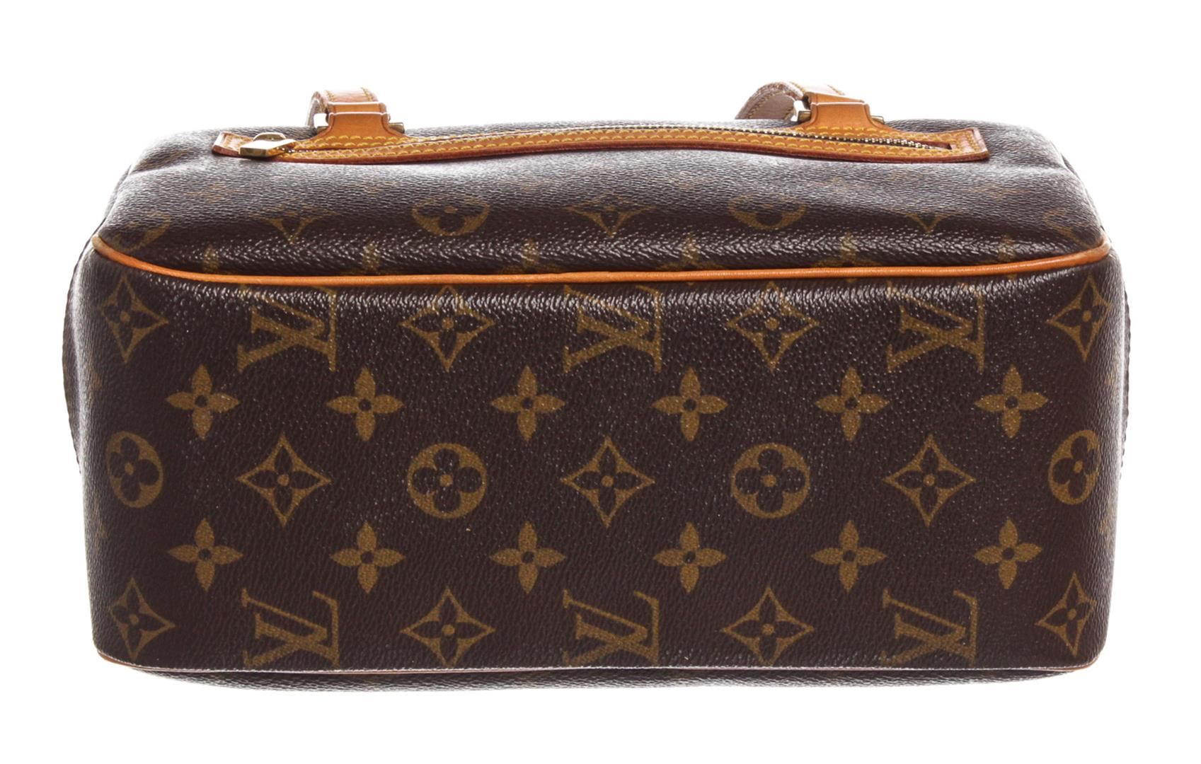 Brown and tan monogram Louis Vuitton Cite MM with brass hardware, tan vachetta leather trim, dual flat shoulder straps, exterior zip pocket at front, brown canvas lining, three pockets at interior wall and two-way zip closures at top.