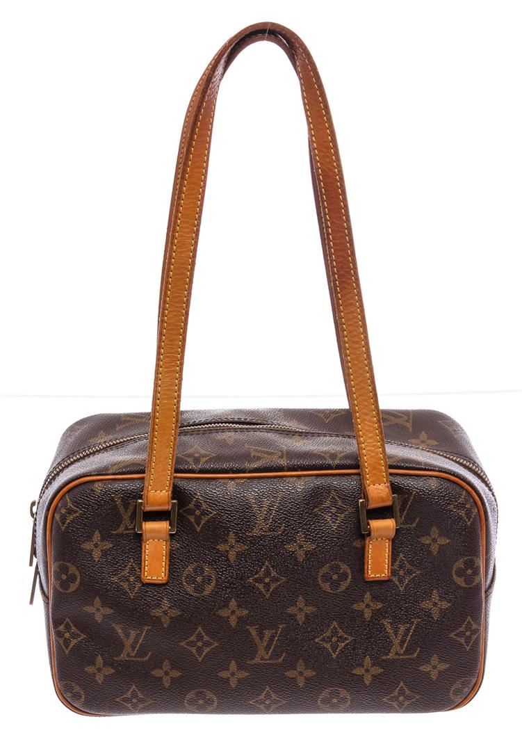 One Louis Vuitton Monogram Canvas Leather Cite MM Shoulder Bag. Brown and tan monogram Louis Vuitton Cite MM with brass hardware, tan vachetta leather trim, dual flat shoulder straps, exterior zip pocket at front, brown canvas lining, three pockets at interior wall and two-way zip closures at top.