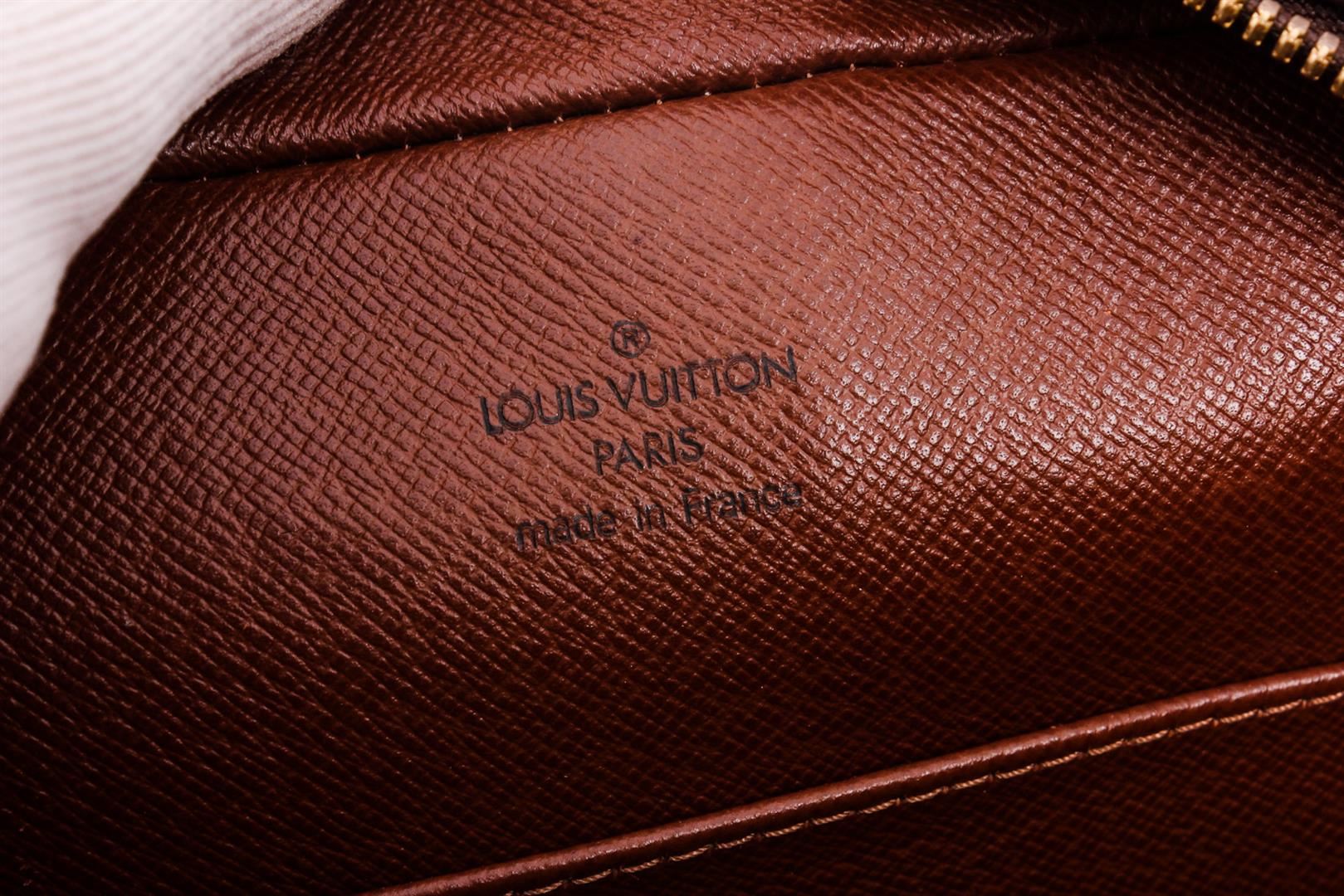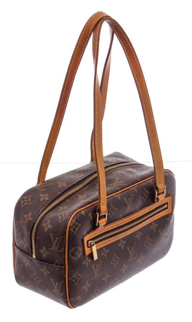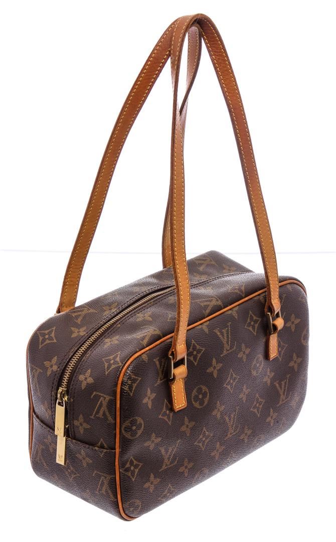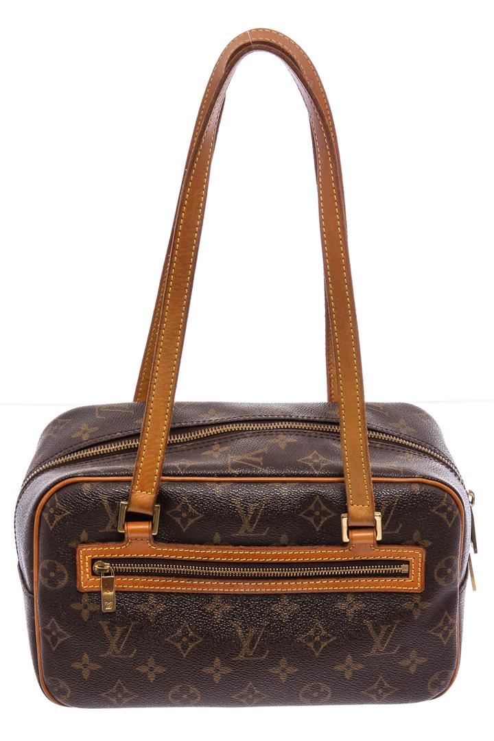 One Louis Vuitton Monogram Canvas Leather Cite MM Shoulder Bag. Brown and tan monogram Louis Vuitton Cite MM with brass hardware, tan vachetta leather trim, dual flat shoulder straps, exterior zip pocket at front, brown canvas lining, three pockets at interior wall and two-way zip closures at top.