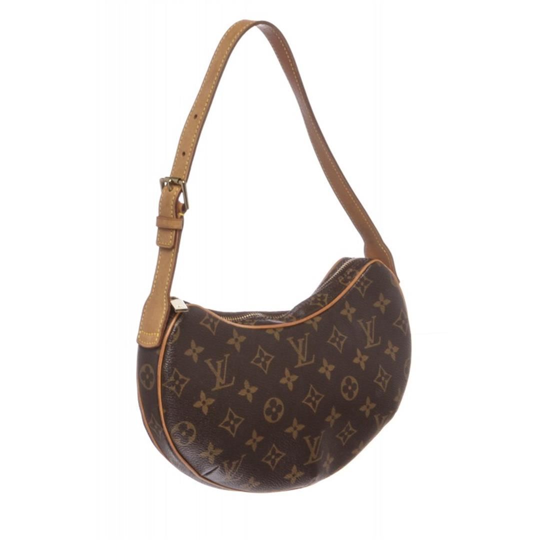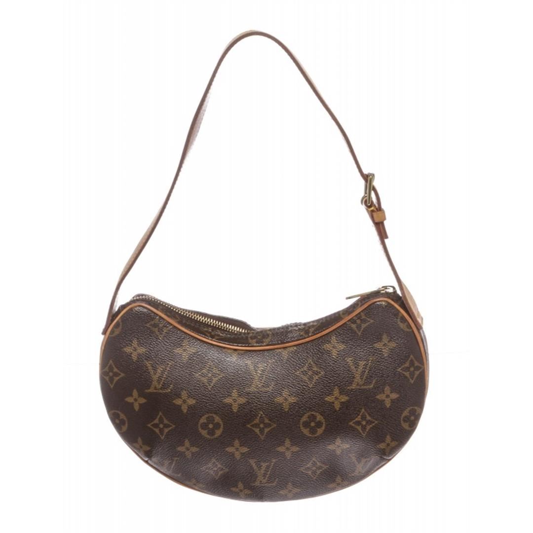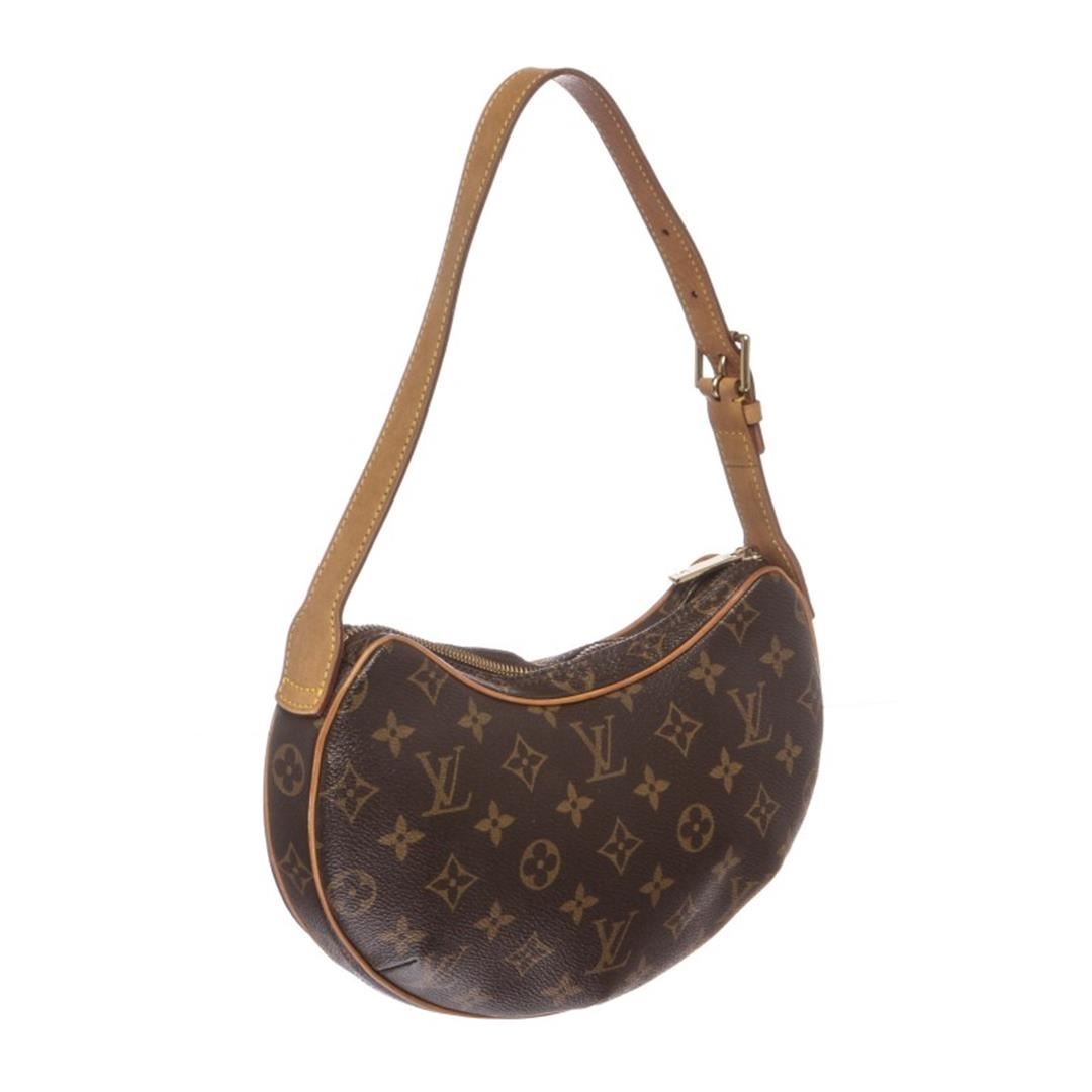 Brown and tan coated canvas Louis Vuitton Croissant PM with brass hardware, tan vachetta leather accents throughout, single flat shoulder strap, red Alcantara interior, singleit pocket at interior wall and zip closure at top. Item is pre-owned.