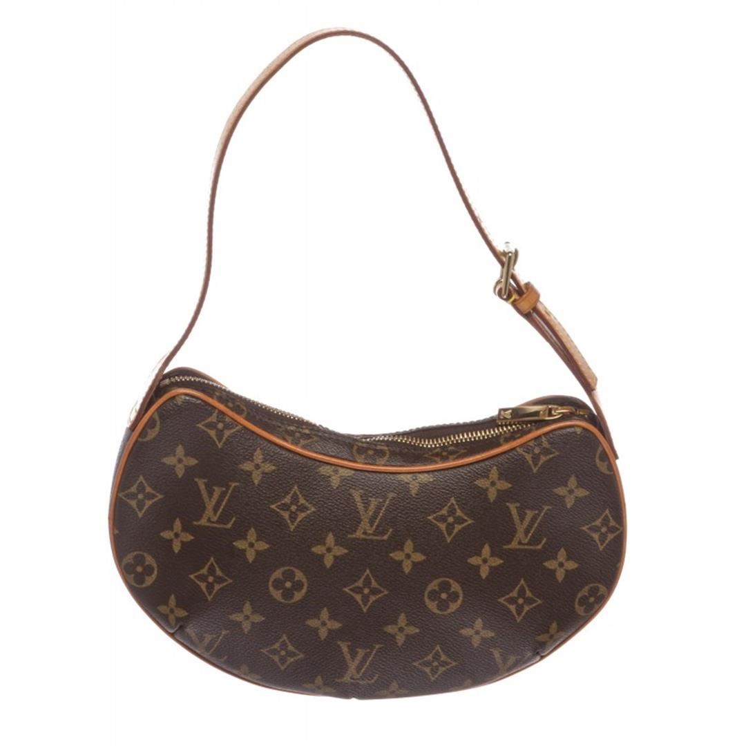 Brown and tan coated canvas Louis Vuitton Croissant PM with brass hardware, tan vachetta leather accents throughout, single flat shoulder strap, red Alcantara interior, singleit pocket at interior wall and zip closure at top. Item is pre-owned.