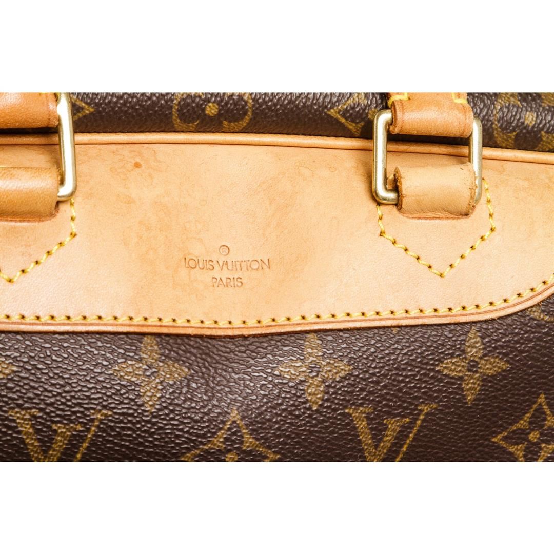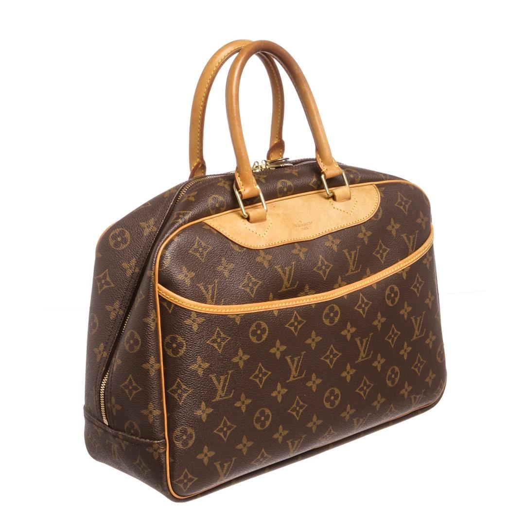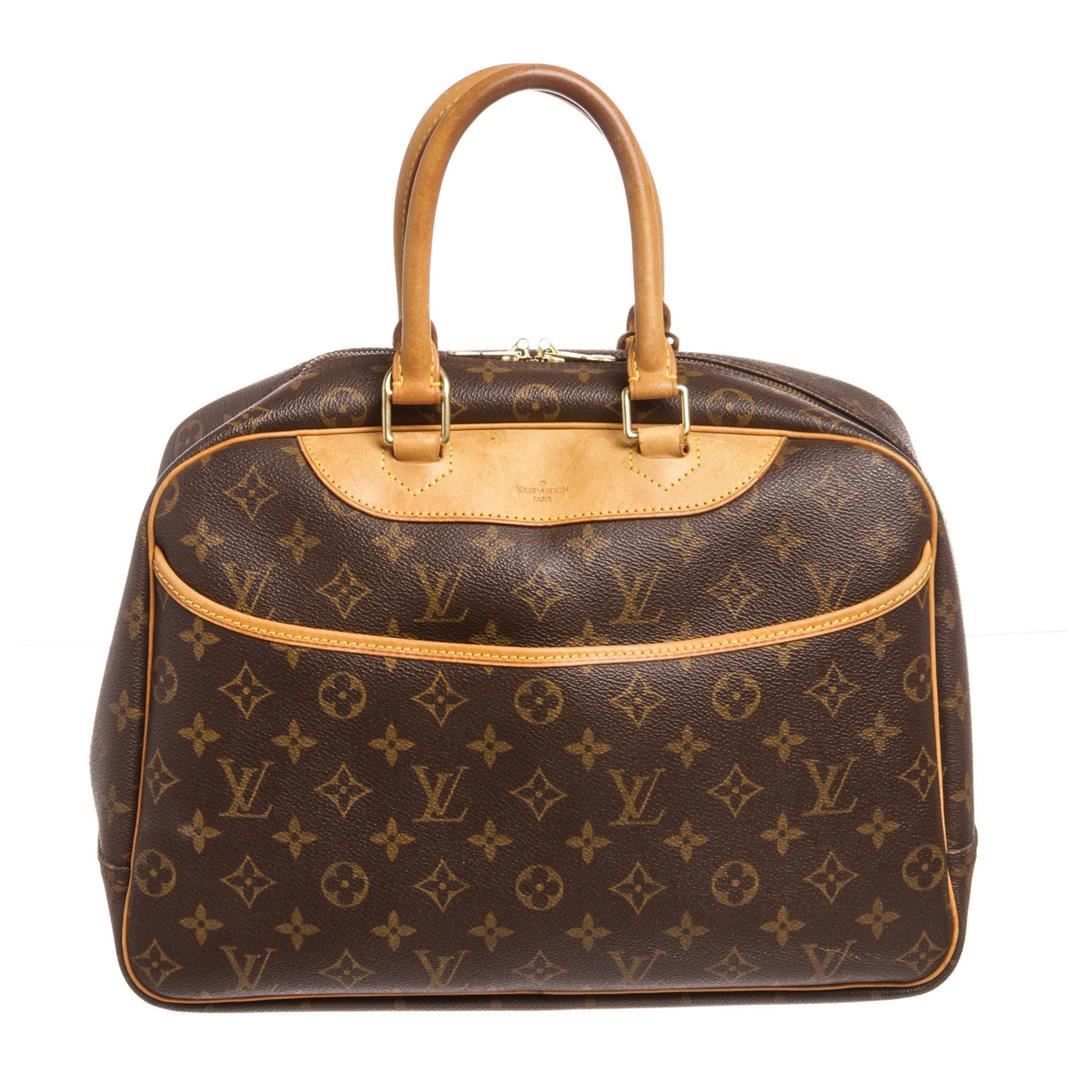 Brown and tan monogram coated canvas Louis Vuitton Deauville Bag with brass hardware, tan vachetta leather lining, dual rolled handles, single open compartment at exterior front, creme canvas lining, four open pockets at interior wall and two-way zip clos